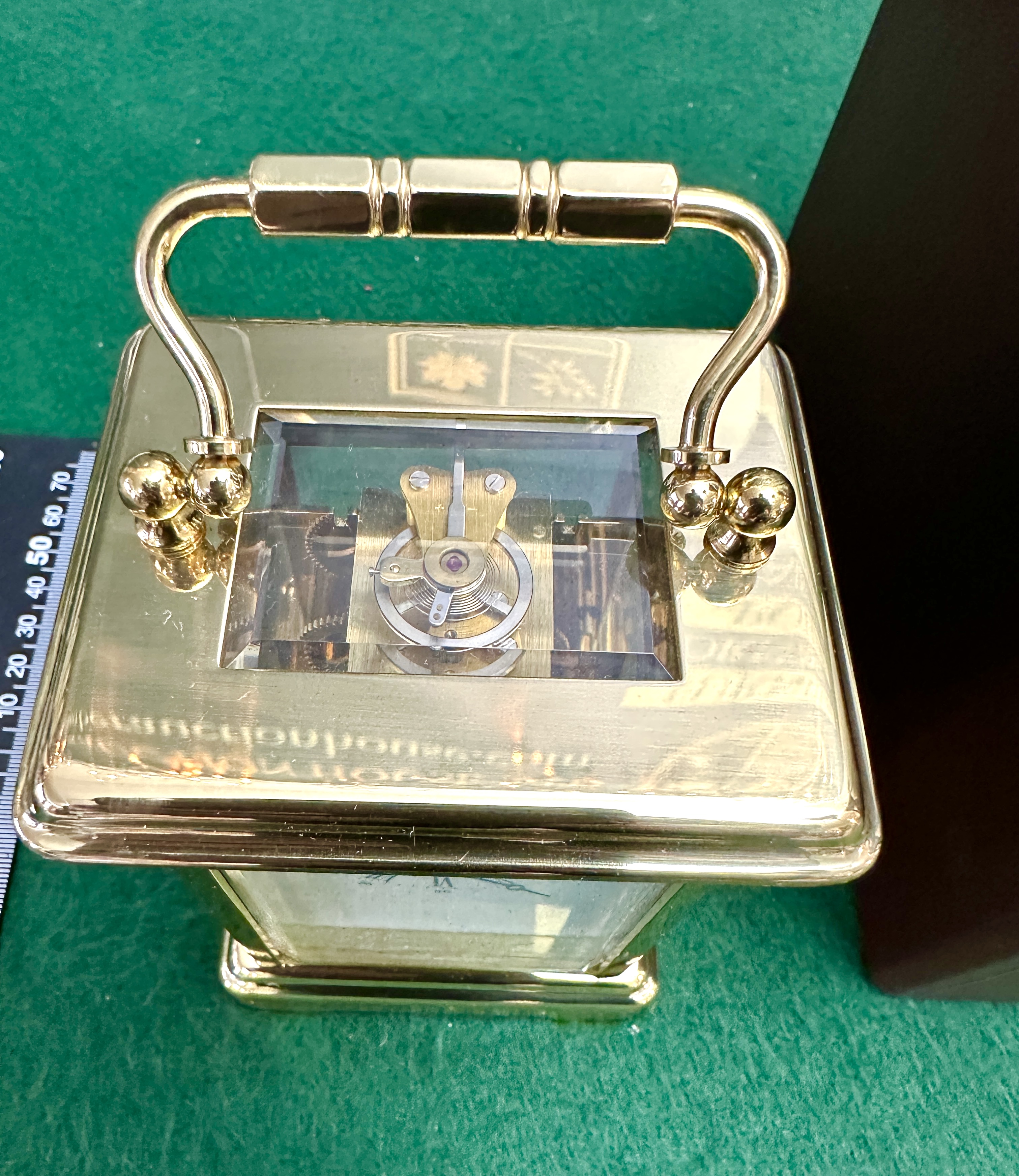 The clock is in good, clean condition. The brass case shows minor surface wear and light oxidation consistent with handling. The glass panels are intact without visible chips or cracks.