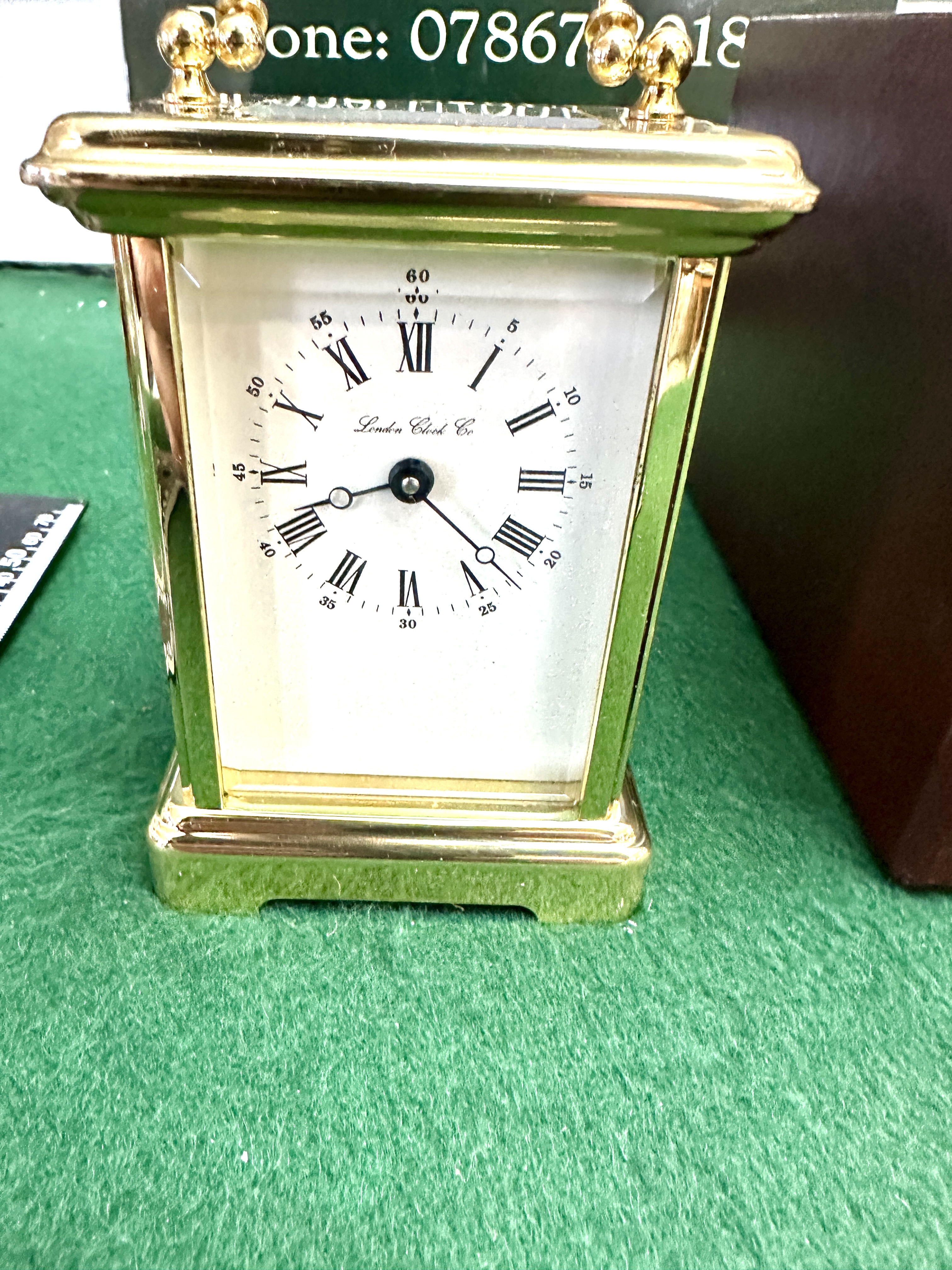 A polished brass carriage clock by the London Clock Co. The timepiece is constructed with a rectangular brass case featuring bevelled glass panels to the front, sides, and rear. The white dial displays black Roman numeral hour markers, an outer track of Arabic numeral minute markers, and is signed London Clock Co. below the centre. The top of the case contains a rectangular viewing window revealing the mechanical escapement. The clock is equipped with a hinged carrying handle and is accompanied by a brown presentation box with light blue foam padding.