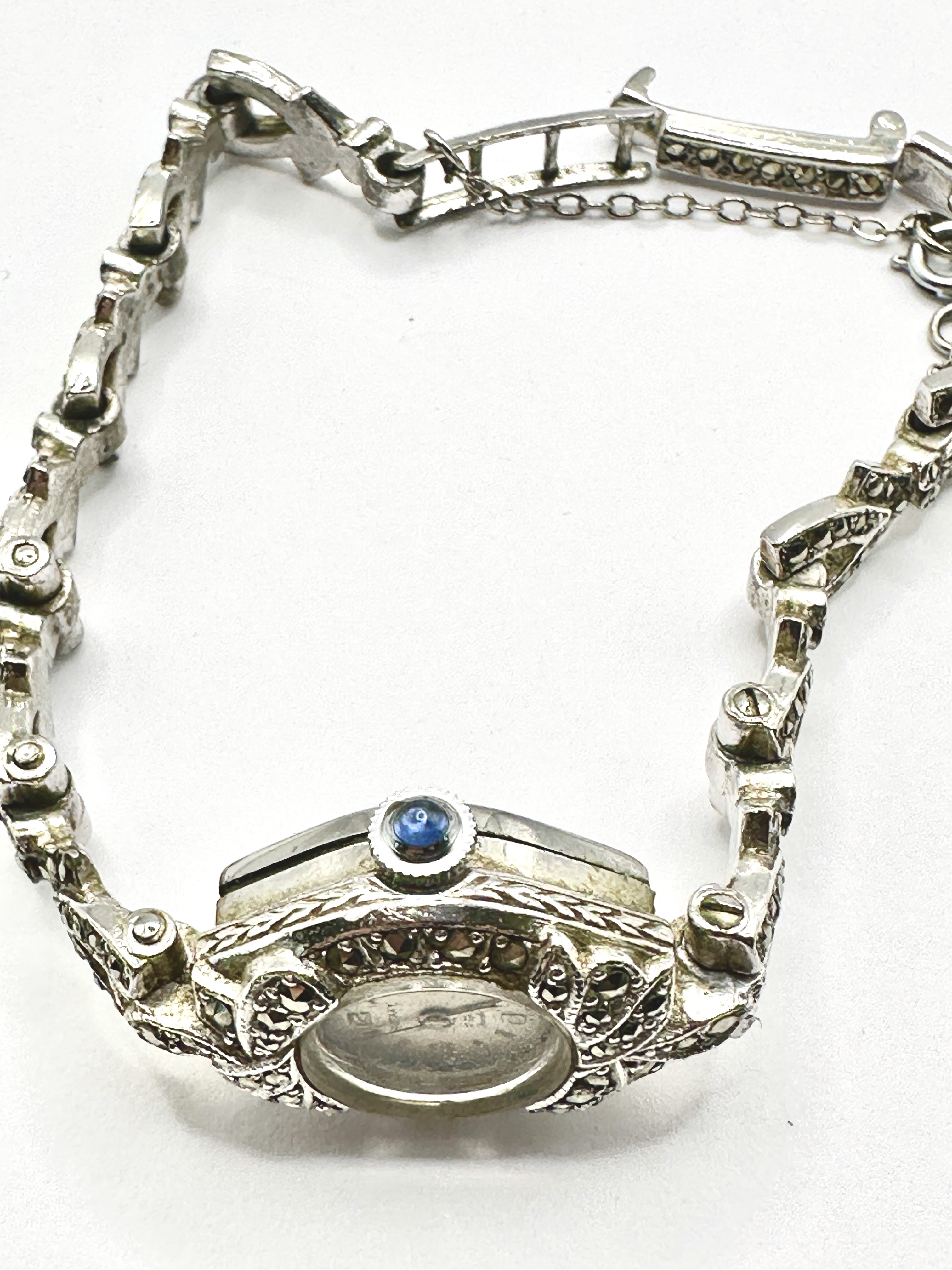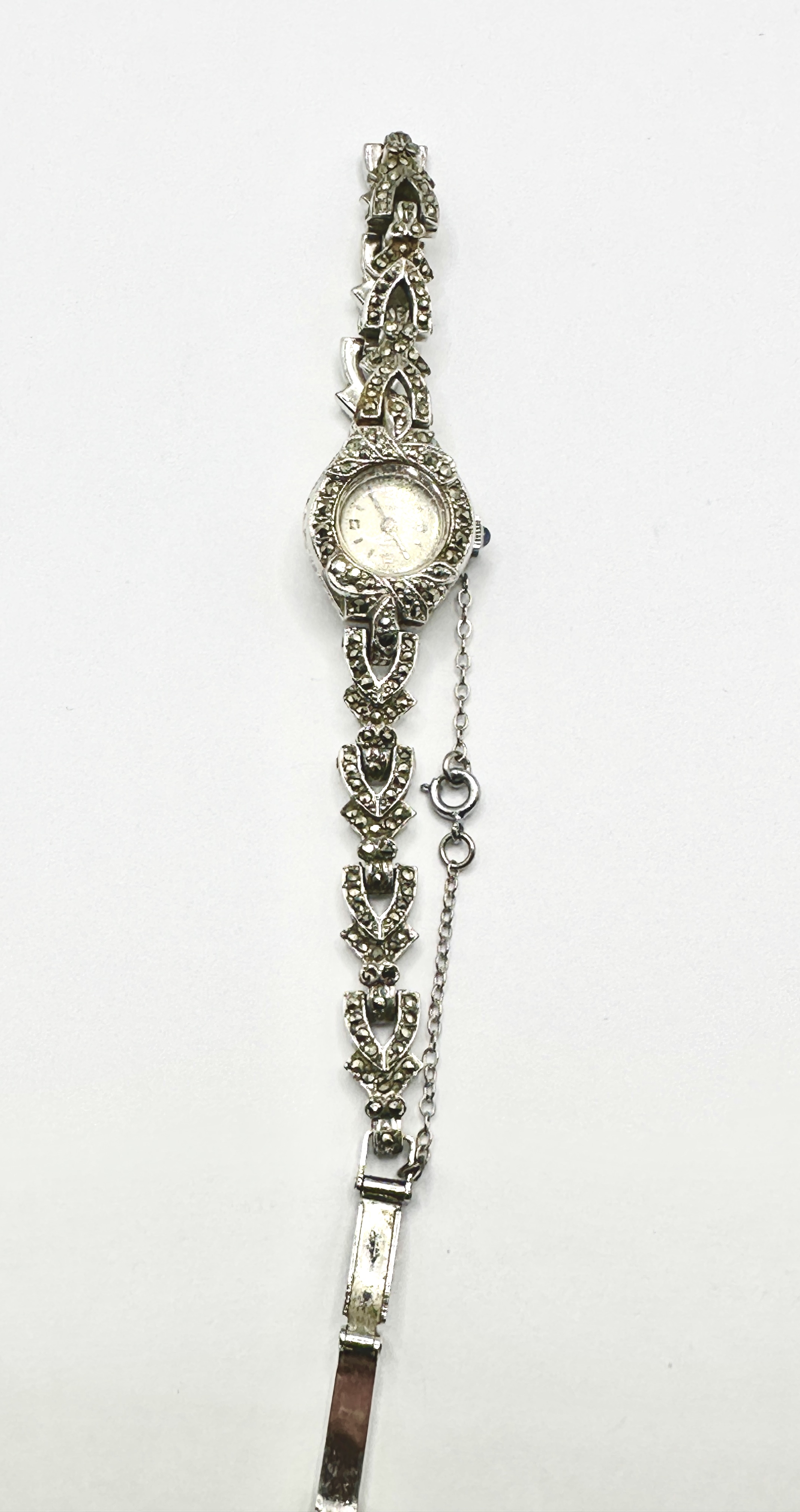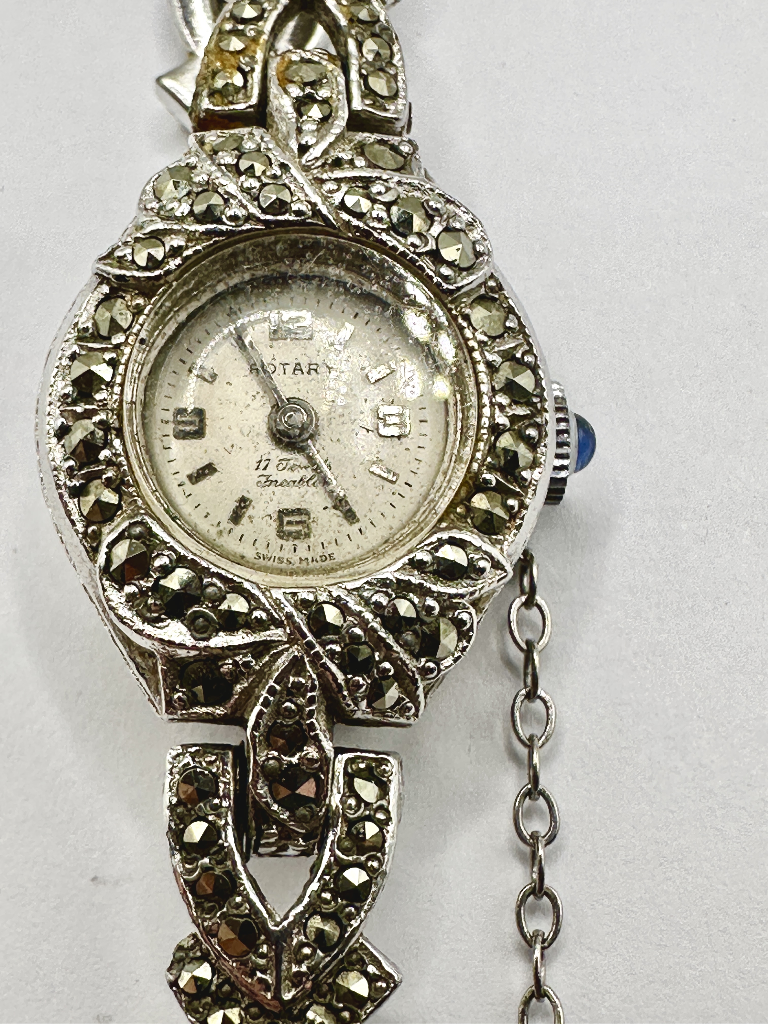 A vintage ladies’ Rotary cocktail wristwatch of mid-century Art Deco design. The silver-tone metal case and integrated articulated link bracelet are extensively embellished with marcasite stones in ornate scroll and geometric patterns. The round white dial is signed Rotary, 17 Jewels Incabloc, and Swiss Made, featuring Arabic numerals at the 12, 3, 6, and 9 positions with dot hour markers and sword-style hands. The watch is fitted with a blue cabochon-set crown and a marcasite-set fold-over clasp with an attached safety chain.
