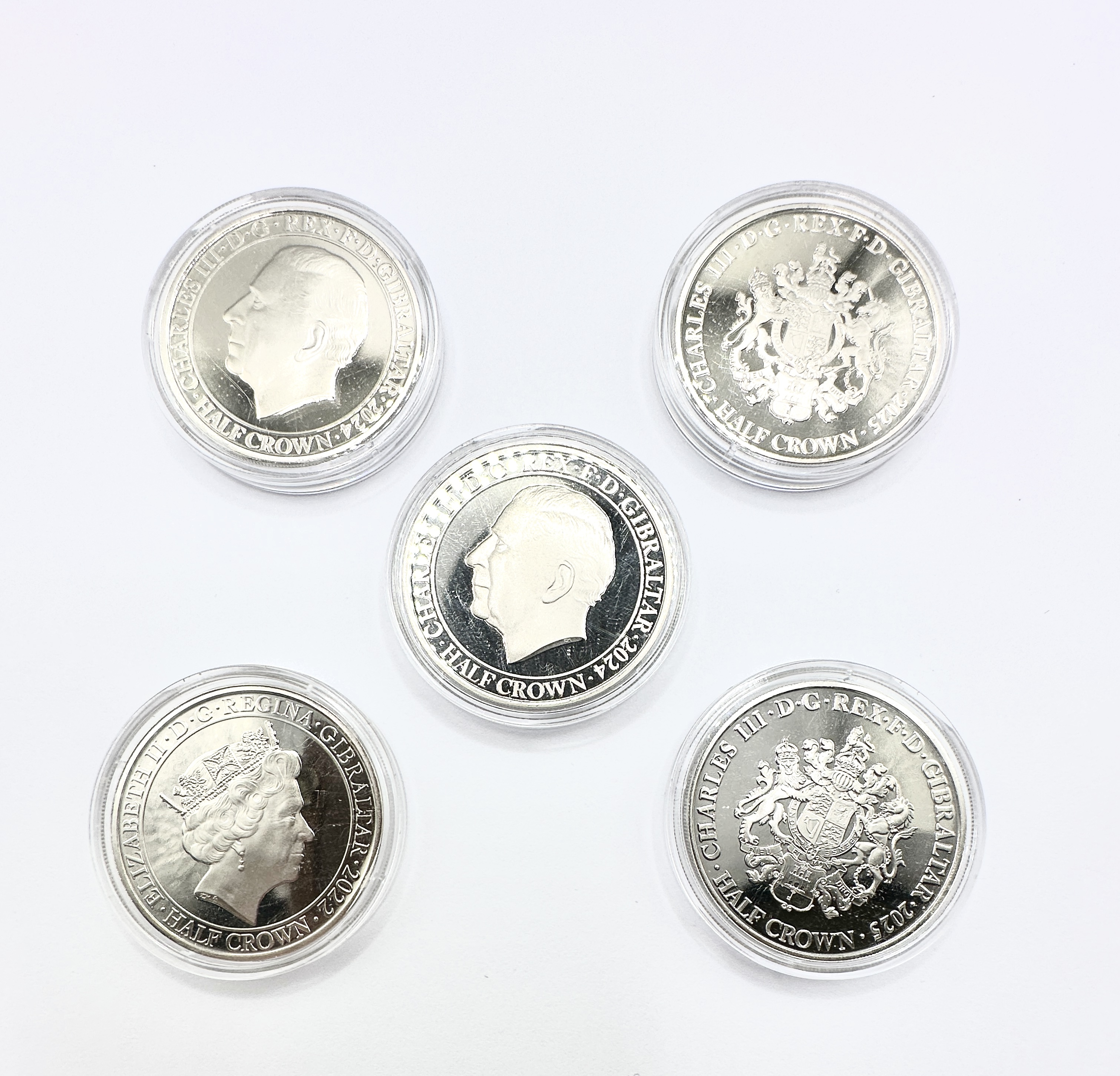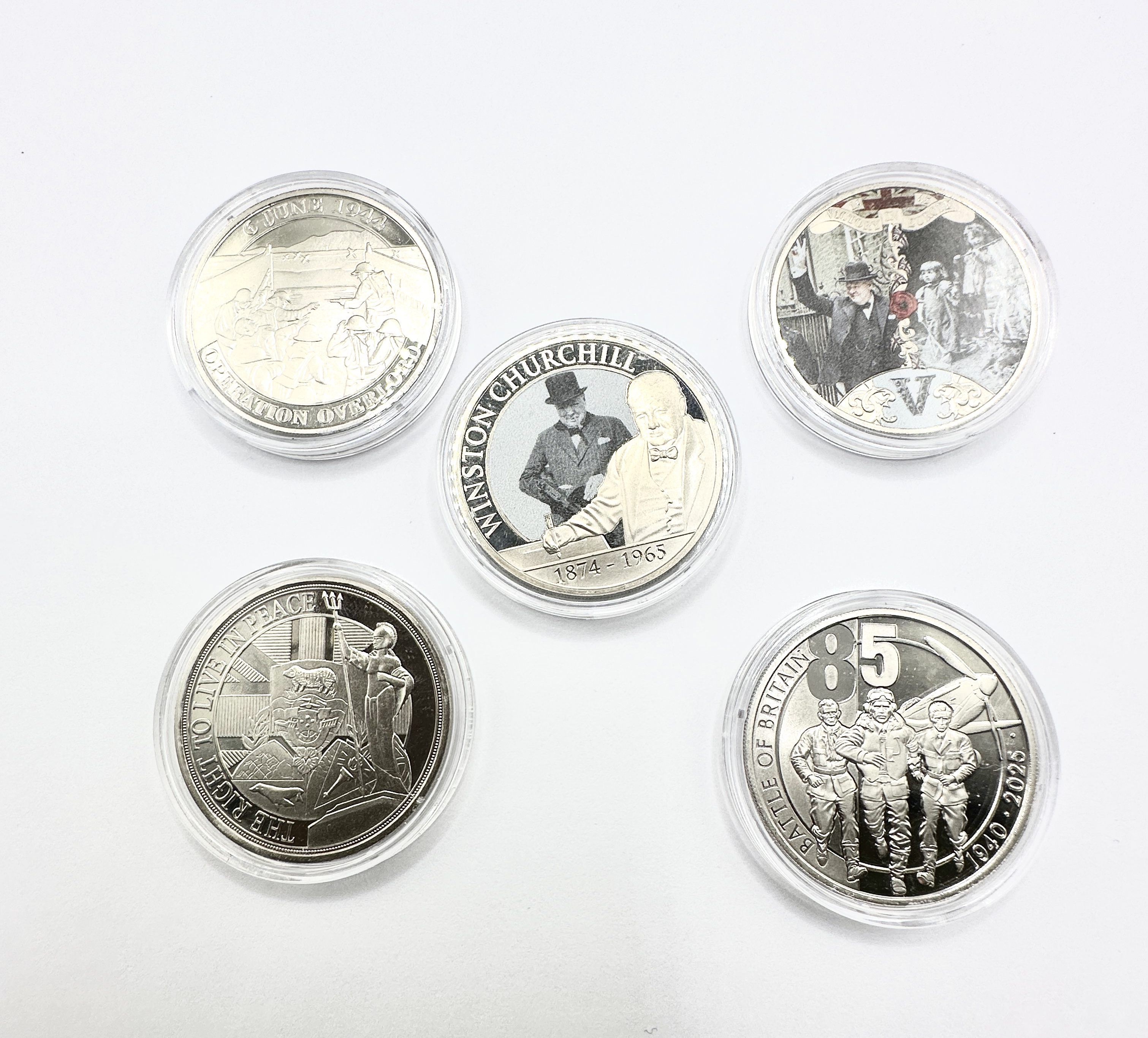 A collection of Gibraltar commemorative half-crown coins struck in white metal. The group includes issues honouring Winston Churchill (1874-1965), the 85th anniversary of the Battle of Britain (1940-2025), and Operation Overlord (6 June 1944), alongside a peace-themed issue inscribed The Right to Live in Peace. The obverses feature the effigies of Queen Elizabeth II and King Charles III. The reverses display various military and historical motifs, including examples with photographic elements and selective colouration. Mintage dates observed include 2022, 2024, and 2025. Each coin is struck with a proof-like finish.