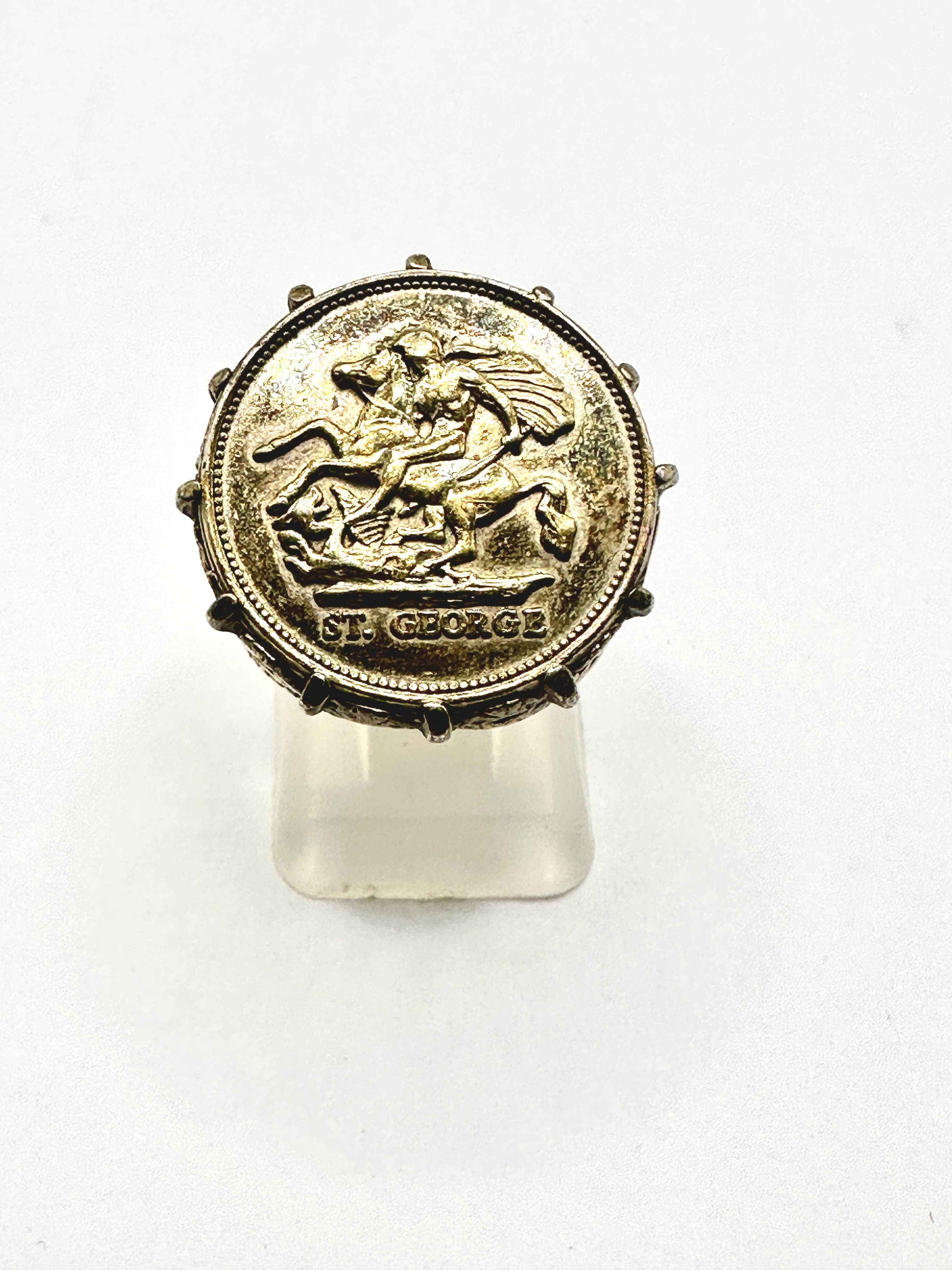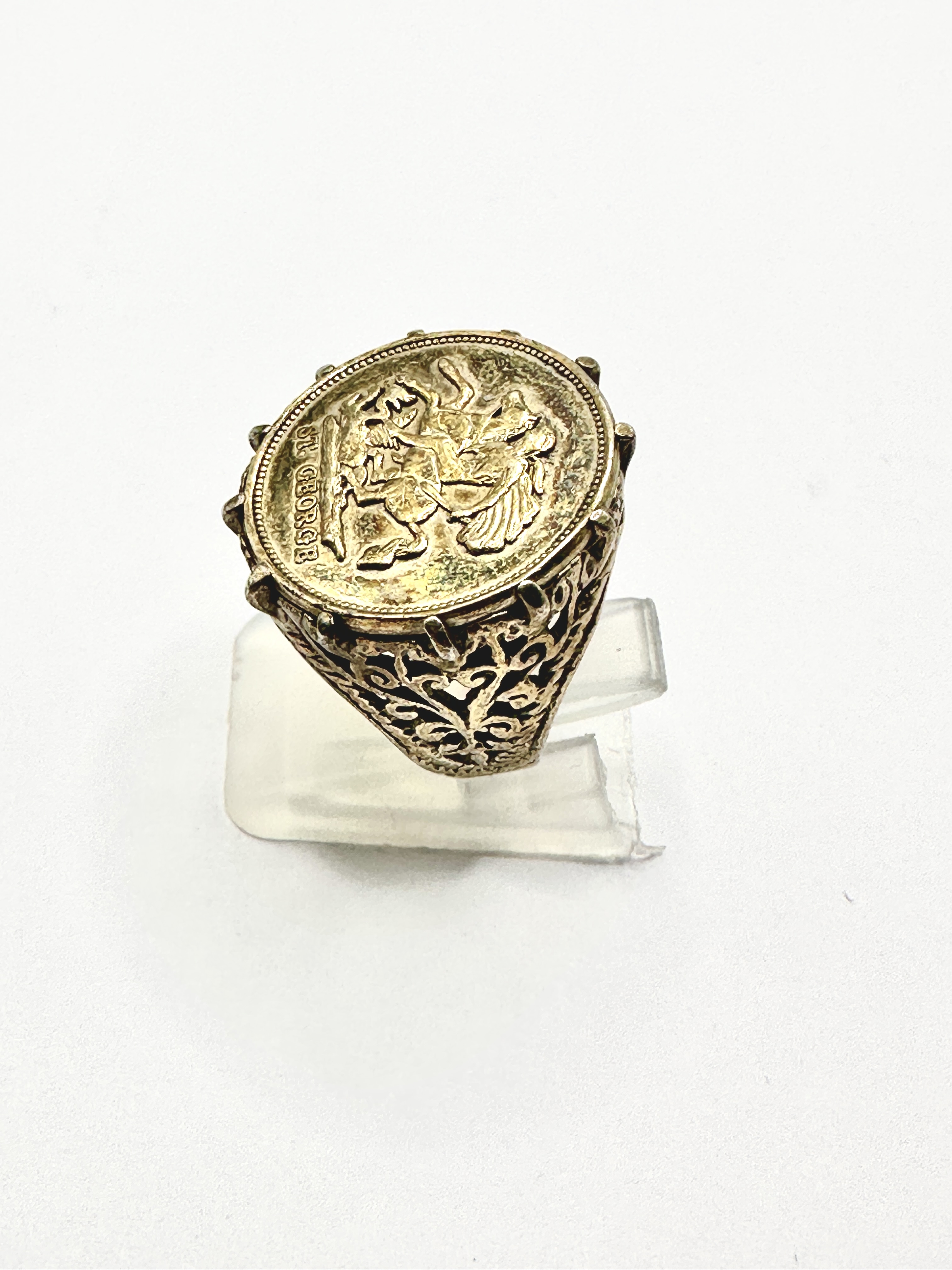 A signet-style ring featuring a circular medallion depicting Saint George and the Dragon in relief. The medallion is inscribed ST. GEORGE at the base and is mounted within a decorative pronged setting. The shoulders are ornamented with openwork filigree and foliate motifs, leading to a solid tapering shank. The item is composed of white metal with a gold-toned surface finish.