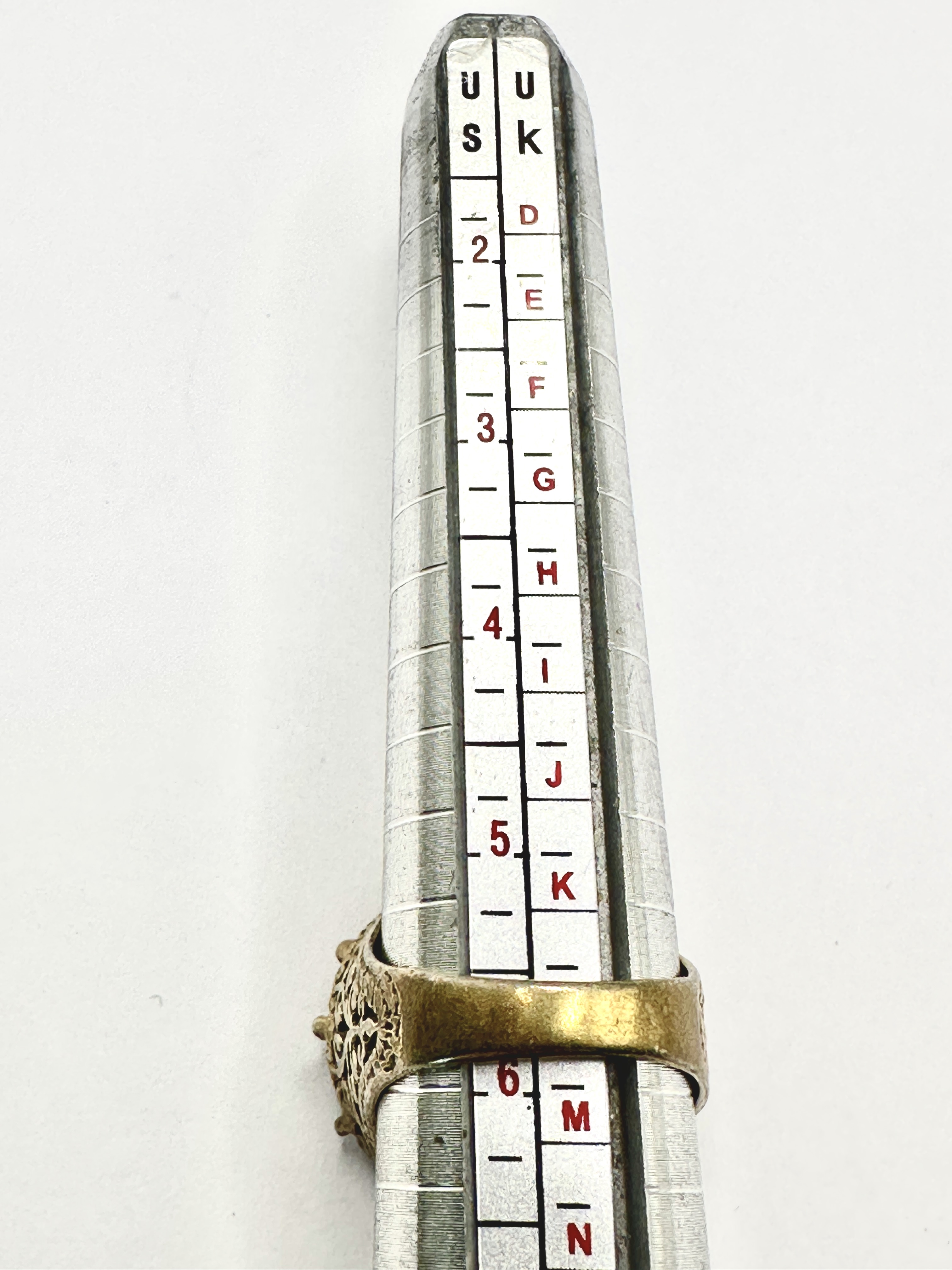 Visible surface tarnish and wear to the gold-toned finish throughout, revealing the white metal base. General signs of age-appropriate handling.
