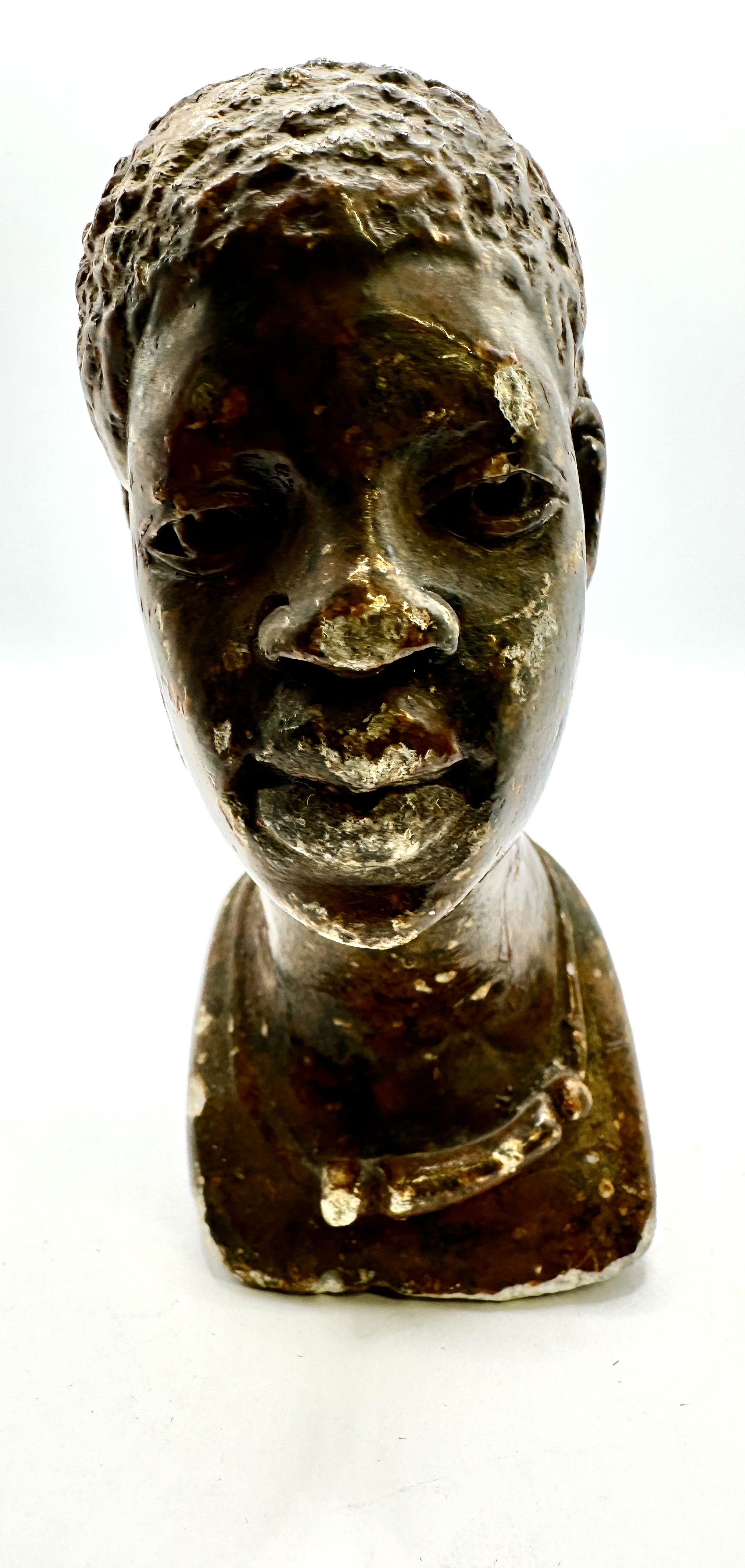 The sculpture exhibits significant surface wear, including scattered chips and losses to the surface finish and underlying material. Notable areas of loss are present on the nose, lips, chin, neck, and the edges of the base.