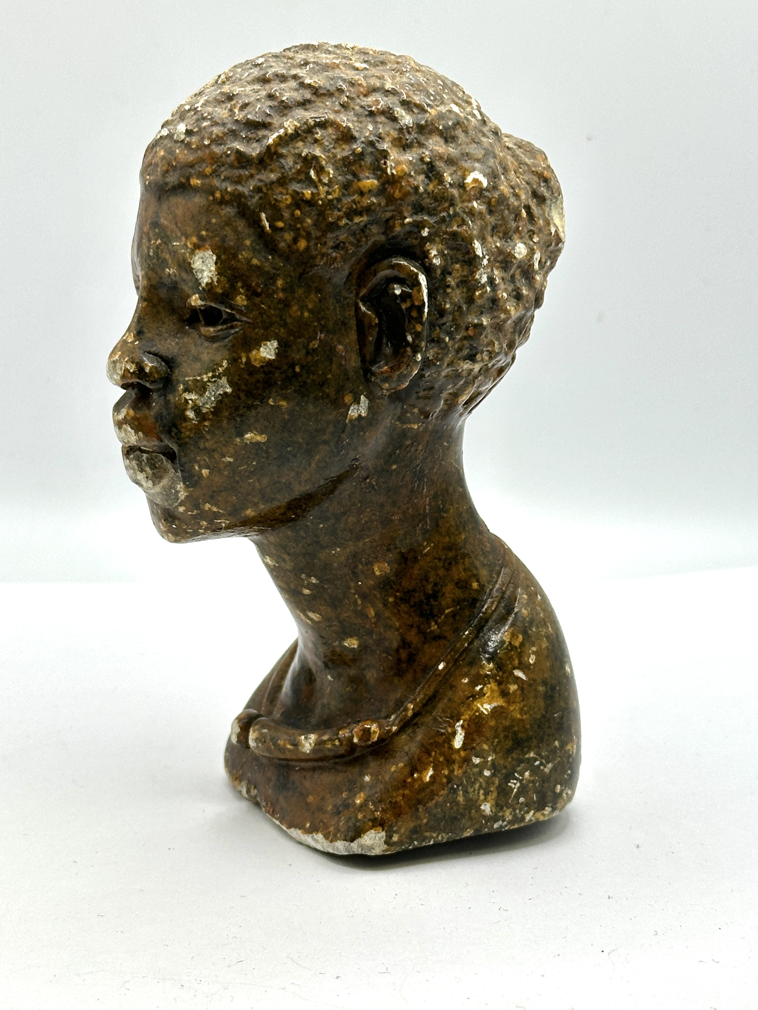 A carved stone bust in the Shona tradition depicting a figure of African descent. The sculpture features a mottled brown colour with textured hair and a simple rounded necklace detail at the collar. The work is set on an integrated rectangular base. No artist marks or signatures are visible.