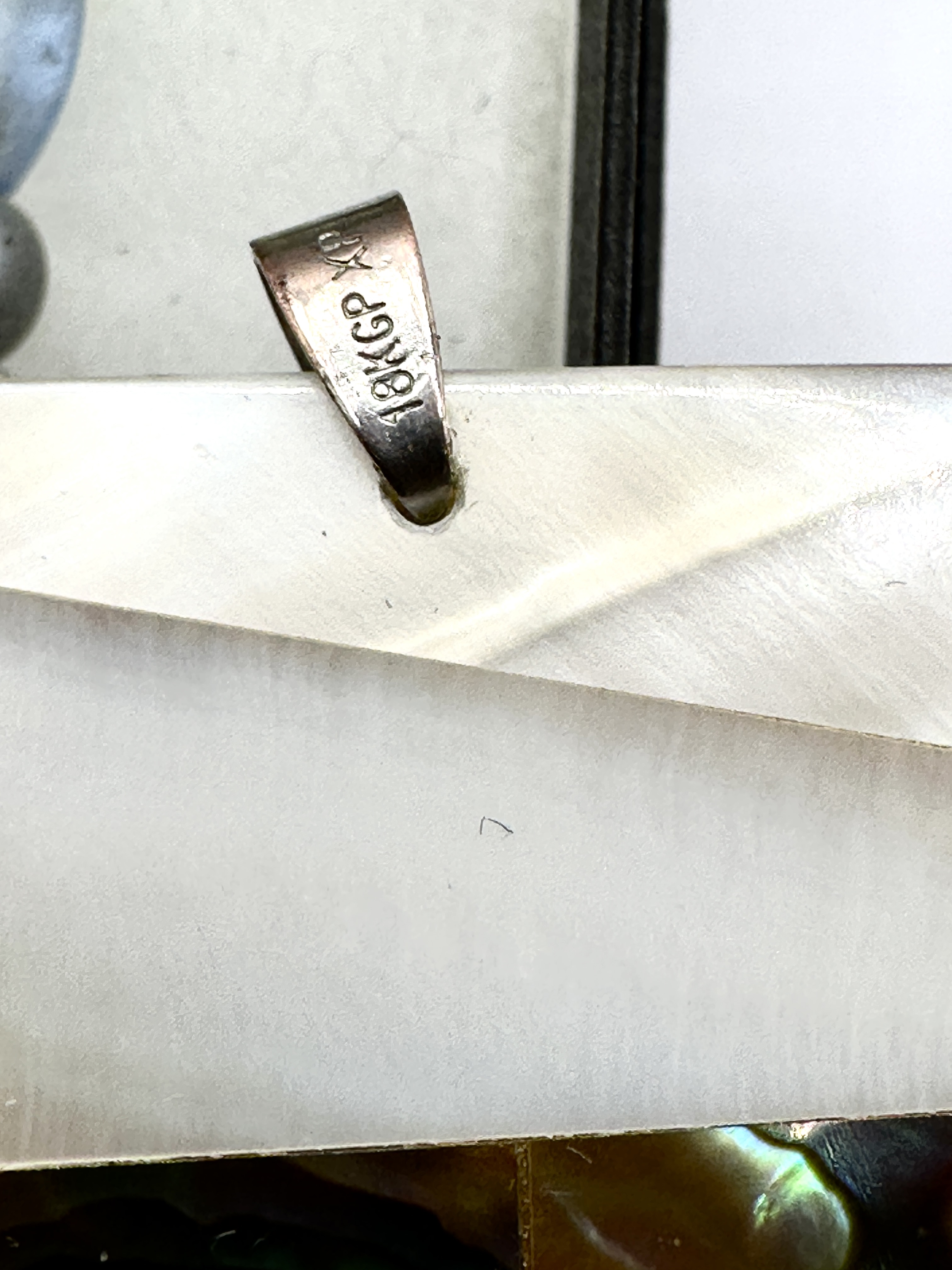 A collection of contemporary jewellery featuring a multi-strand beaded necklace and two large shell pendants. The necklace is composed of various glass and stone-like beads in shades of blue, green, and clear, interspersed with silver-tone decorative spacers. It is accompanied by a card identifying the piece as Hand Made at Thoresby. The first pendant is an oversized almond-shaped piece featuring a geometric inlay design of white mother-of-pearl. The second pendant is rectangular with a white mother-of-pearl inlay accented by a horizontal band of iridescent abalone shell. The metal bail on the rectangular pendant is stamped 18KGP XP, indicating 18-karat gold plating. The items are presented in a black presentation box.