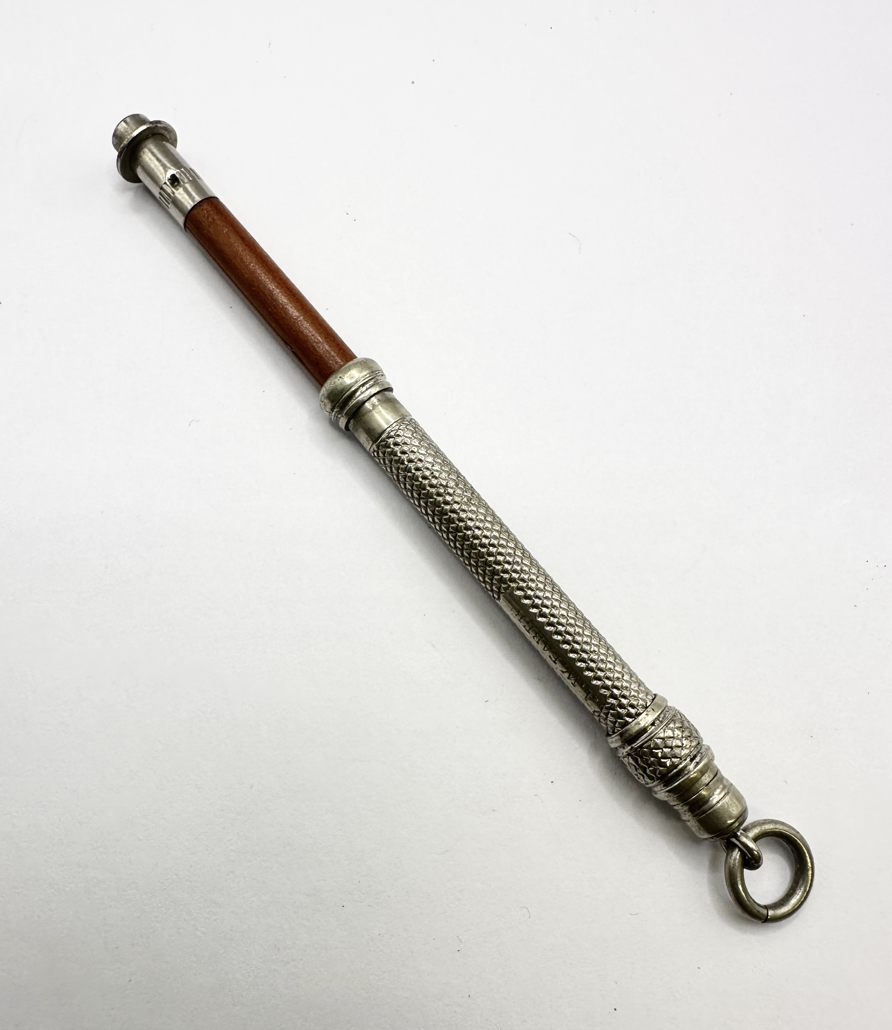 A Victorian mechanical pencil holder by the renowned maker S. Mordan and Co. The piece is constructed from white metal and features a detailed engine-turned hobnail pattern across the cylindrical barrel. A smooth vertical reserve on the textured surface is stamped with the maker’s mark S. MORDAN and CO. The item is designed for suspension from a chatelaine or watch chain, featuring a circular jump ring at the terminal. The holder comprises two distinct parts: a decorative outer sleeve and a removable wooden-cased pencil insert, which is finished with a matching white metal finial.