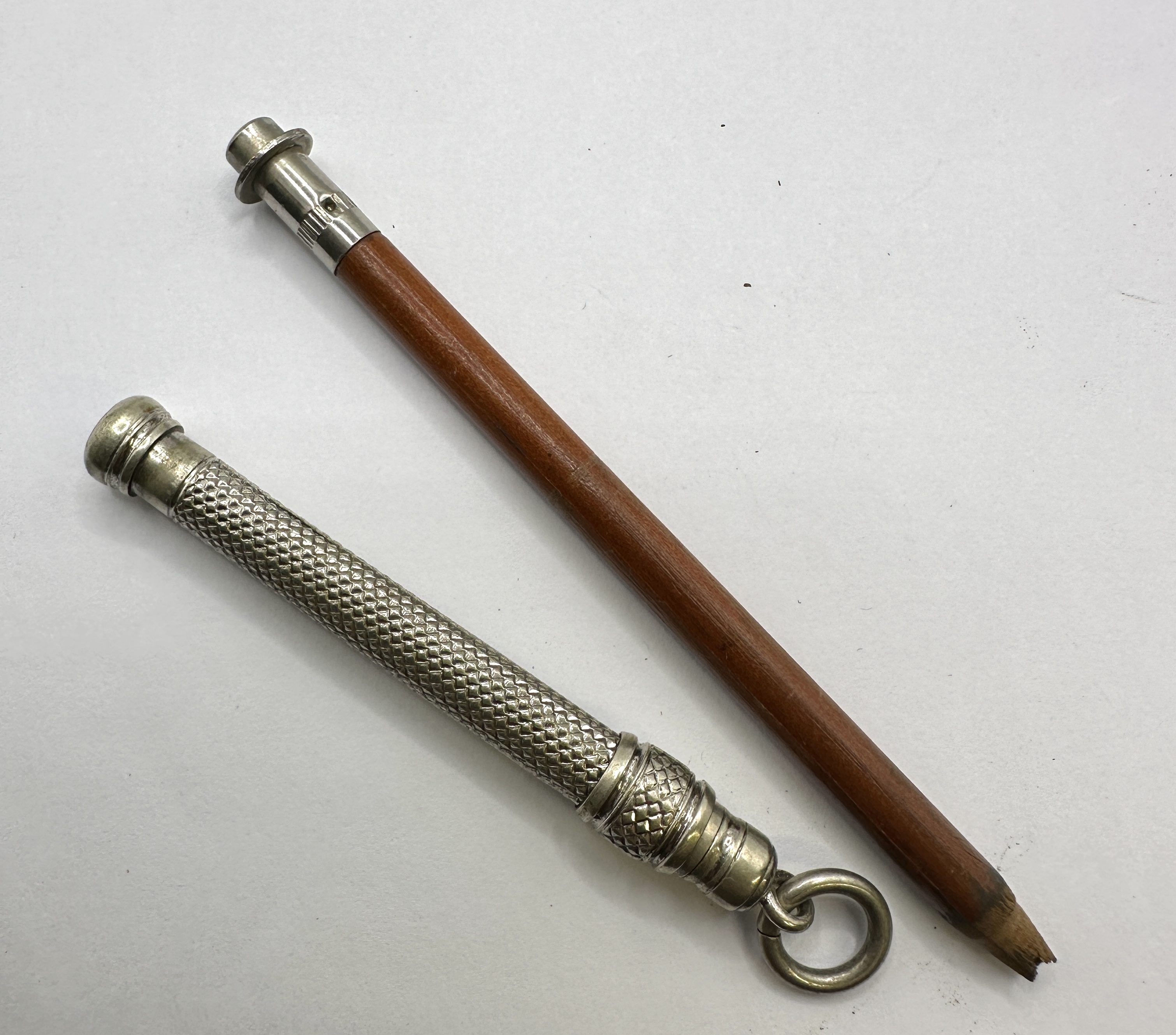 The item shows signs of age-appropriate wear and tarnishing to the white metal surfaces. The wooden pencil insert is intact, though the lead tip is broken. The friction fit between the sleeve and the pencil insert remains secure.