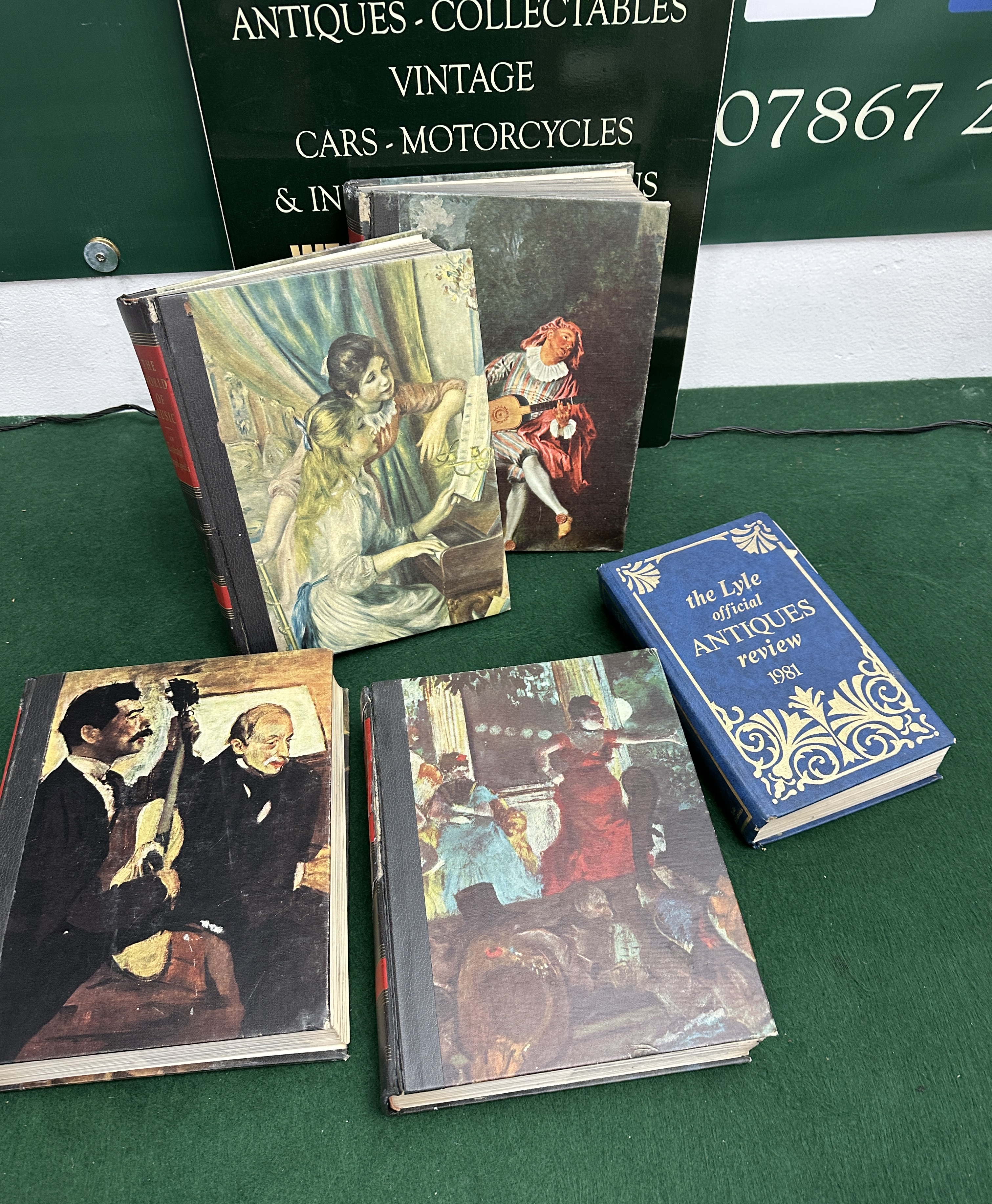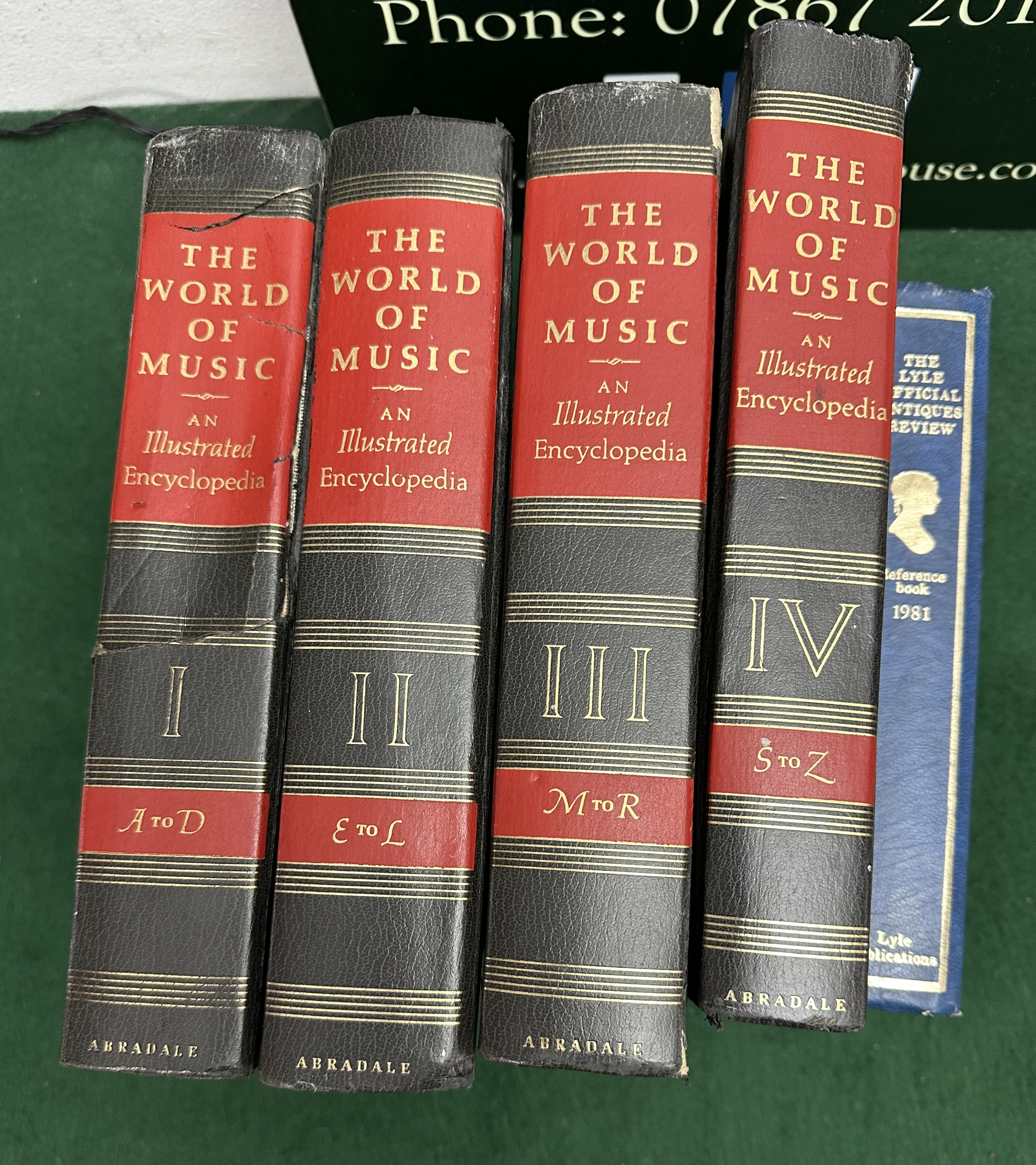 A collection of reference books featuring a four-volume set of The World of Music: An Illustrated Encyclopedia, published by Abradale, 1963. The volumes are bound with black and red spines featuring gilt-lettered titles and alphabetical designations from A to Z across Volumes I to IV. The front covers of the music encyclopedia are decorated with various art reproductions depicting musical and performance scenes. Included with the set is a blue cloth-bound copy of The Lyle Official Antiques Review 1981, which displays gilt-toned decorative scrollwork and titles on the front cover and spine.