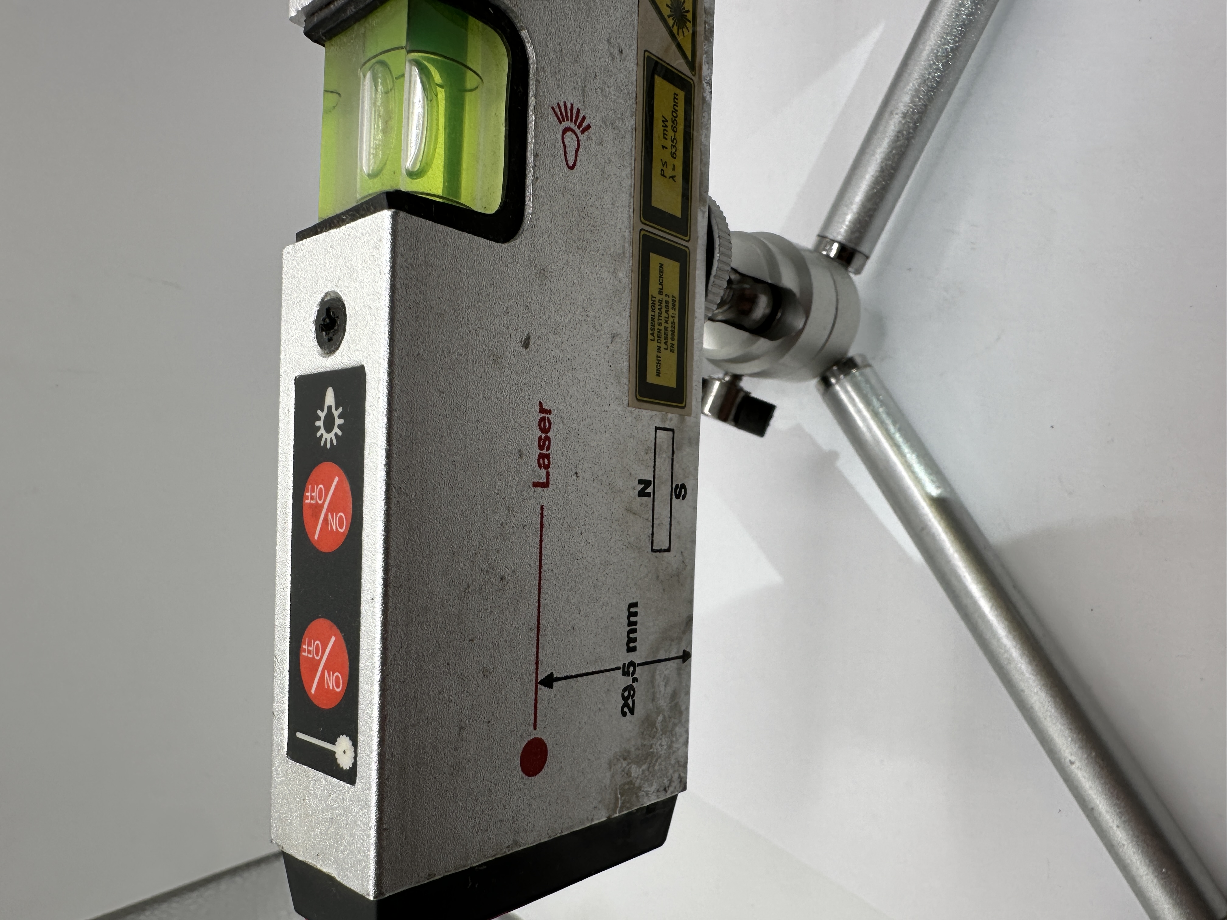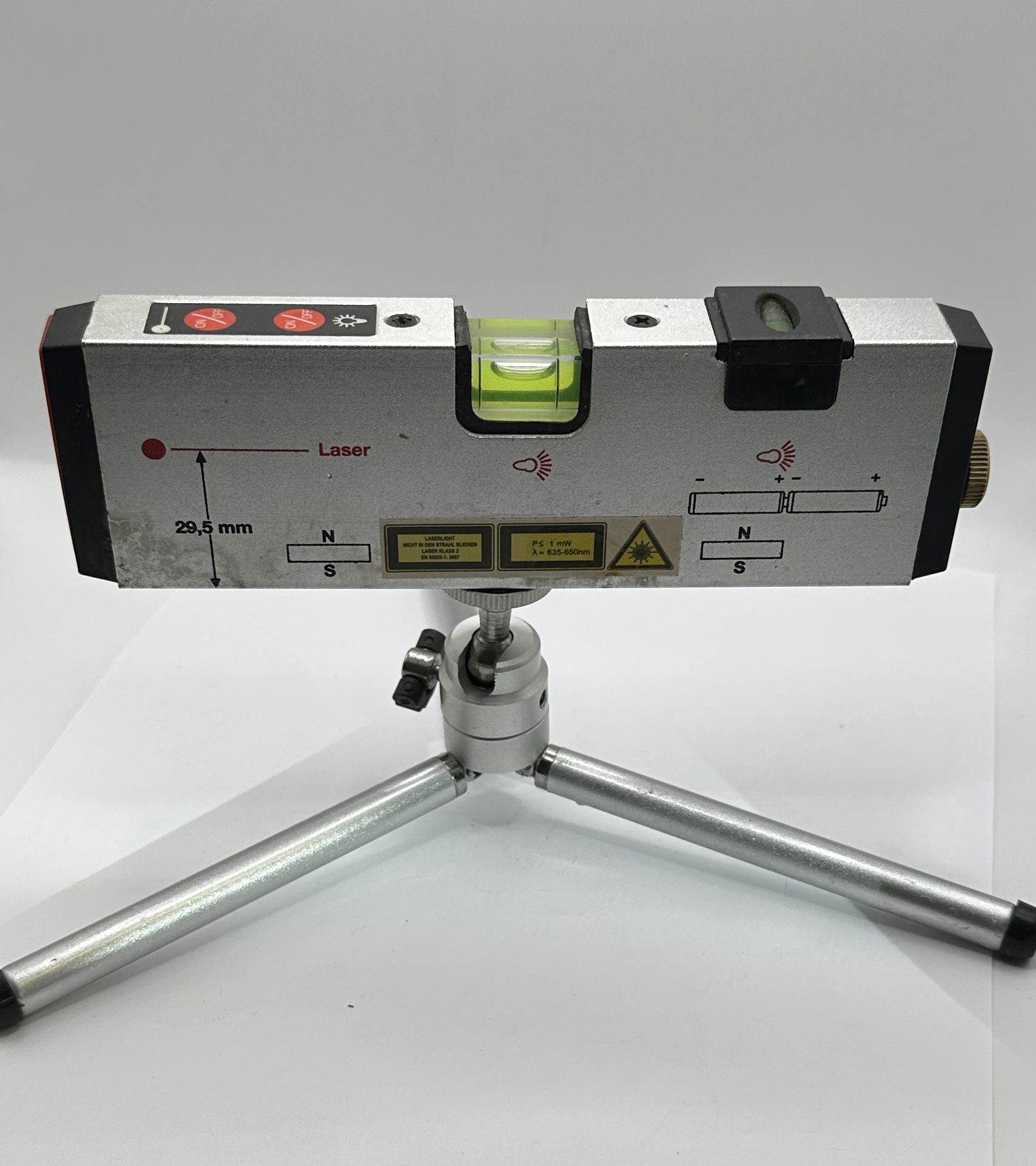A professional-grade laser spirit level mounted on a compact, three-legged metal mini-tripod with a ball-and-socket joint for adjustment. The main unit features a rectangular, silver-toned metal body with black plastic end caps and houses two integrated green spirit level vials for horizontal and vertical alignment. The device includes a red laser output, operated by ON/OFF buttons, and is marked with a measurement of 29,5 mm indicating the beam height from the base. Yellow safety labels in German specify a Class 2 laser with a wavelength of 635-650nm and power output of ≤ 1mW. Additional markings include battery orientation diagrams and N/S indicators for integrated magnets on the base.