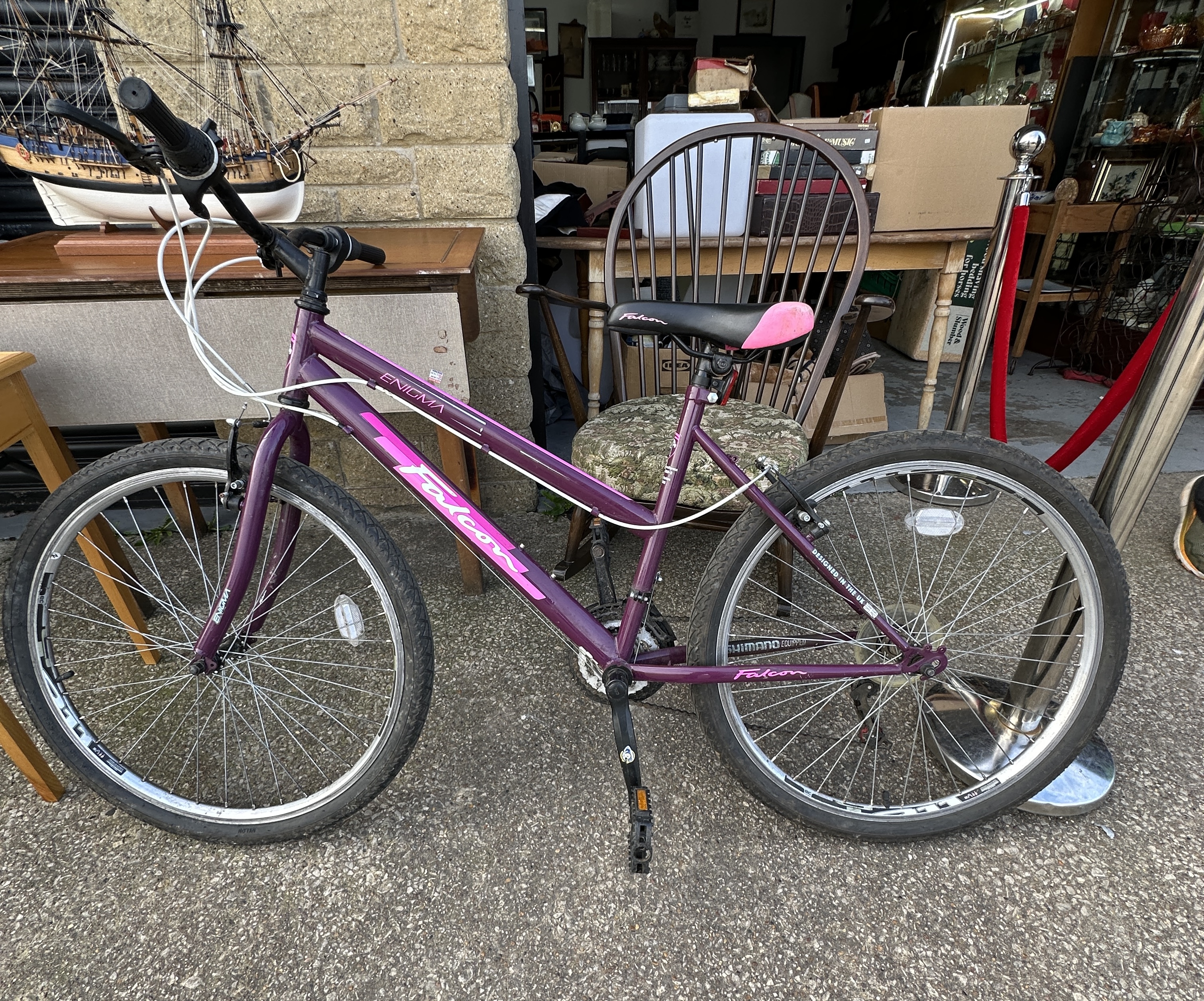A Falcon Enigma L17 women’s mountain-style bicycle featuring a purple-finished step-through frame with pink and white graphic accents. The frame is marked with Falcon branding and the model name Enigma, and includes the text Designed in the UK. The bicycle is Shimano Equipped and features a black and pink branded saddle, white cabling, and silver-tone spoked wheels with multi-surface tyres.