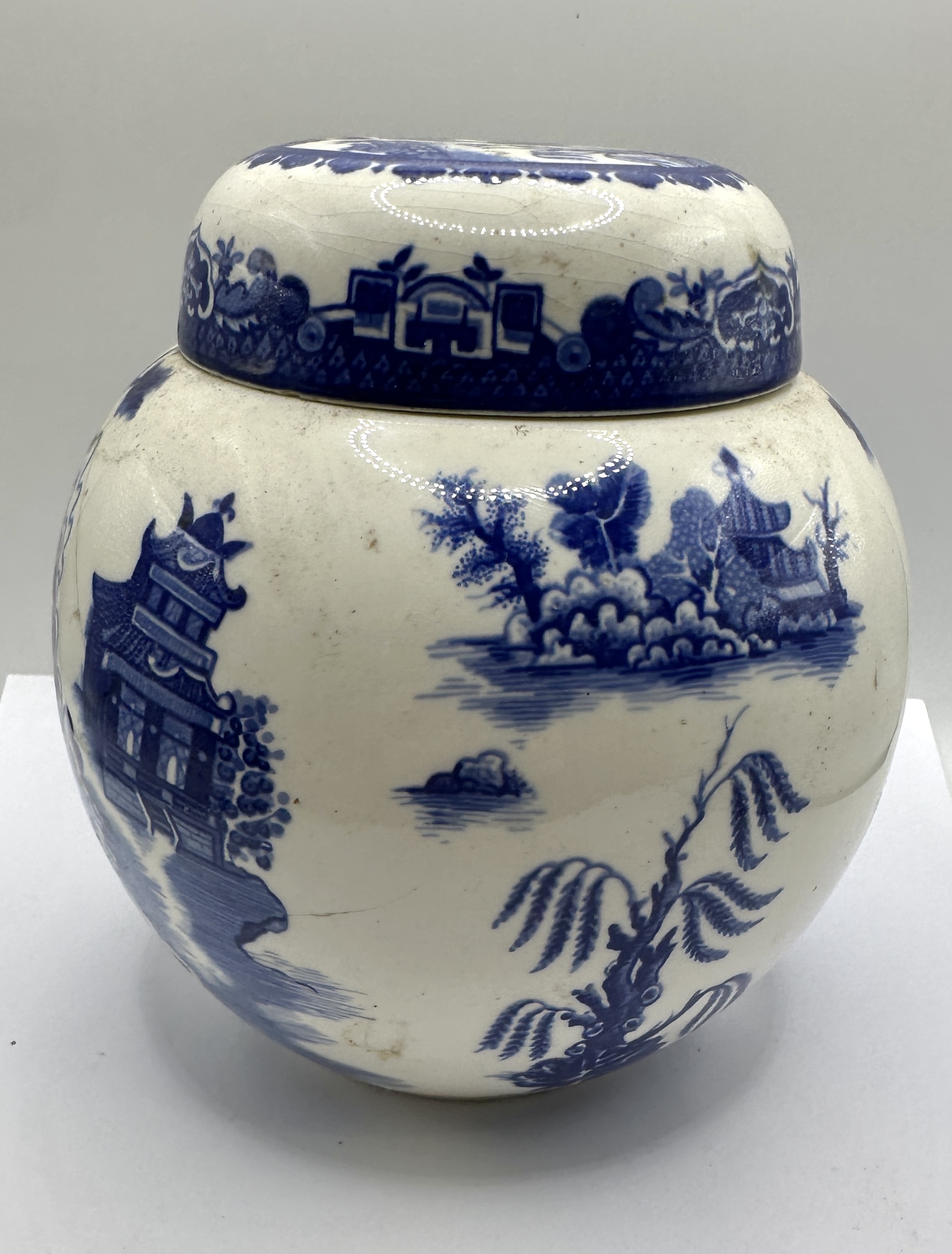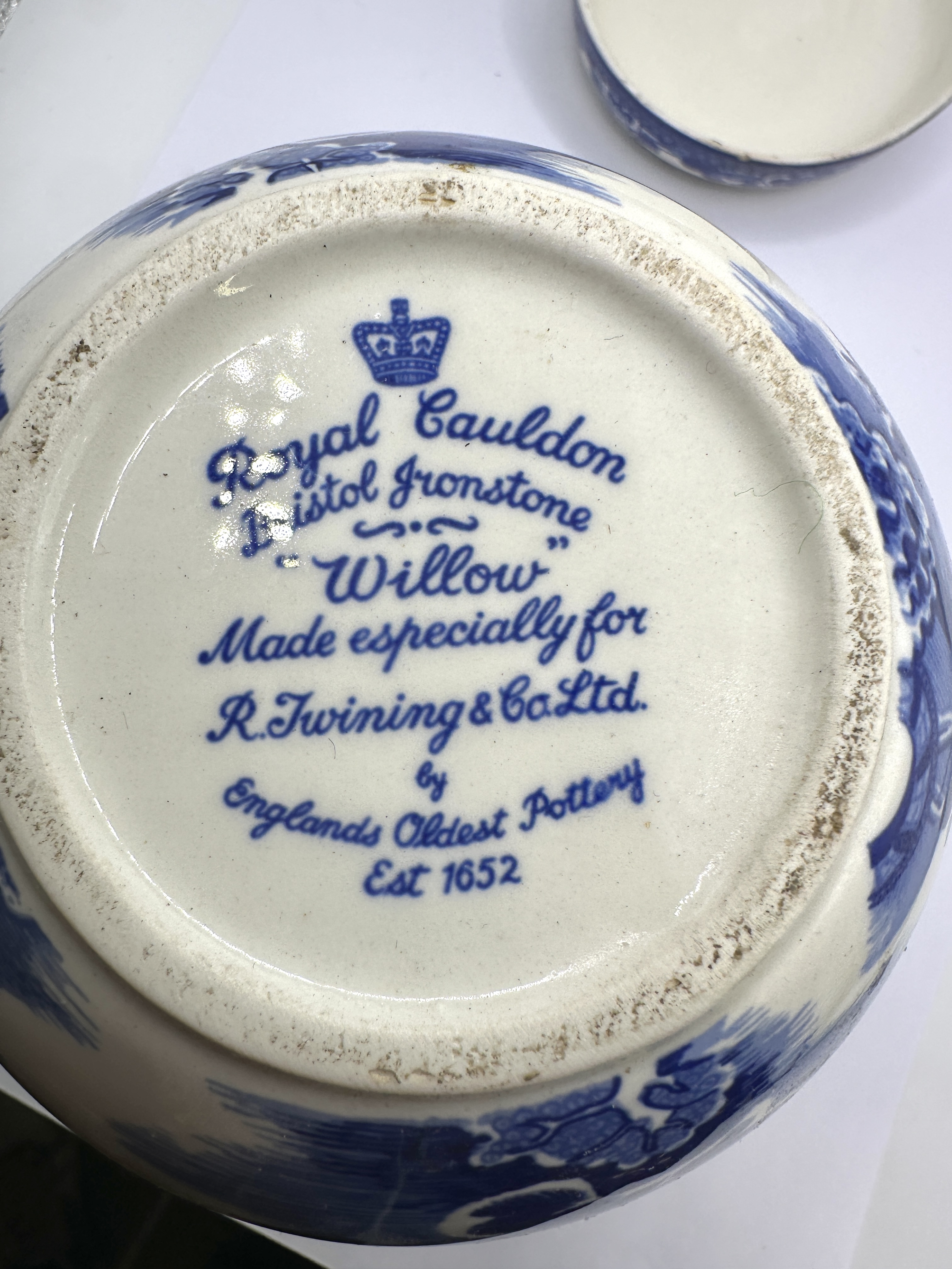 A Royal Cauldon Bristol Ironstone ginger jar with matching lid, decorated in the classic blue and white Willow transferware pattern. The Chinoiserie design features a landscape with pagodas and architectural motifs. The base carries a blue underglaze mark with a crown logo, identifying the piece as Royal Cauldon Bristol Ironstone Willow and stating it was Made especially for R. Twining & Co. Ltd. by Englands Oldest Pottery Est 1652. The vessel is constructed of ironstone with a globular body and a domed cover.