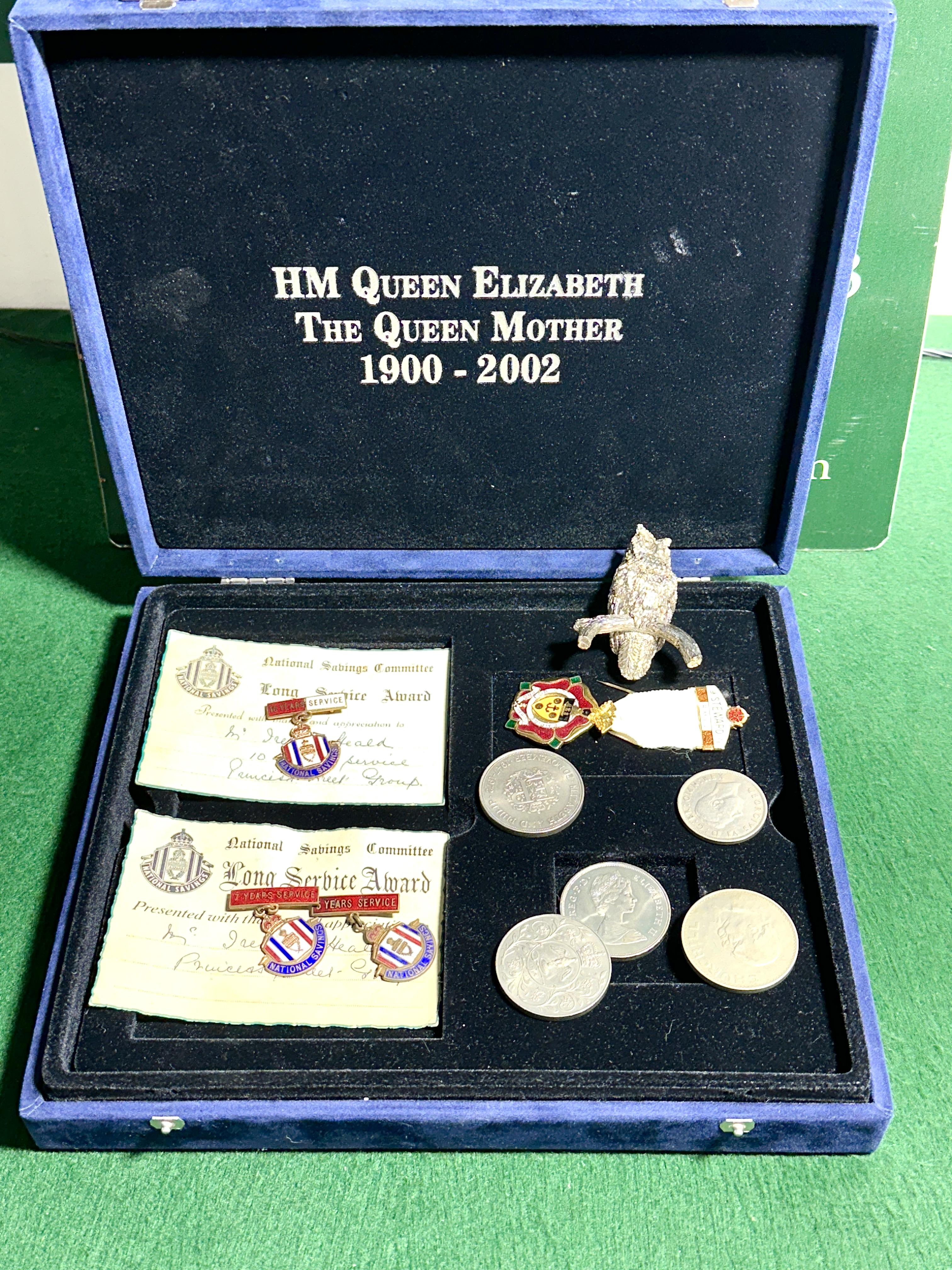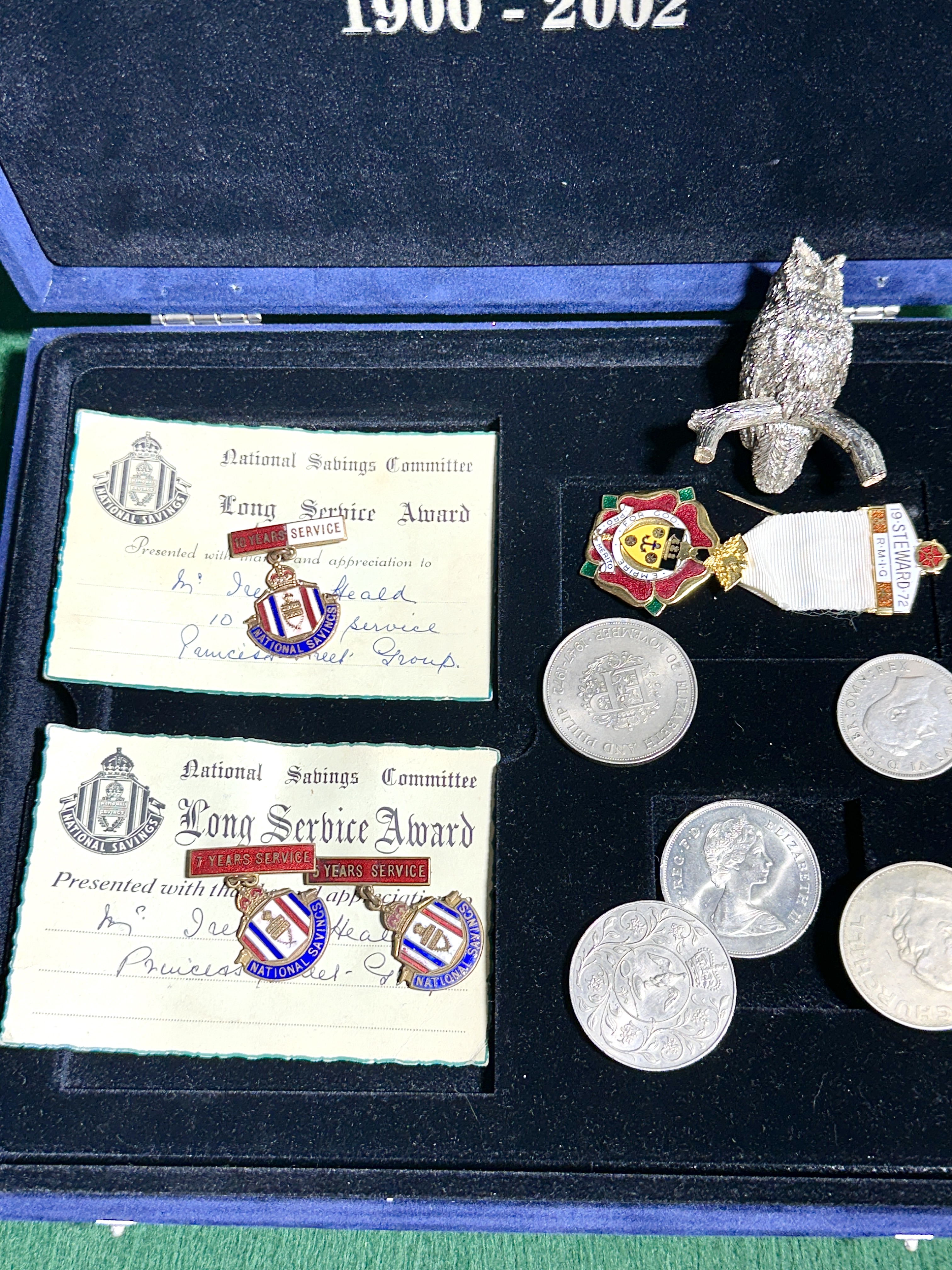 An assortment of British commemorative and long-service items housed within a blue velvet-lined presentation box. The interior lid features silver-toned lettering commemorating HM Queen Elizabeth The Queen Mother (1900-2002). The collection includes several National Savings Committee Long Service Award certificates and corresponding enamel lapel pins for five, seven, and ten years of service, issued to a Mrs Irene Heald. The numismatic items comprise British commemorative crowns, including a 1972 Silver Wedding anniversary issue, a 1965 Winston Churchill commemorative, a George VI crown, and a Queen Elizabeth The Queen Mother commemorative issue. Completing the set is a 1972 Royal Masonic Institution for Girls (RMIG) Steward’s medal with a white ribbon and enamel details, alongside a textured silver-toned owl figurine.