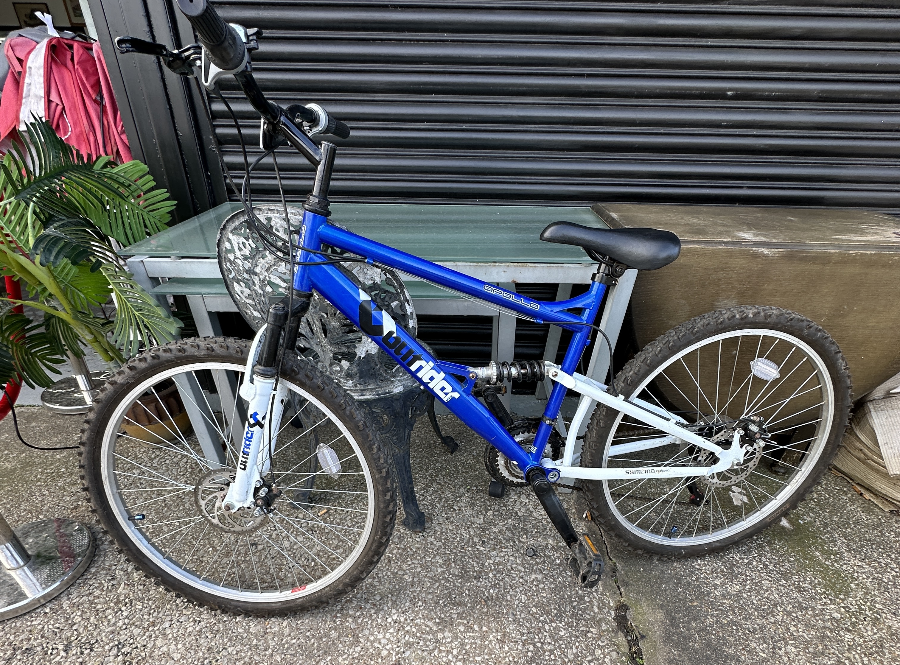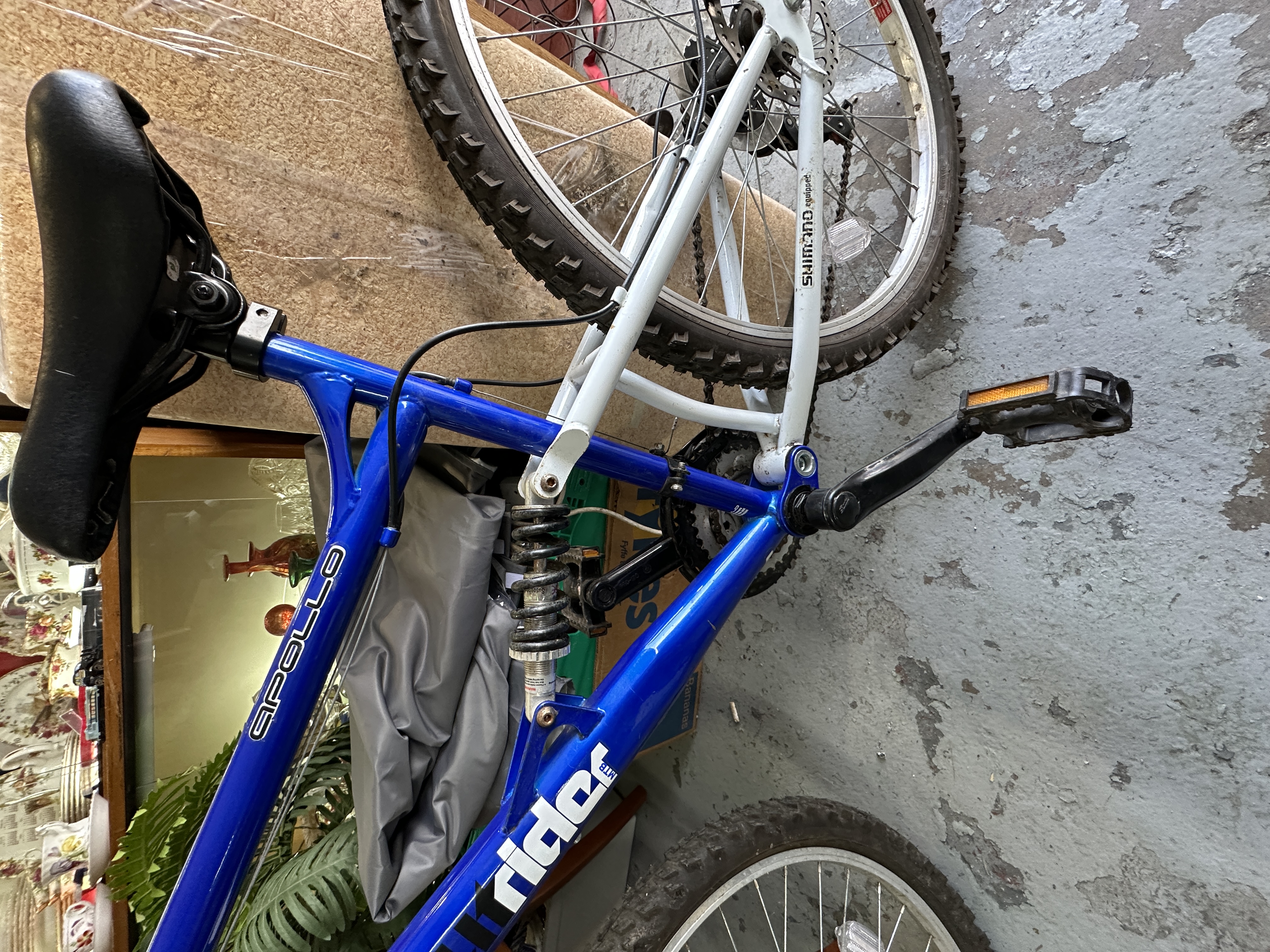An Apollo Outrider full suspension mountain bike featuring a blue and white frame. The bicycle is constructed with front suspension forks and a rear coil shock absorber. It is equipped with front and rear disc brakes, including a Clarks caliper on the front wheel. The drivetrain is marked as Shimano equipped and features standard pedals. Branding for Apollo and Outrider is present on the frame and forks. The bike is fitted with knobby off-road tires on silver-tone rims and a black saddle.