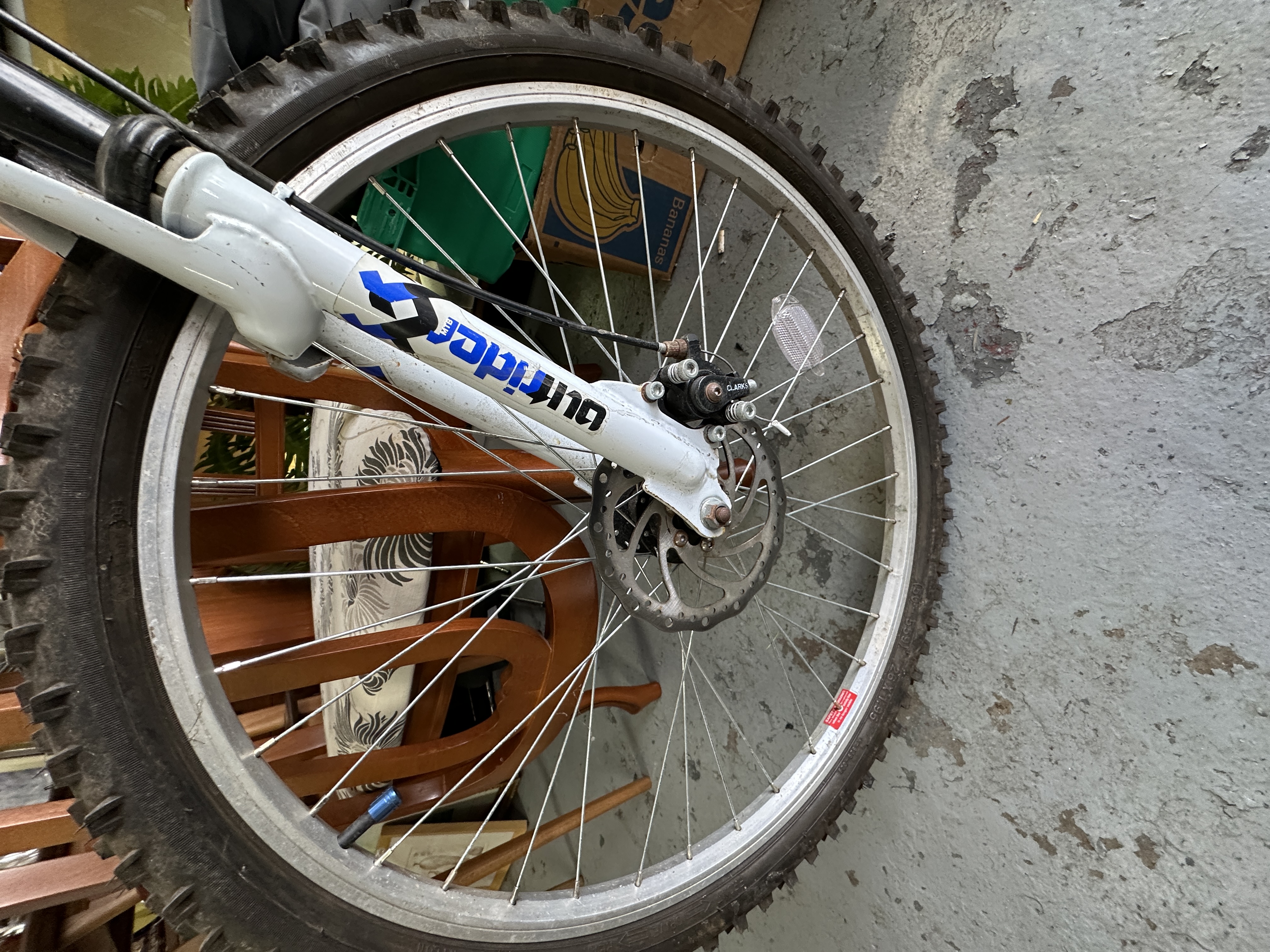 The bicycle is in used condition, showing surface dirt and wear consistent with regular outdoor use. There are visible scuffs to the frame and decals. Minor oxidation is present on some metal components, including the disc rotors and various bolts.