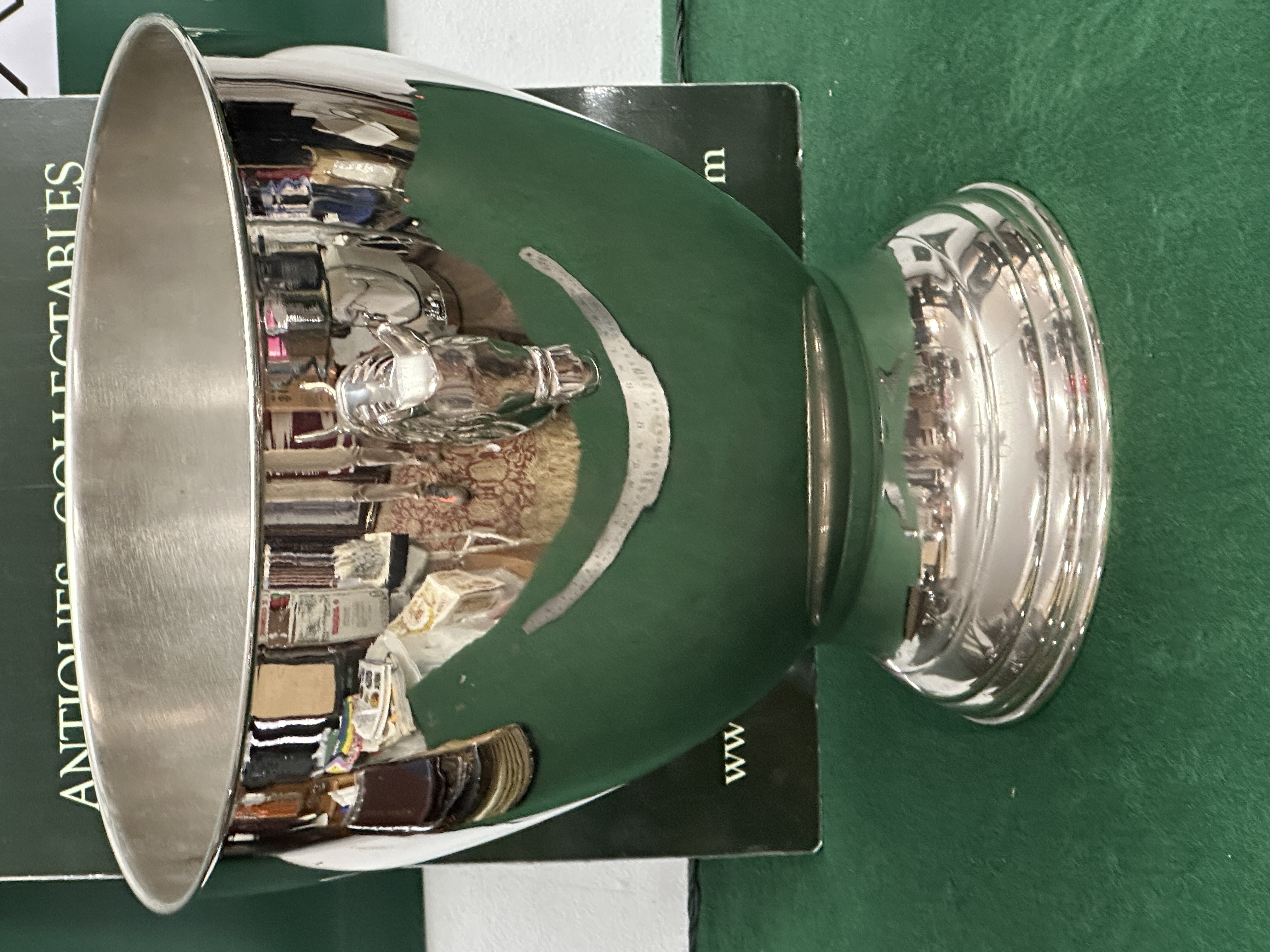 A large champagne or wine cooler constructed from steel with a polished silver-tone finish. The vessel features a deep flared bowl supported by a stepped pedestal base. It is mounted with two realistically cast handles in the form of horse heads, complete with bridle and mane detailing. The exterior surface is finished to a high reflective polish.