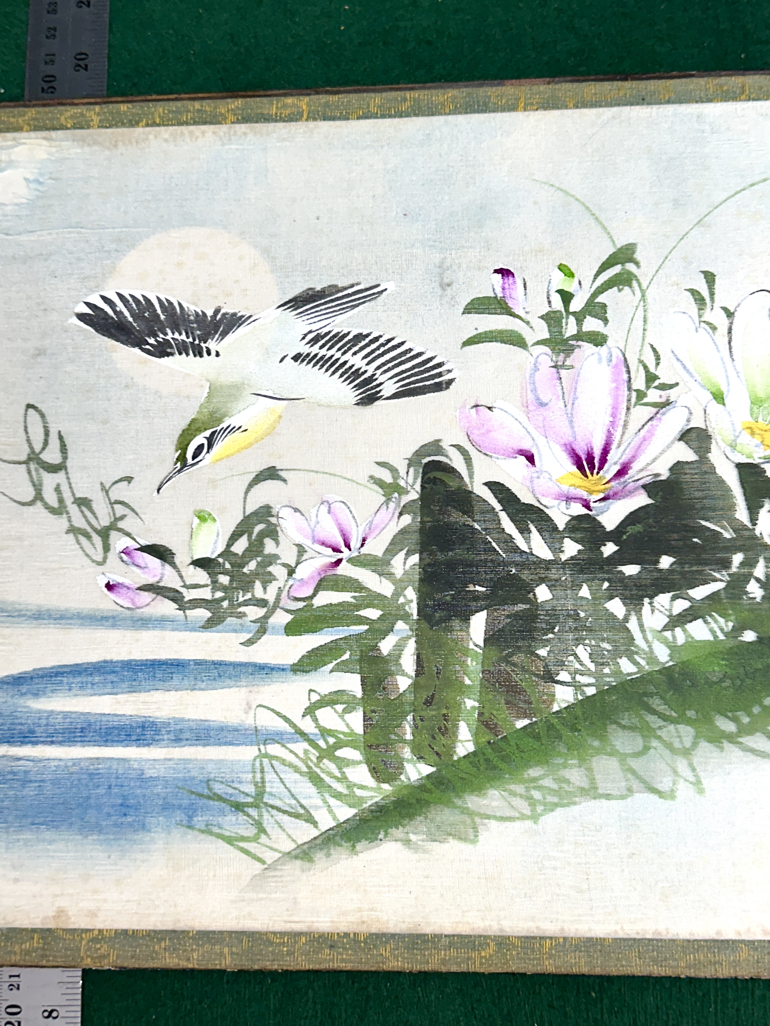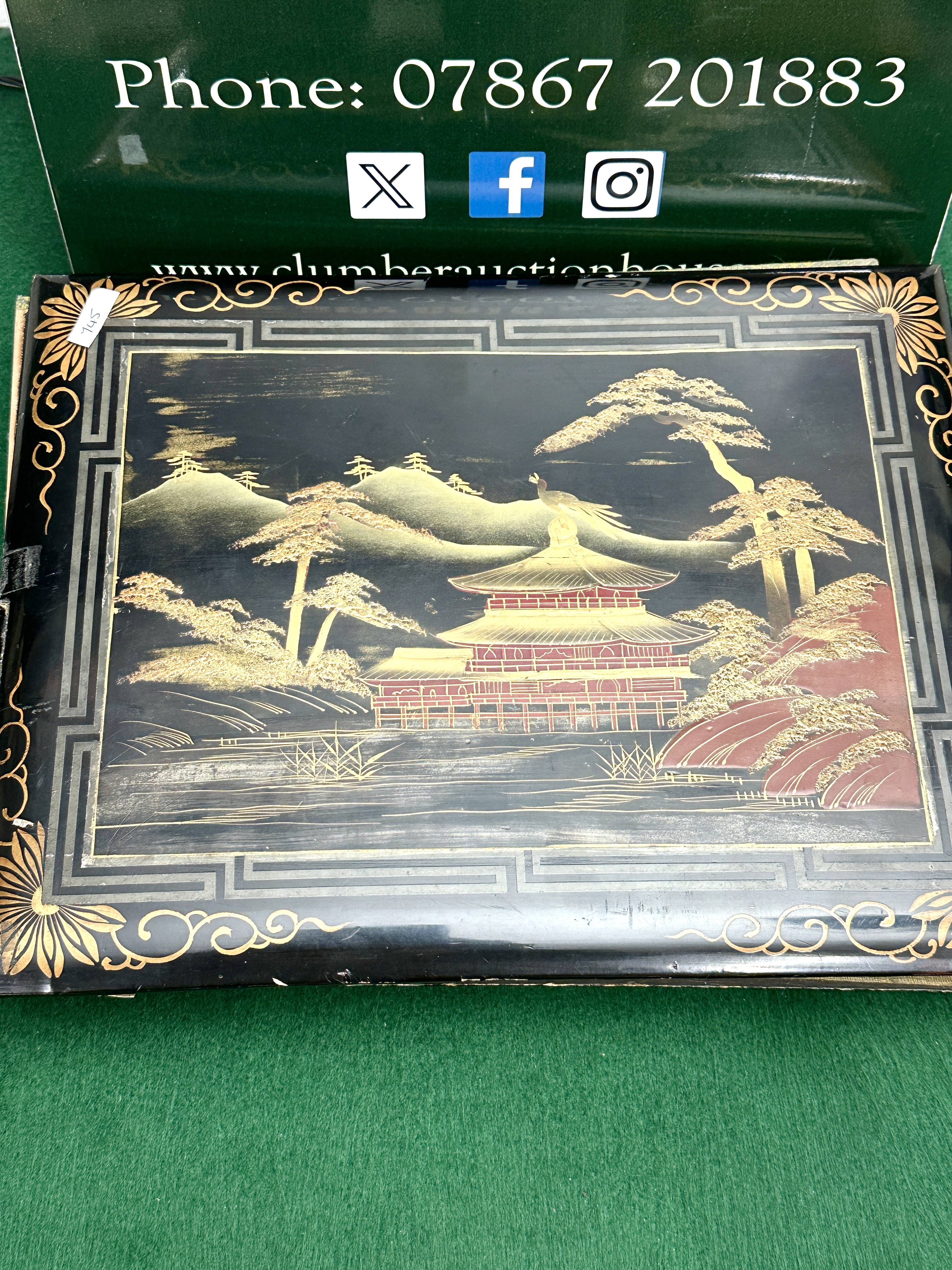 The lacquer cover exhibits visible surface wear and minor loss to the lacquer concentrated along the edges. The interior paper pages show light age-related toning and minor foxing, consistent with age and use.
