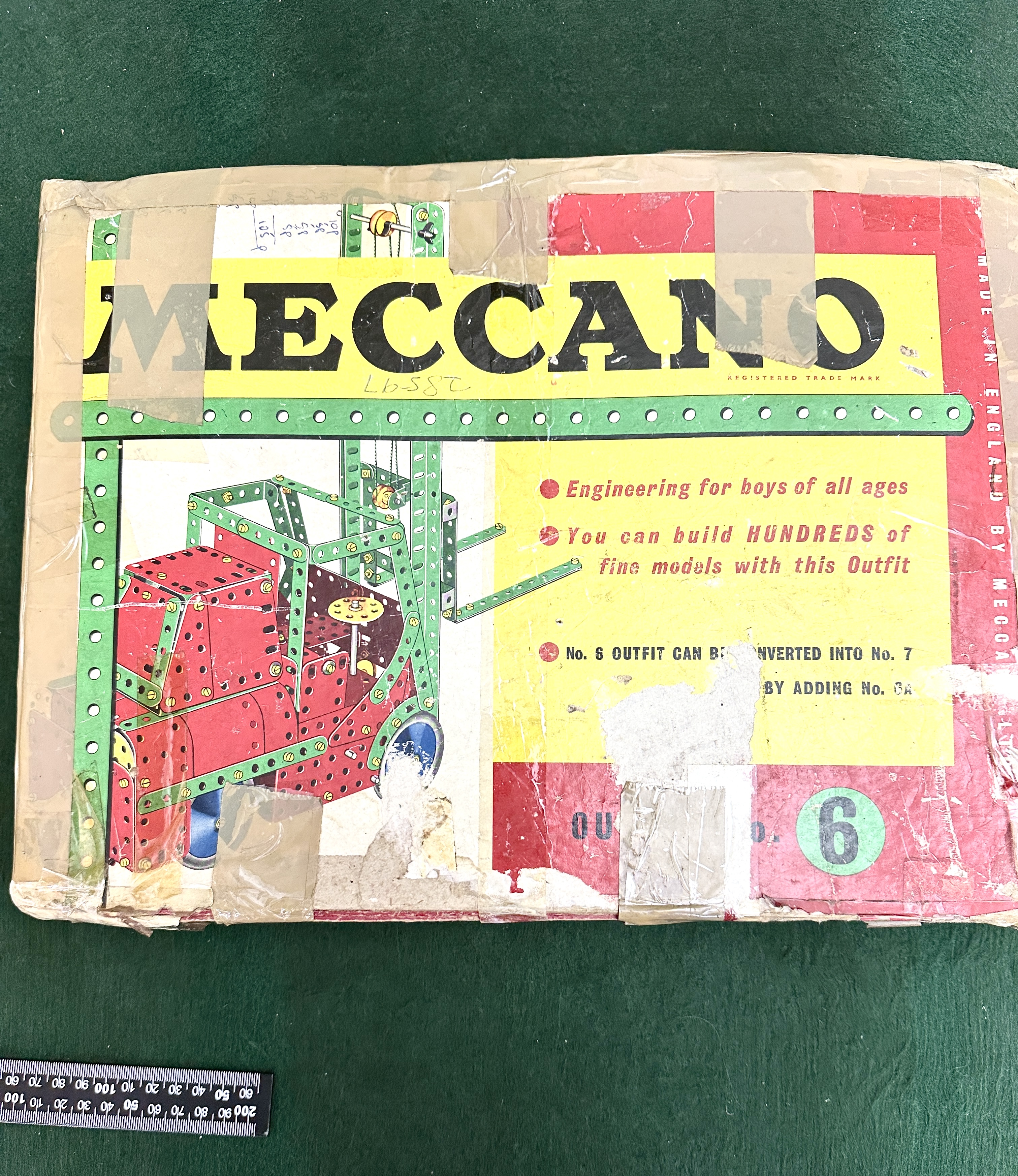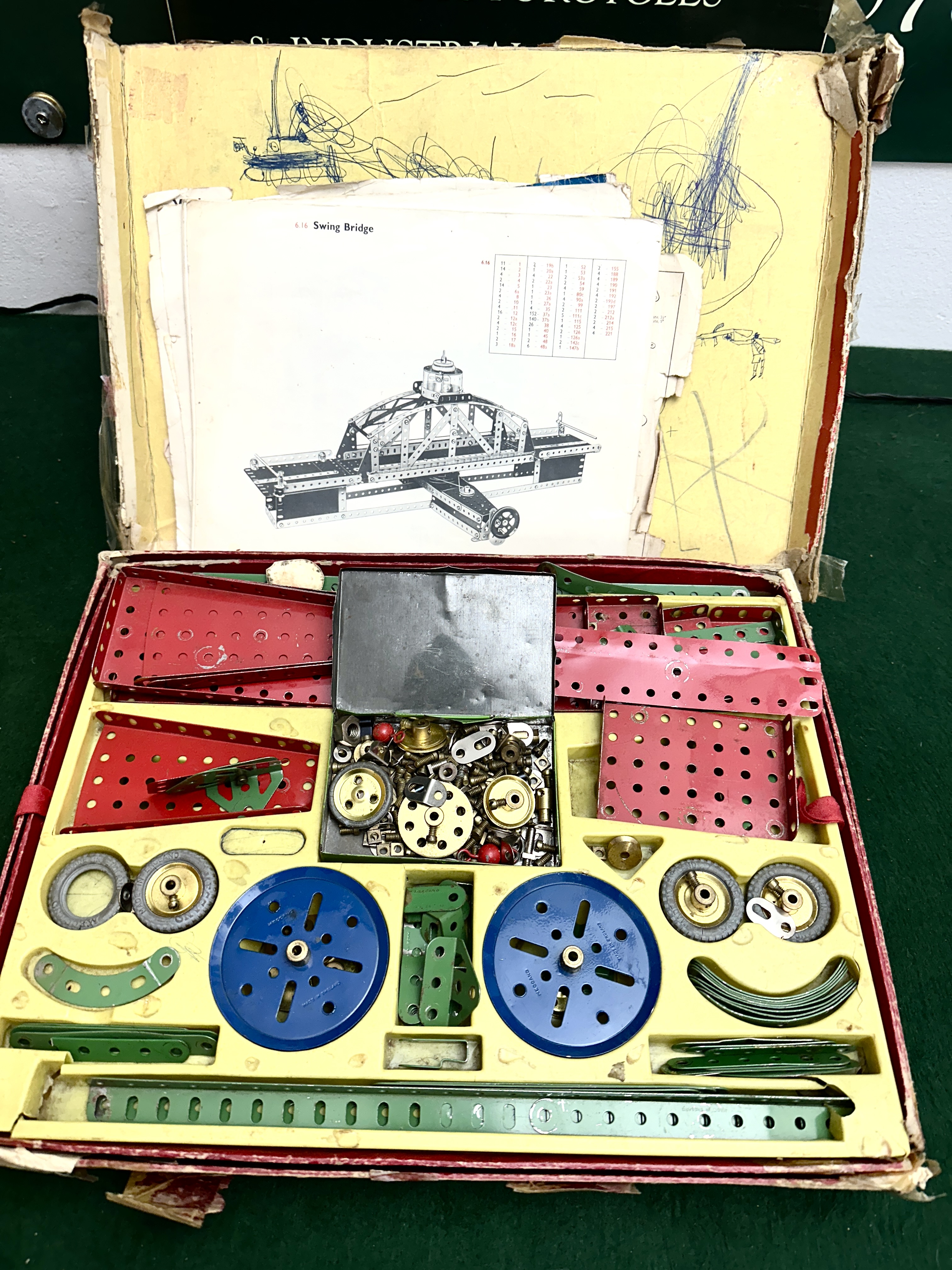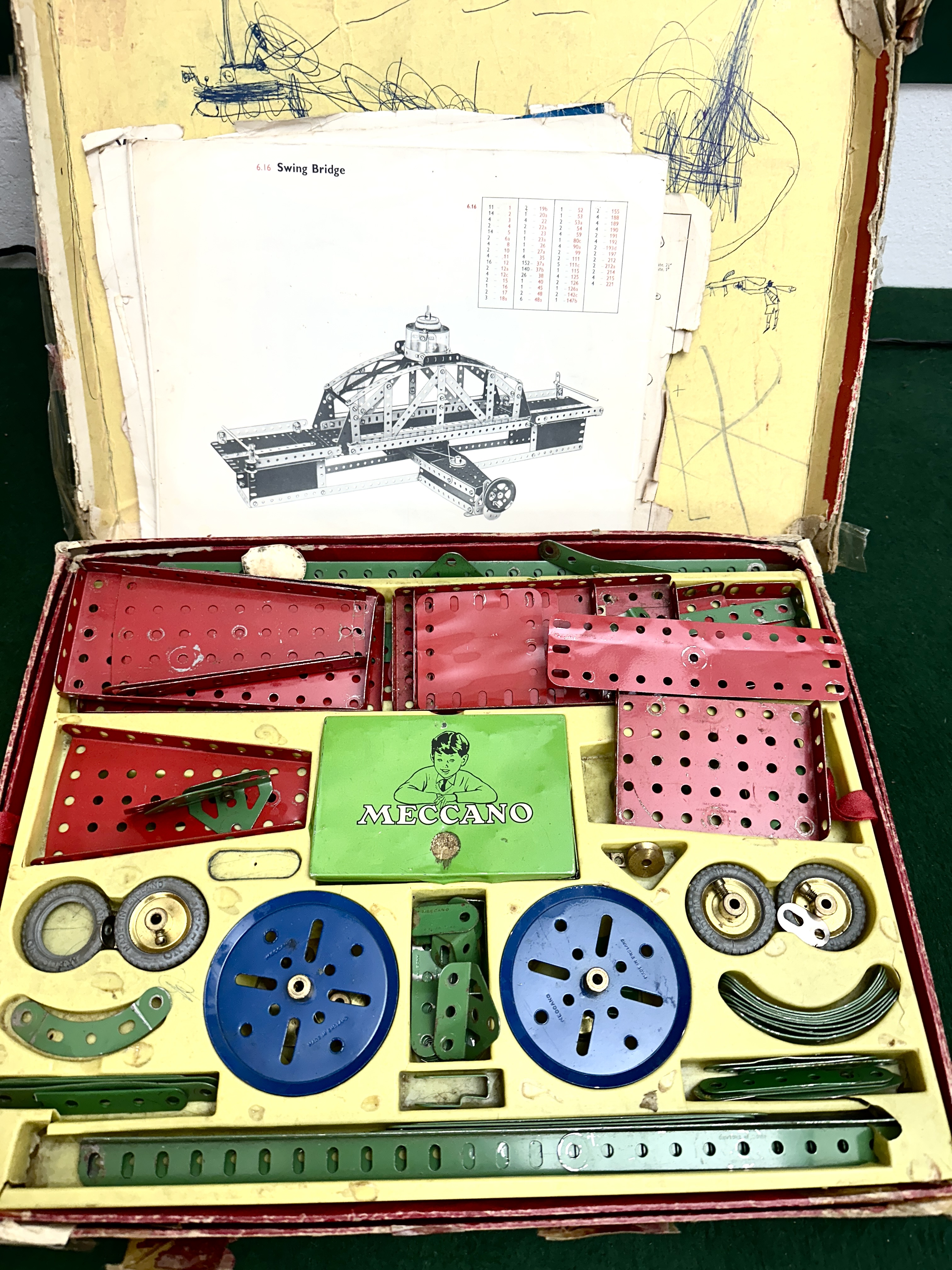 The outer cardboard box shows significant wear with visible tears, extensive clear adhesive tape repairs, and blue ink scribbling on the interior lid. The metal components appear generally well-preserved with minor paint loss and light oxidisation consistent with age and use. Completeness of the set is unverified.
