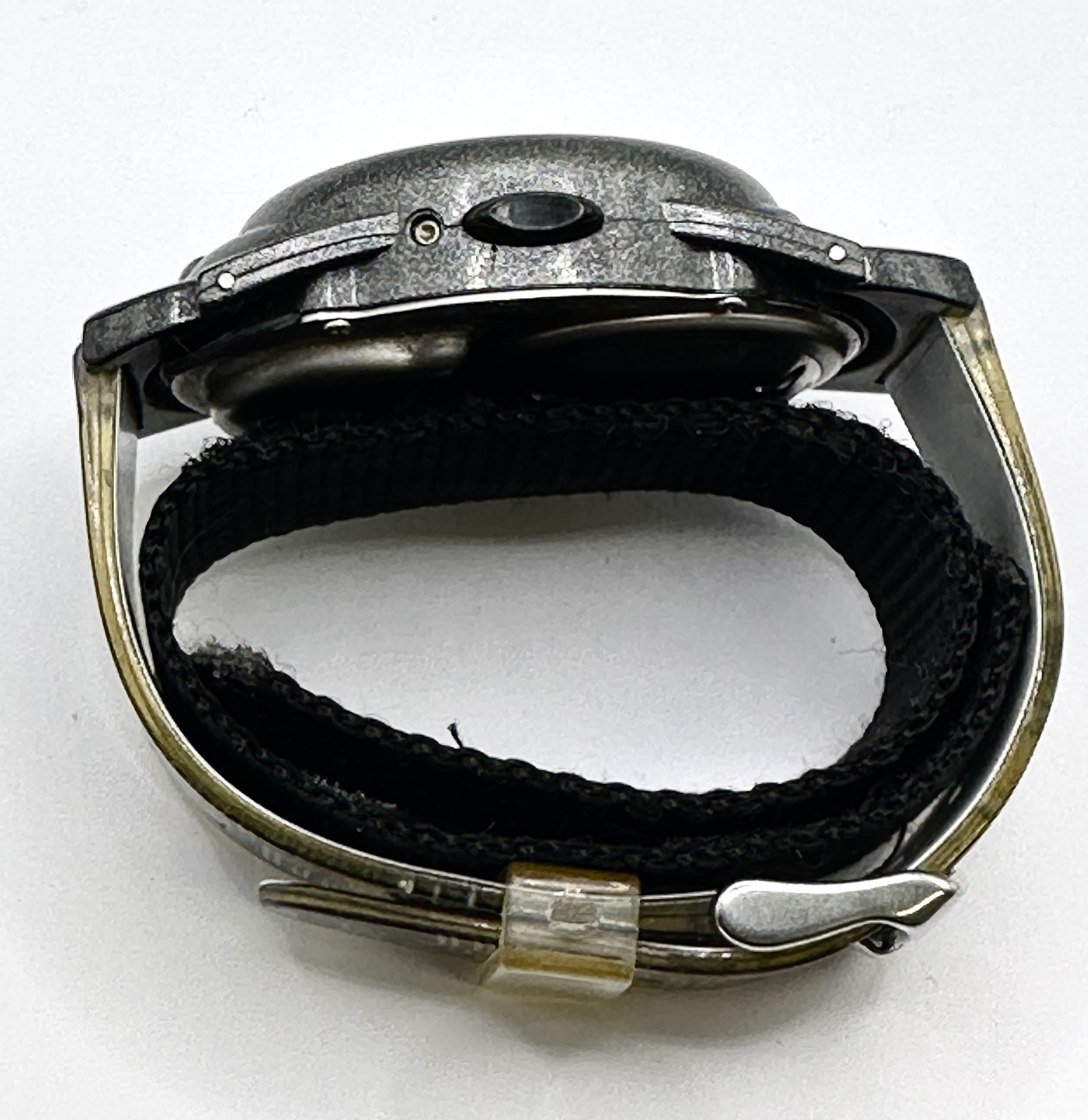 The watch is in fair condition. There is visible scuffing and wear to the metallic finish of the case. The nylon fabric strap shows signs of fraying, and the clear plastic overlay has significant yellowing. The digital display is functional but exhibits some pixel degradation.