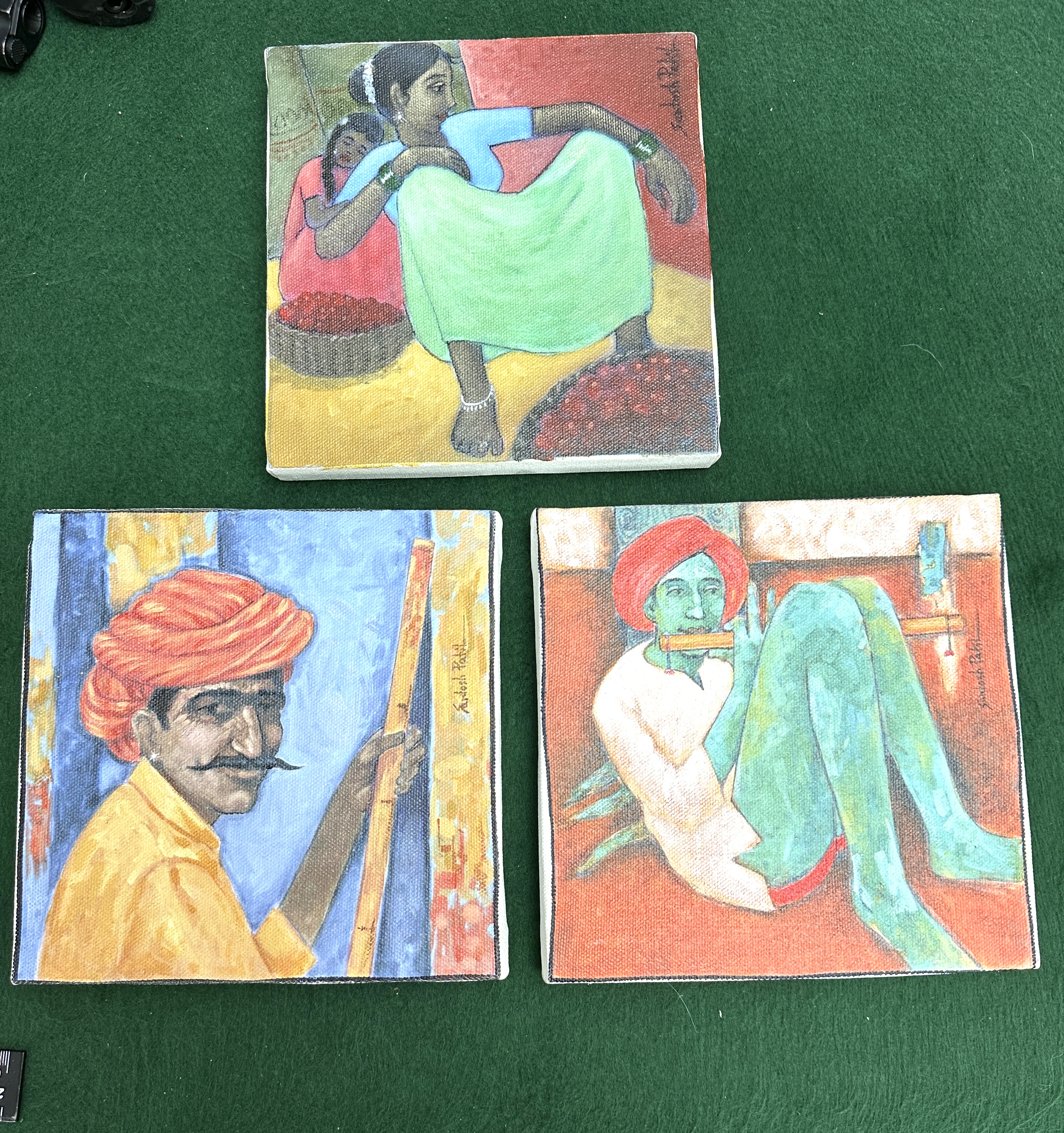 A trio of contemporary figurative paintings on canvas, each signed Santosh Patil. The works depict various scenes and portraits of Indian life, including women seated with baskets, a man in a turban holding a staff, and a man playing a flute. The pieces are rendered in a folk-influenced style with bold, saturated colours. Each unframed work is executed on a small, square, gallery-wrapped canvas.