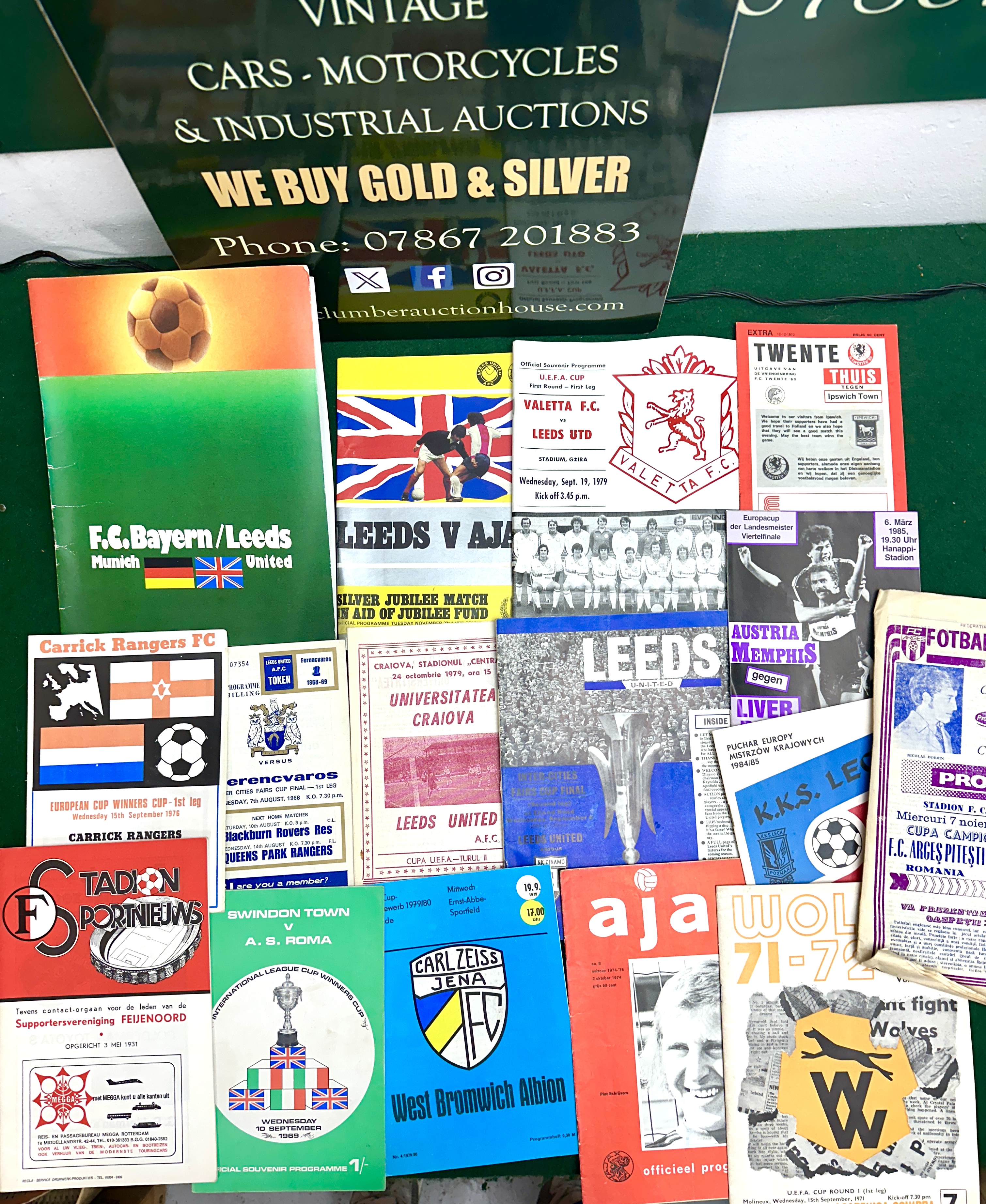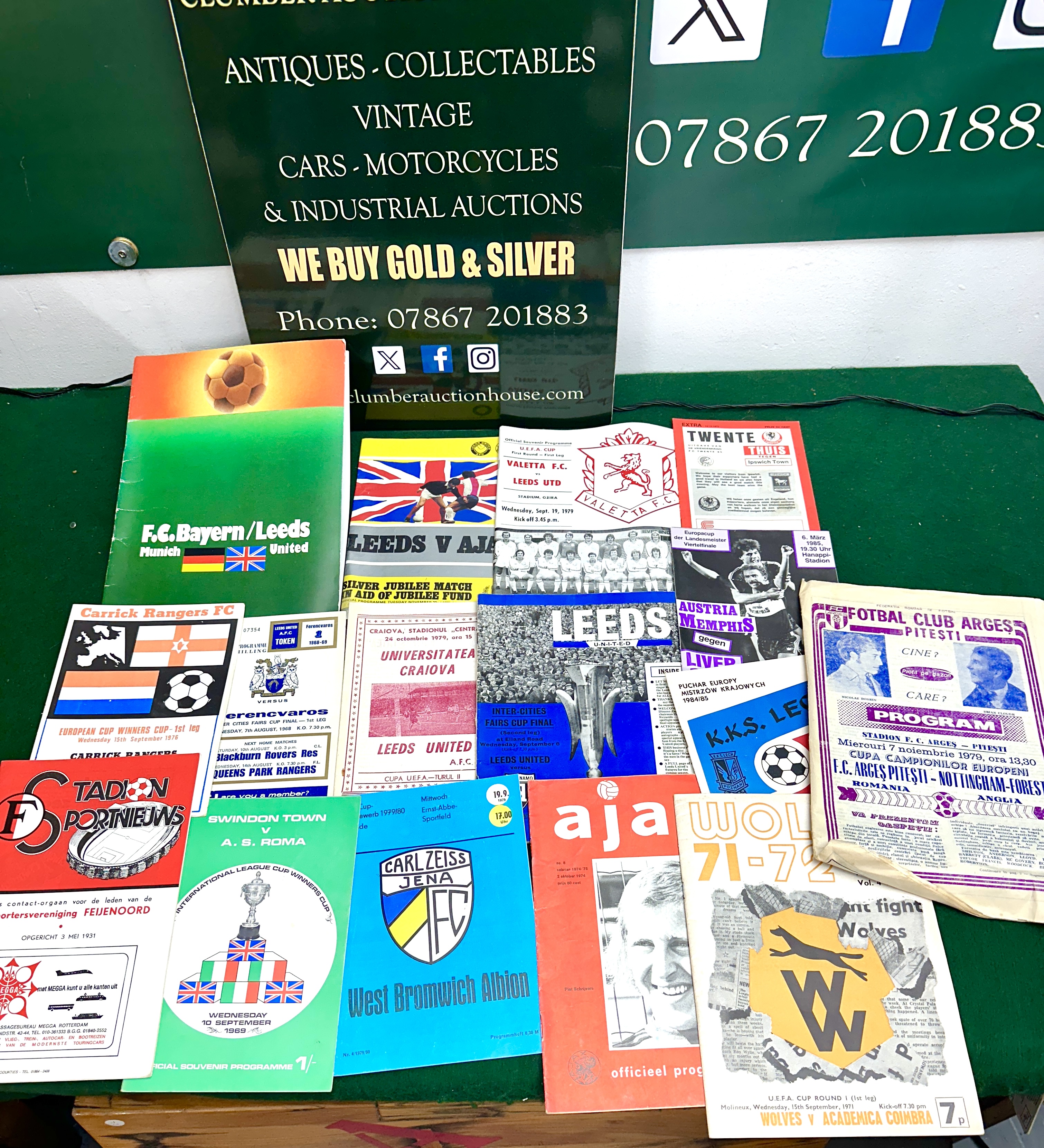 A collection of vintage football matchday programmes and related ephemera, primarily dating from the late 1960s through the 1980s. The group includes various printed paper booklets and leaflets documenting domestic and international competitions such as the U.E.F.A. Cup, European Cup Winners’ Cup, European Cup, and Inter-Cities Fairs Cup. Featured clubs include Leeds United, F.C. Bayern Munich, West Bromwich Albion, Swindon Town, A.S. Roma, Feyenoord, Ajax, Wolverhampton Wanderers, Ipswich Town, and Nottingham Forest. Notable individual items include programmes for Valetta F.C. v Leeds United (1979), Swindon Town v A.S. Roma (1969), F.C. Arges Pitesti v Nottingham Forest (1979), and Carl Zeiss Jena v West Bromwich Albion (1979). The collection features text in multiple languages including English, Dutch (Stadion Sportnieuws), German, Romanian, and Polish.