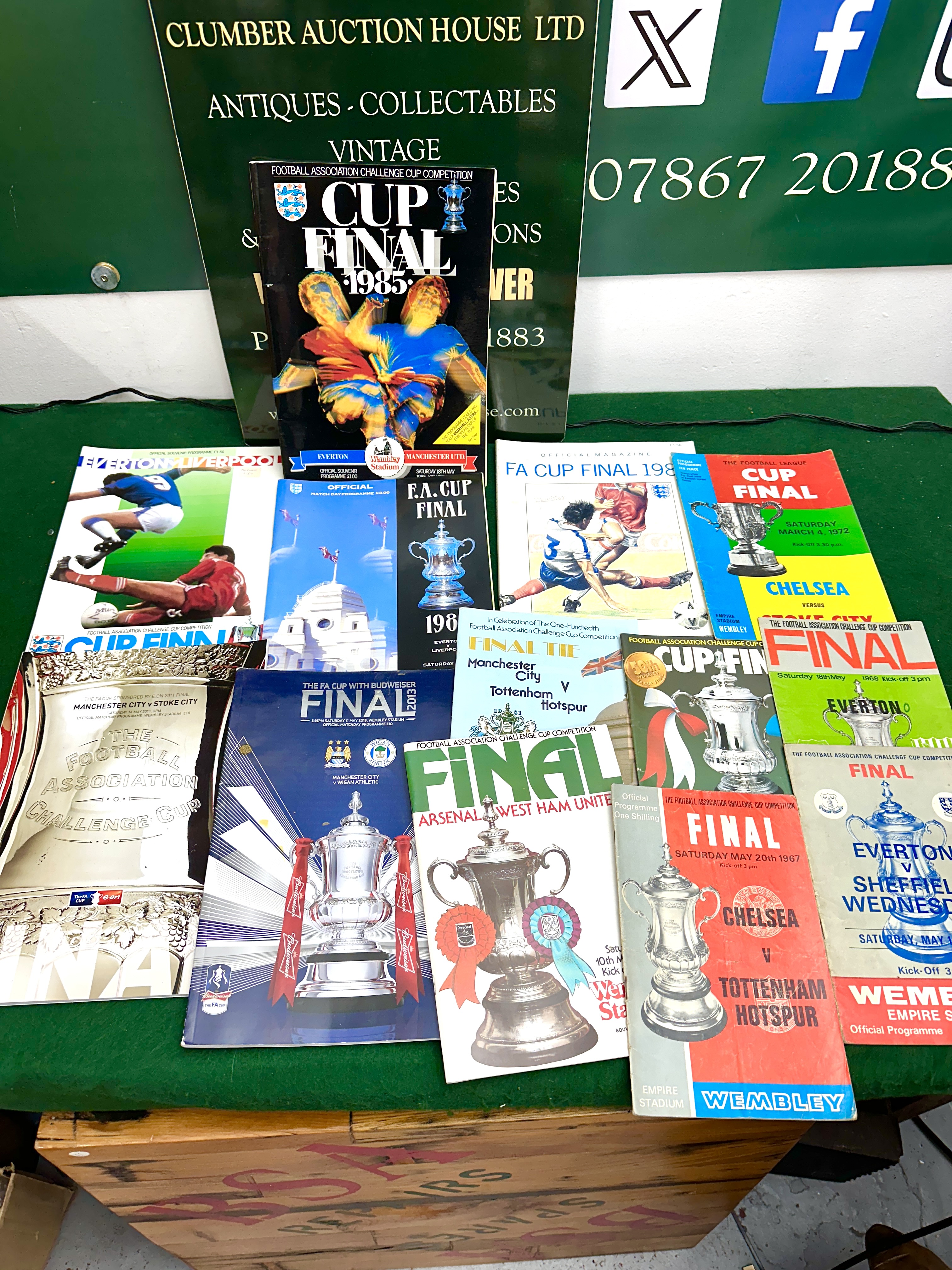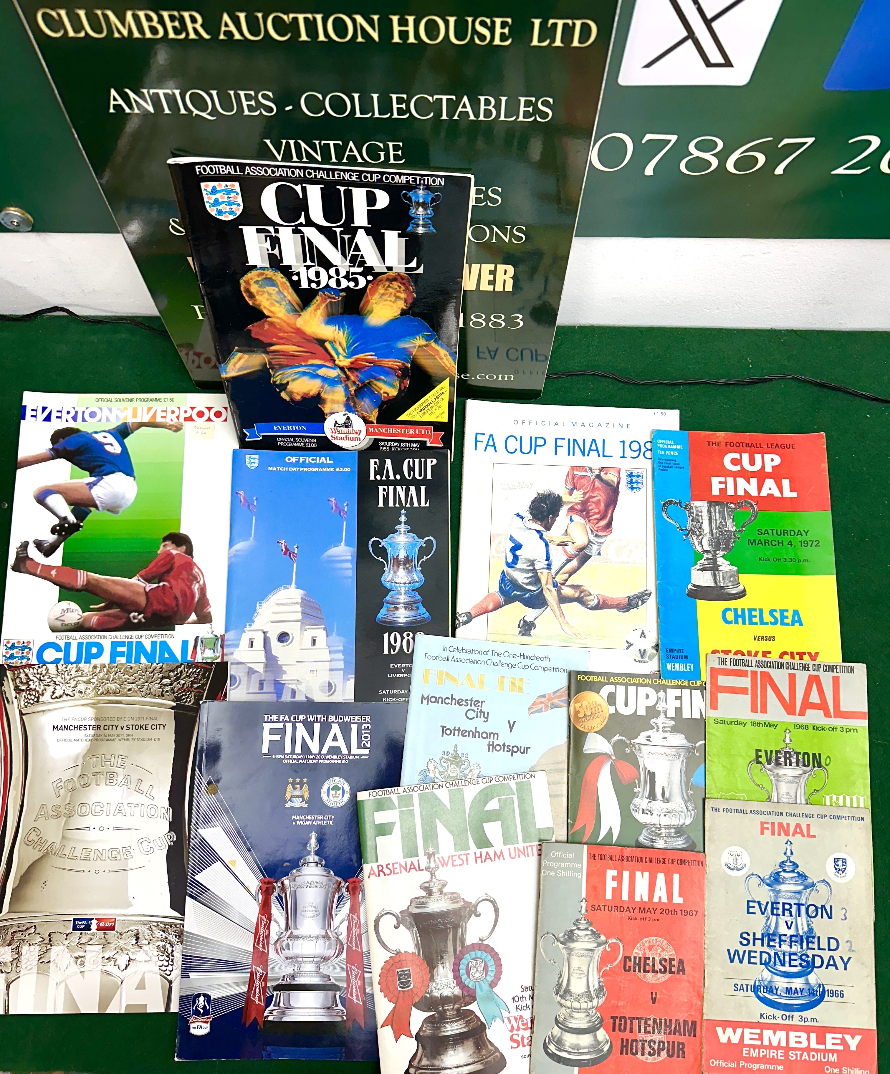 A collection of official matchday programmes for various English football cup finals, primarily the FA Cup and the League Cup. The group features programmes for matches held at Wembley Stadium involving clubs such as Everton, Manchester United, Liverpool, Manchester City, Chelsea, Tottenham Hotspur, Arsenal, West Ham United, Sheffield Wednesday, Stoke City, and Wigan Athletic. The collection spans several decades with visible dates including 1966, 1967, 1968, 1972, 1980, 1981, 1985, 1986, 1988, 2011, and 2013. The items are constructed from printed paper, with graphic styles ranging from mid-century typography to modern high-gloss photography. Notable inclusions are the 1966 FA Cup Final (Everton v Sheffield Wednesday), the 1967 FA Cup Final (Chelsea v Tottenham Hotspur), the 1972 League Cup Final (Chelsea v Stoke City), and the 1981 FA Cup Final centenary celebration programme.