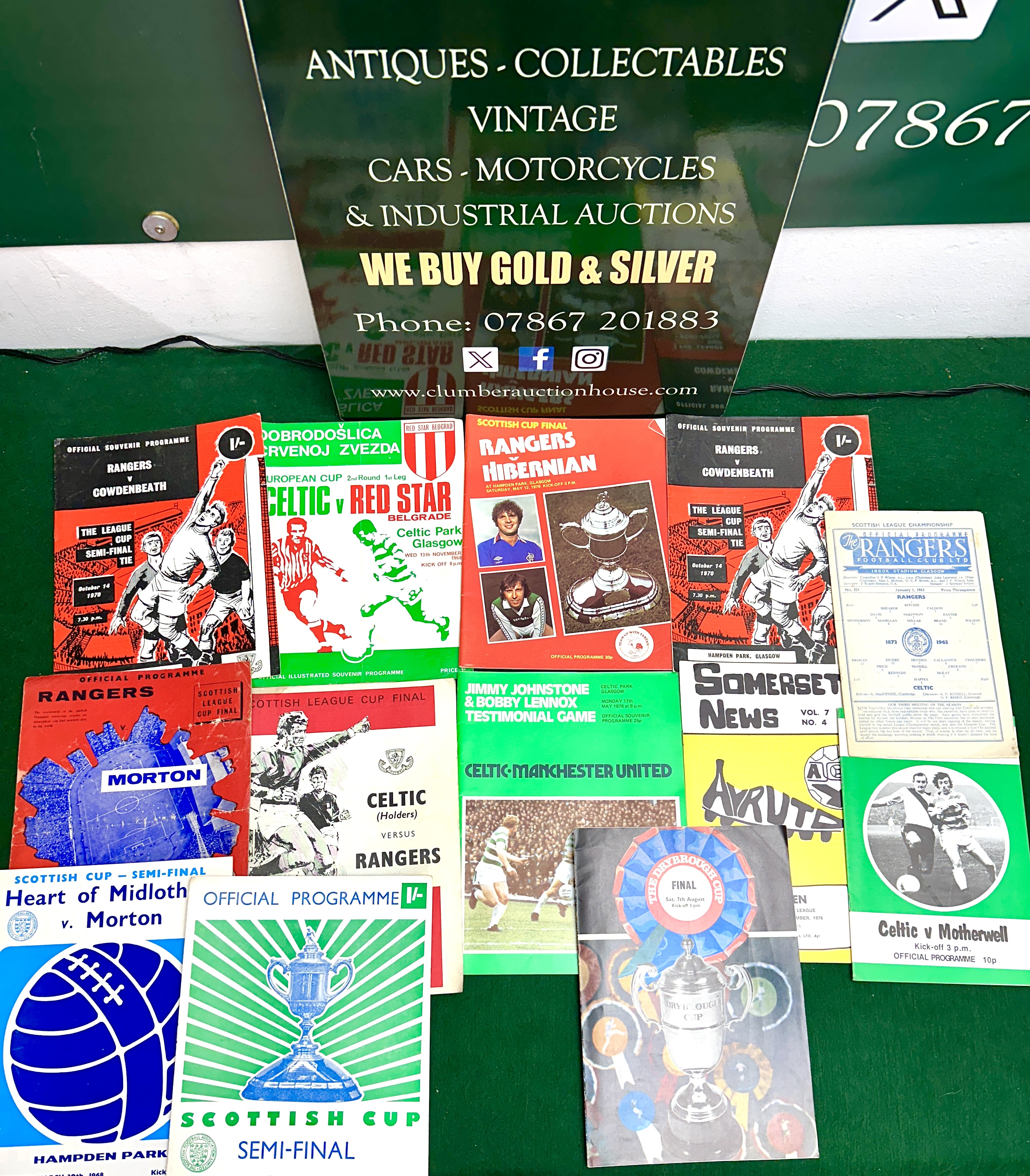 This collection comprises vintage Scottish football matchday programmes and sporting ephemera, primarily dating from the 1960s and 1970s. The group features programmes from various competitions including the Scottish Cup, Scottish League Cup, European Cup, and the Drybrough Cup. Represented clubs include Rangers, Celtic, Morton, Hibernian, Heart of Midlothian, Motherwell, and Ayr United. Notable items include an official souvenir programme for the 1968 Celtic v Red Star Belgrade European Cup match featuring the Serbian greeting DOBRODOŠLICA CRVENOJ ZVEZDI, a 1976 testimonial programme for Celtic players Jimmy Johnstone and Bobby Lennox against Manchester United, and a 1963 New Year’s Day Rangers v Celtic matchday programme. The collection also includes a 1971 Drybrough Cup Final programme, 1970 League Cup Semi-Final programmes for Rangers v Cowdenbeath, and a 1979 Scottish Cup Final programme for Rangers v Hibernian. The items are printed on paper with period-typical graphics, typography, and photography.