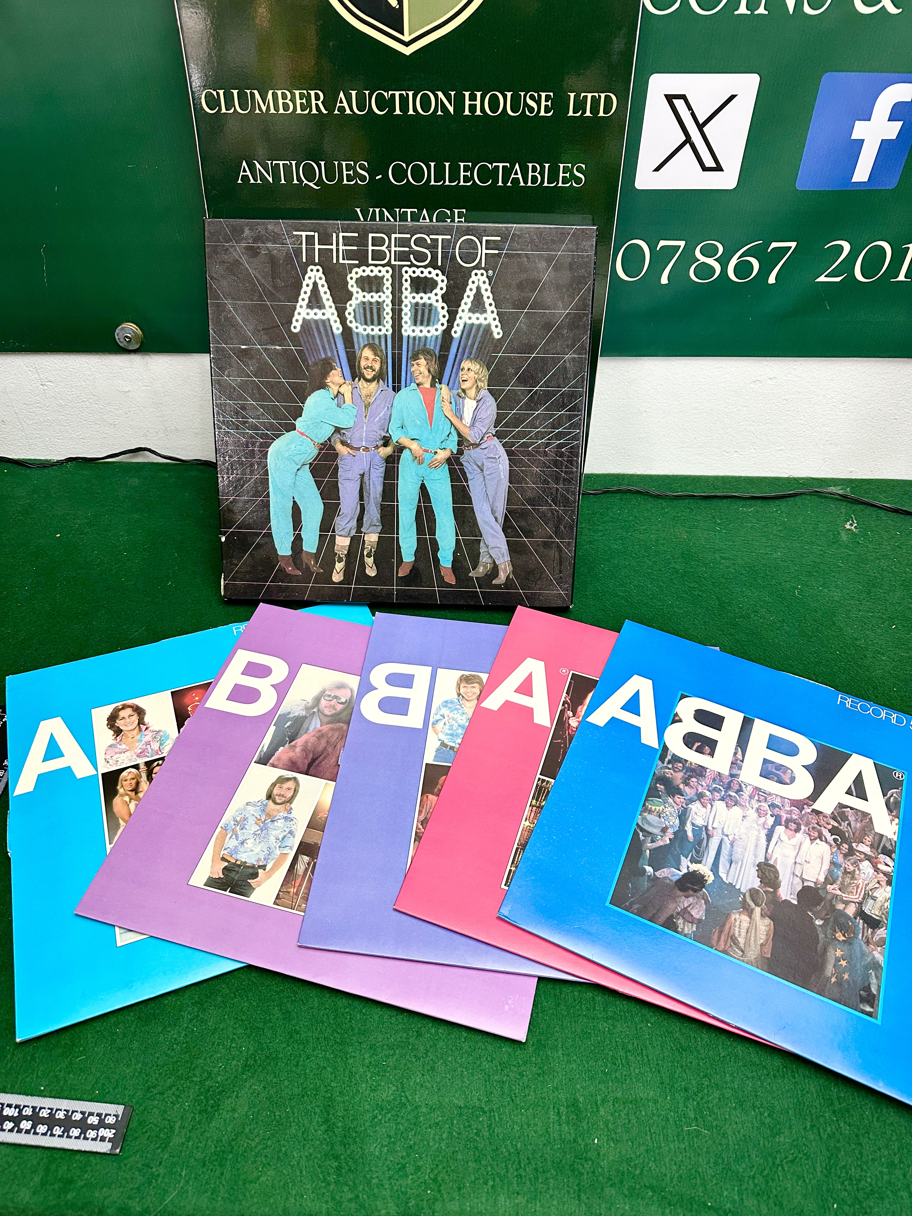 A vinyl record compilation box set titled The Best of ABBA, produced for Reader’s Digest. The set comprises a black outer slipcase featuring a graphic of the four band members in denim and blue clothing against a futuristic grid background. The collection includes a group of inner record sleeves in various colours including shades of blue, pink, and purple, each featuring band photography and typography. The compilation contains recordings from the period 1972-1981.