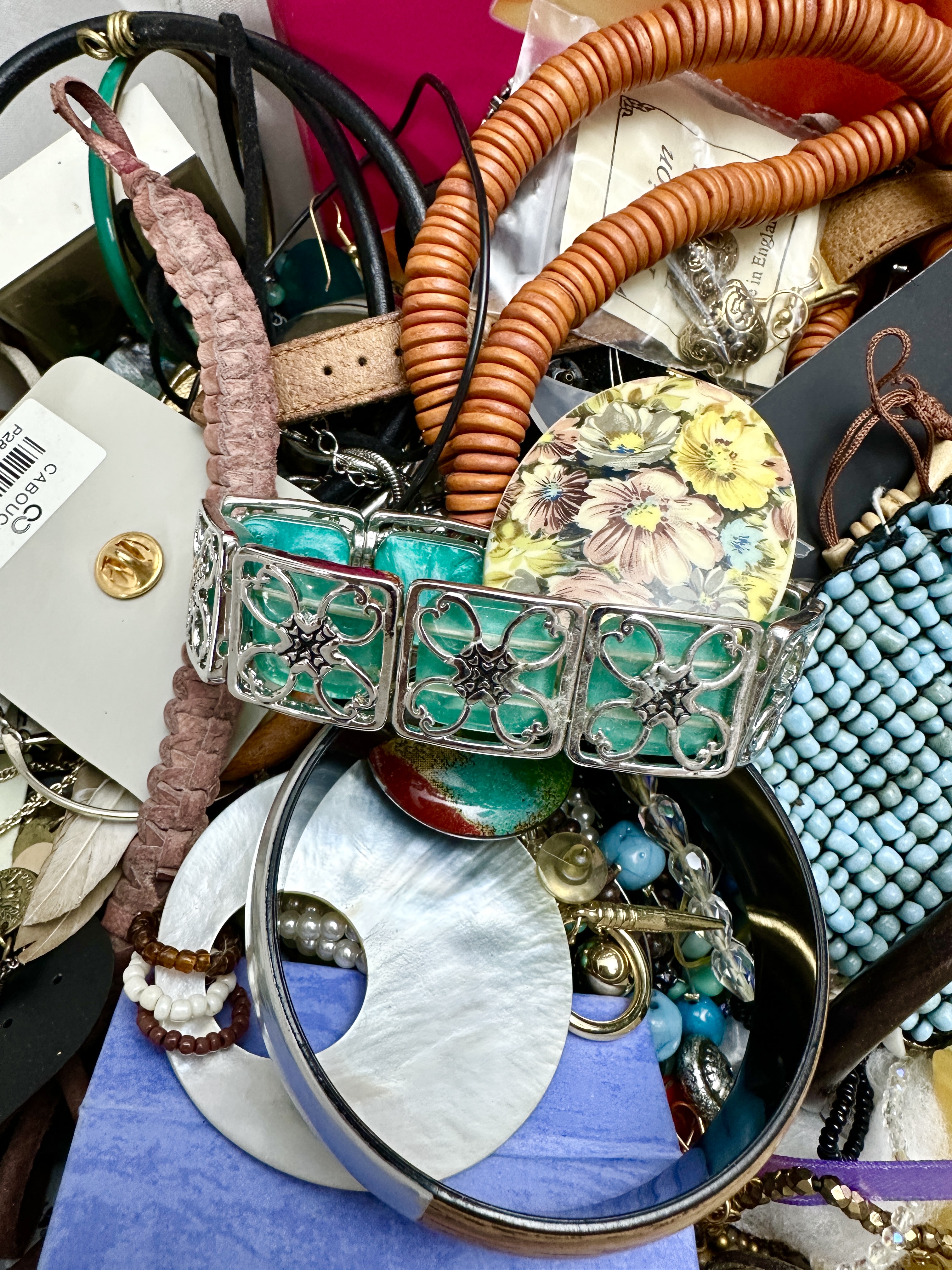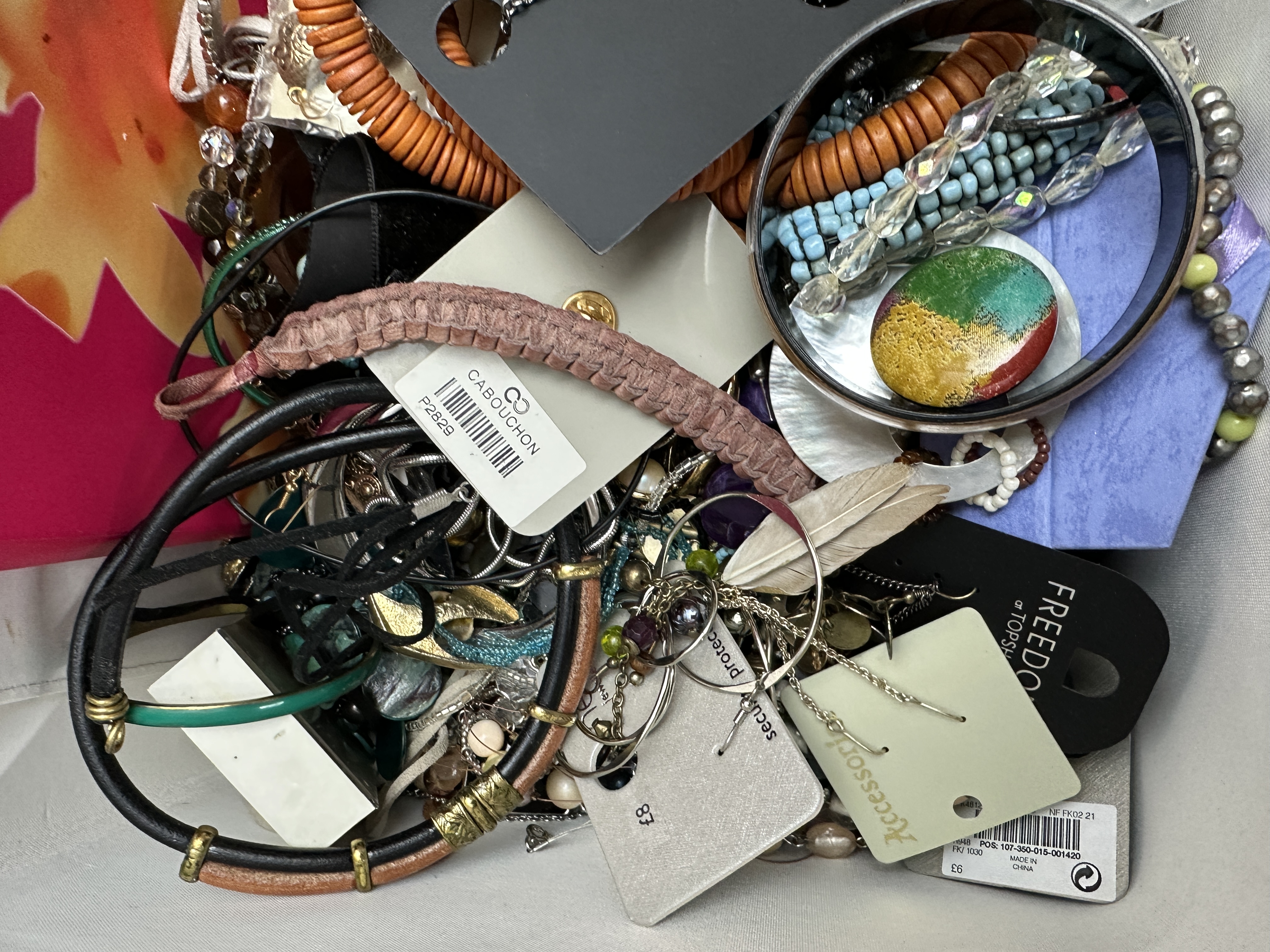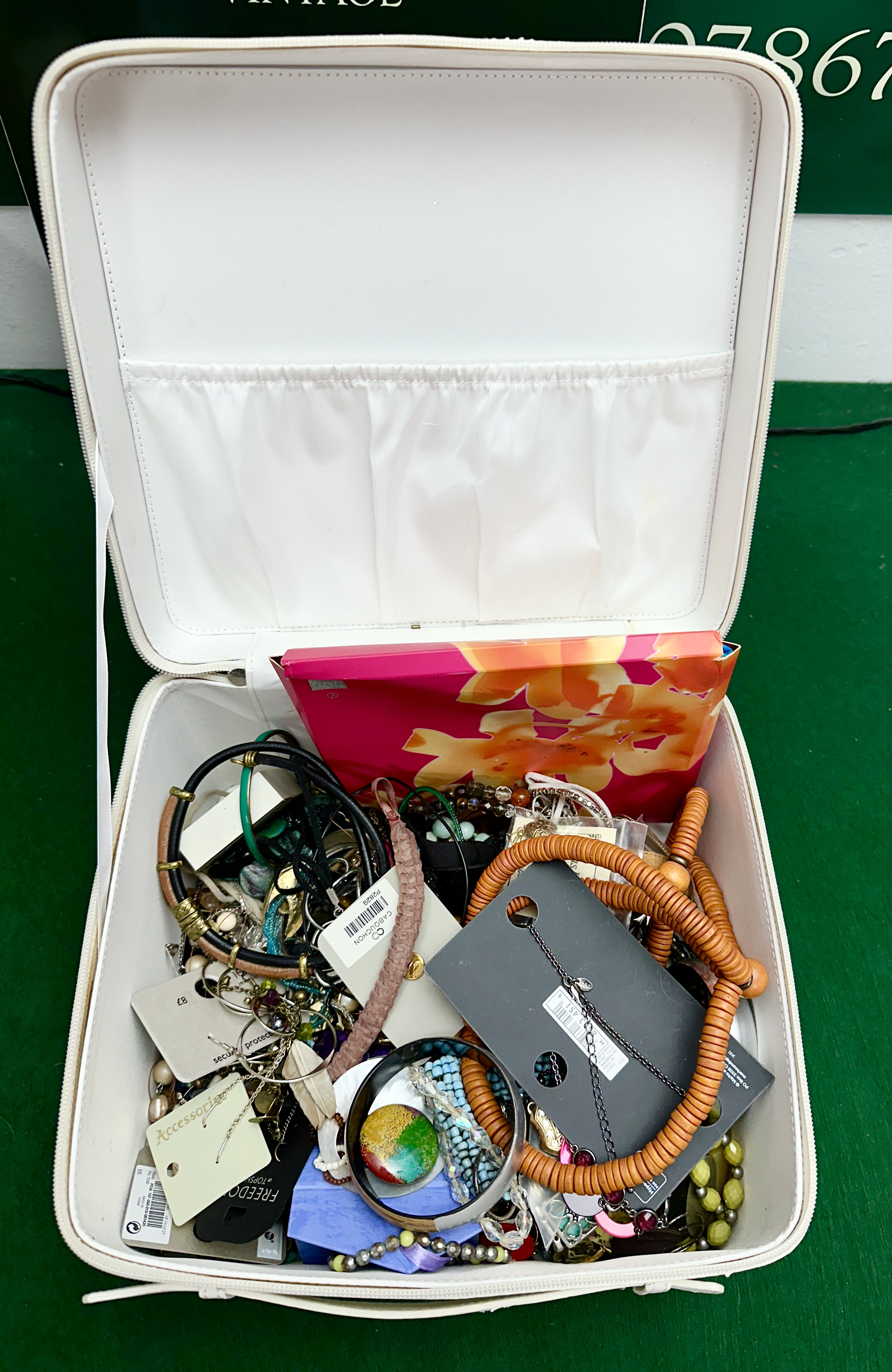 A diverse assortment of costume jewellery presented in a white textured faux-leather vanity case. The collection includes a variety of necklaces, notably a multi-strand orange wooden bead piece, alongside several bangles, cord bracelets, and multiple pairs of earrings. Several items remain on their original retail display cards, with brands including Cabouchon, Freedom at Topshop, and Accessorize. Specific items within the group include a silver-tone filigree bracelet set with green stones, a large iridescent shell-style ring, a small floral-patterned compact, and a vibrant pink and orange floral box. The vanity case features a dual-zipper closure and a top carrying handle.