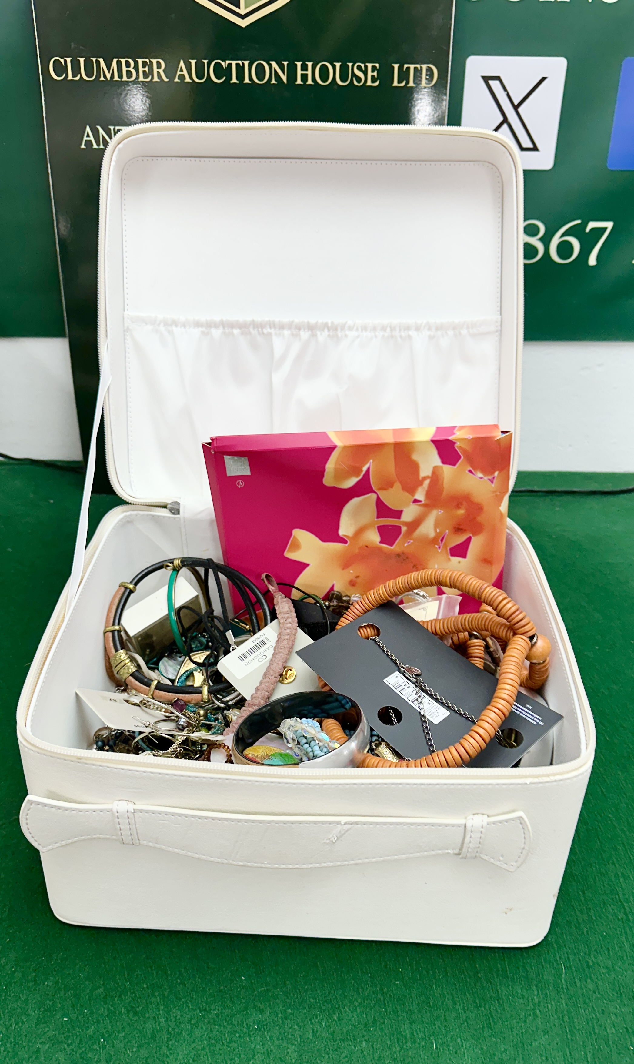The vanity case shows minor surface marks consistent with use. The jewellery pieces appear in overall good, used condition, with some items appearing unused on original retail cards.