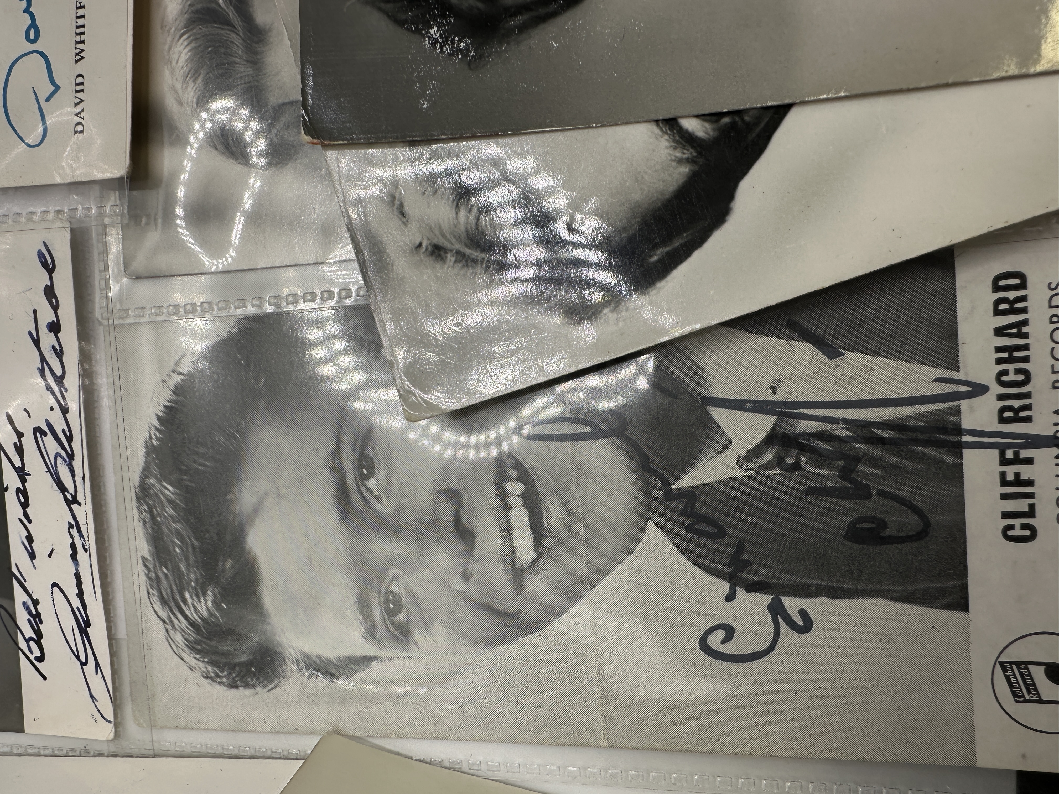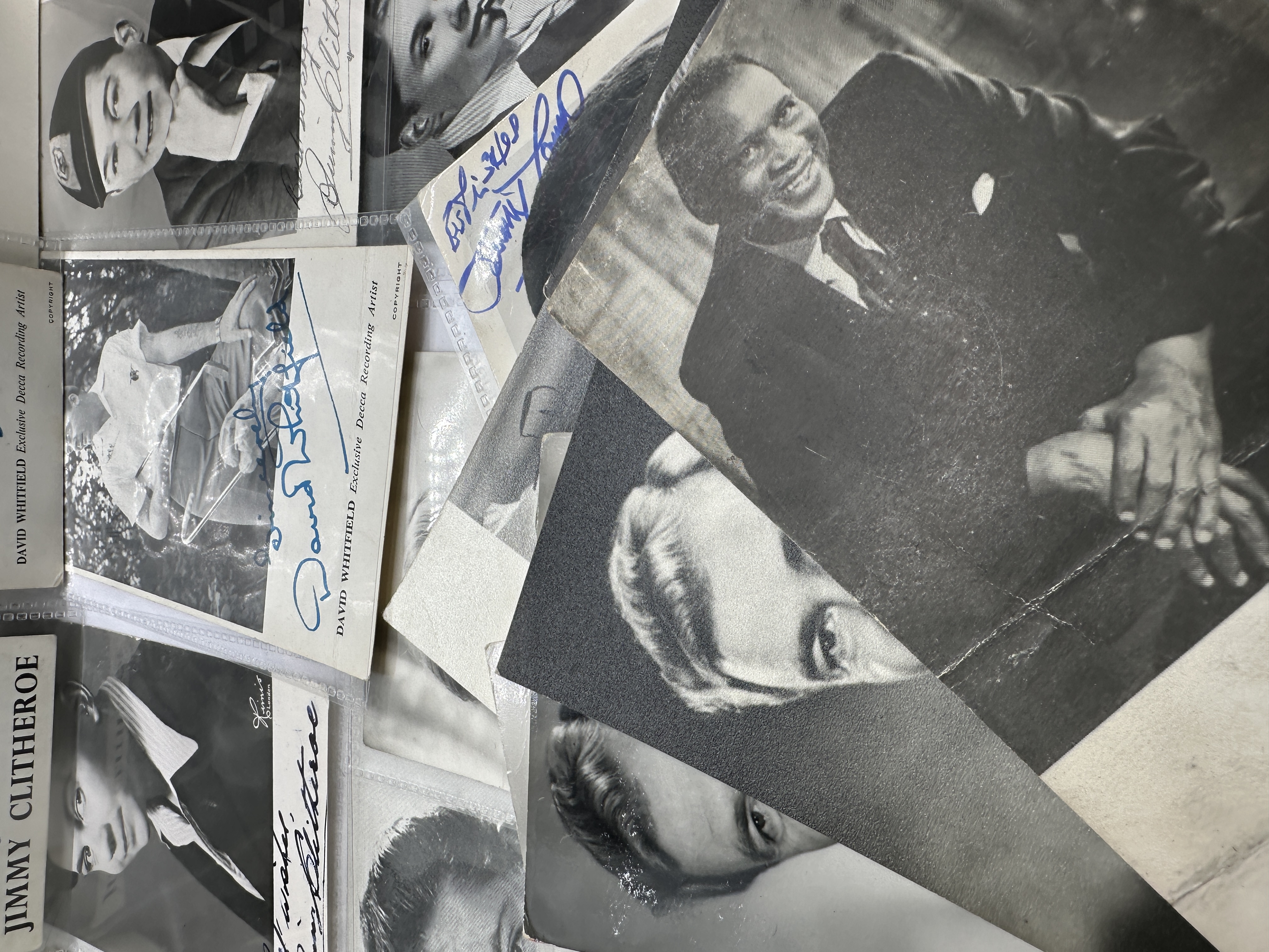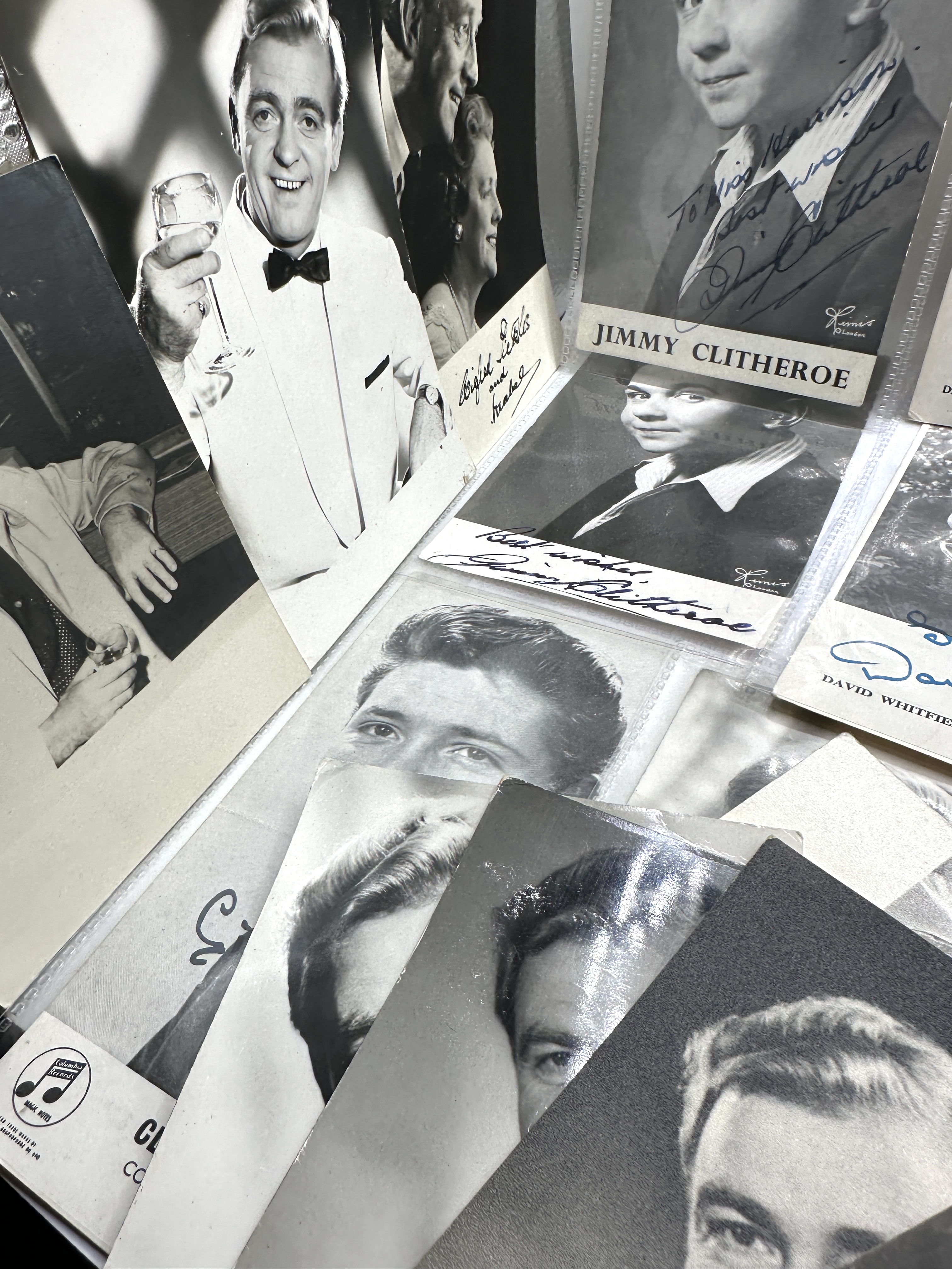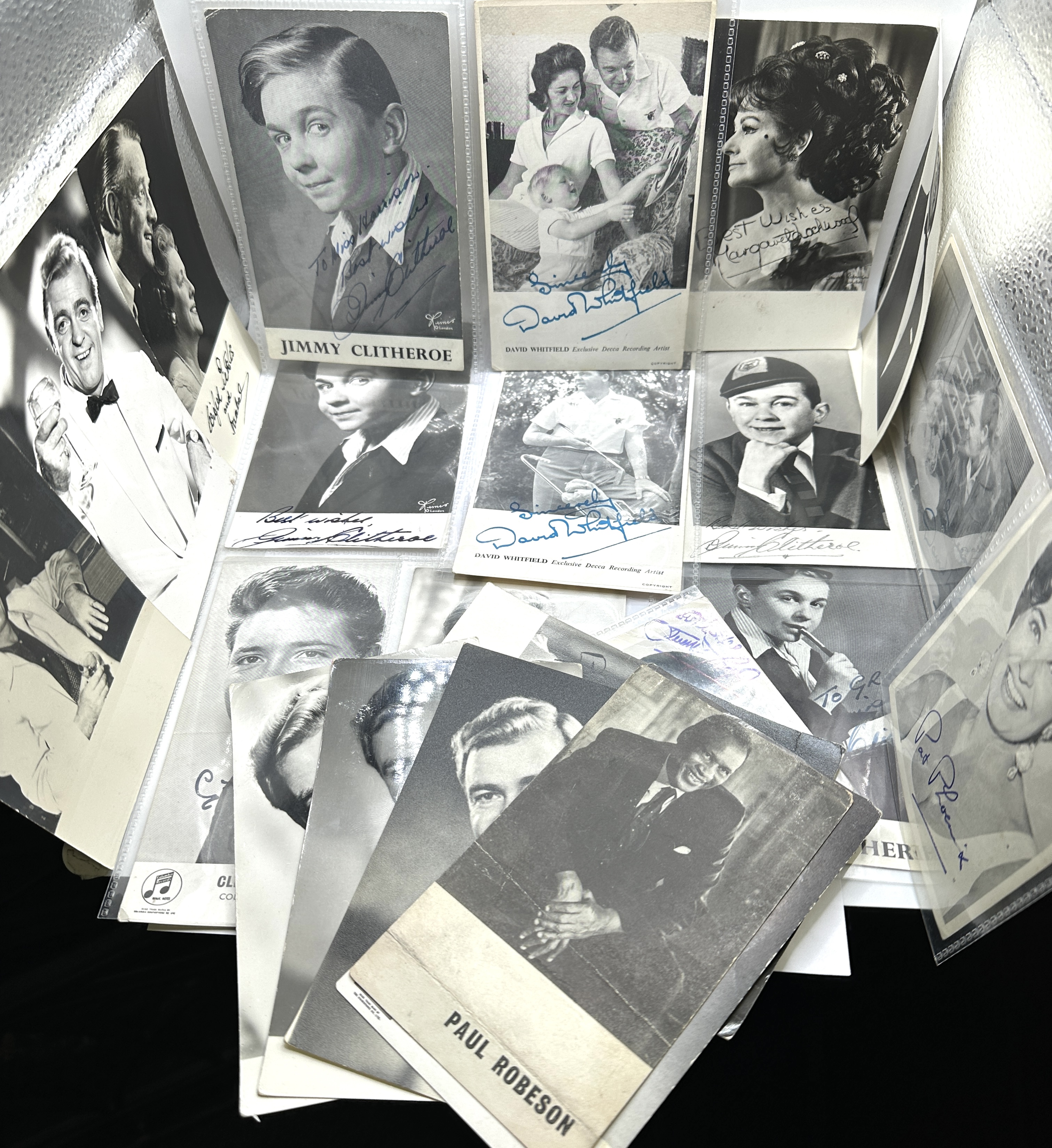 A collection of mid-20th-century black-and-white promotional photographs and postcards featuring various stage and screen entertainers. The group includes items relating to Jimmy Clitheroe, David Whitfield, Margaret Lockwood, Paul Robeson, Cliff Richard, and Pat Phoenix. Several pieces feature printed titles and credits, including David Whitfield as an Exclusive Decca Recording Artist and Cliff Richard for Columbia Records. Many items bear ink signatures and personal dedications such as Best wishes and To Miss Harrison. The collection is comprised of paper items, some of which are housed in clear plastic protective sleeves.