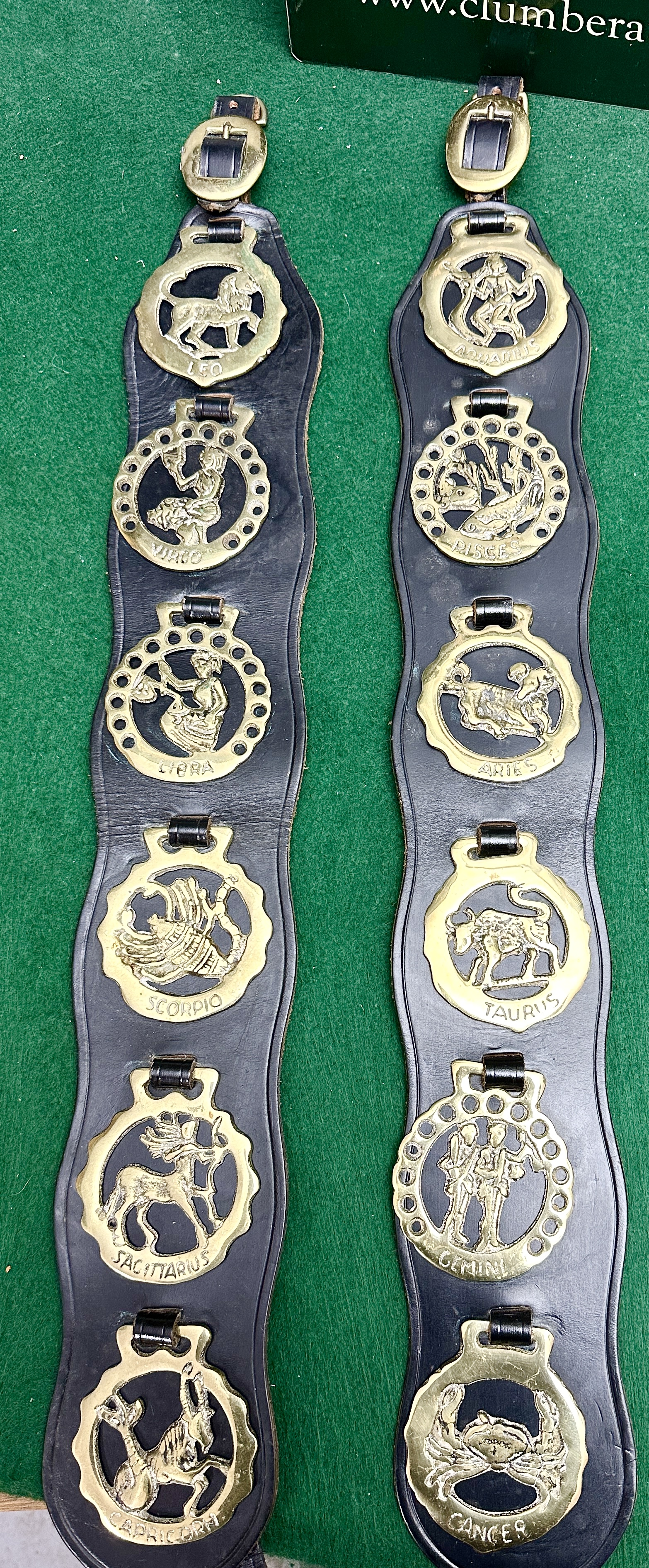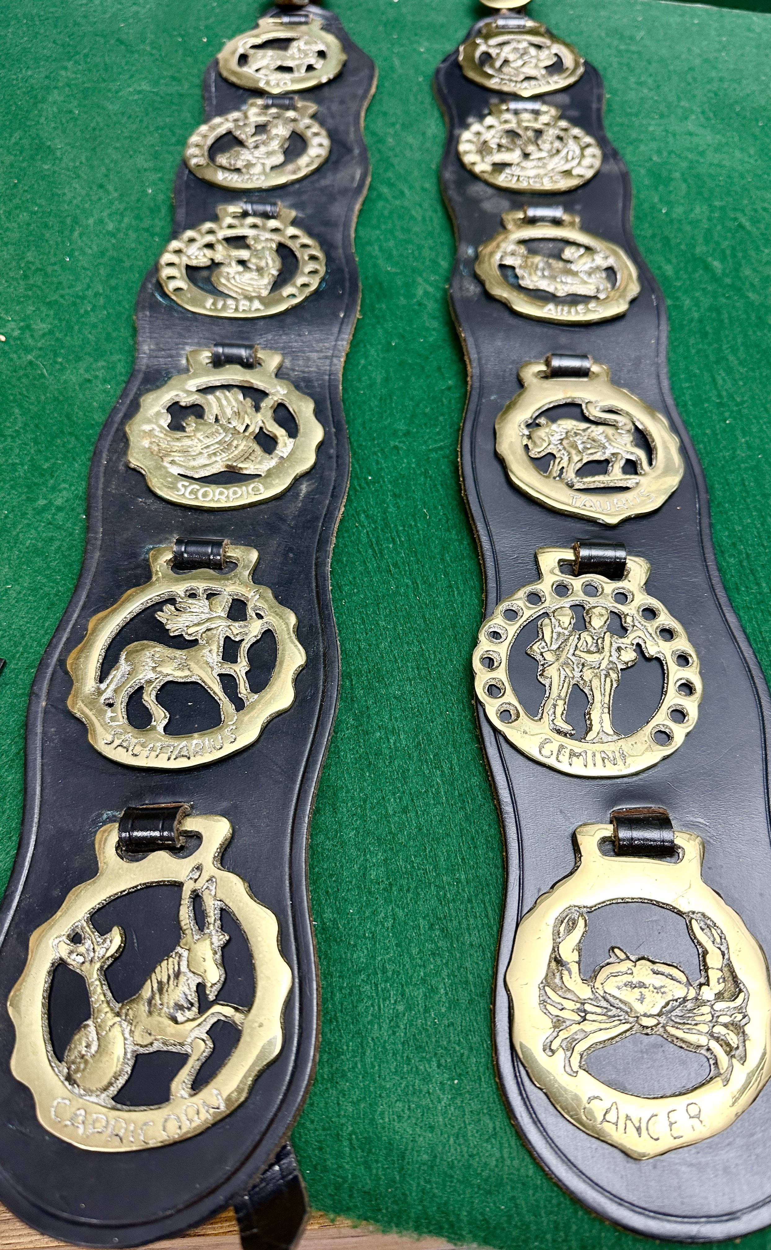 A pair of scalloped black leather martingale straps mounted with cast brass horse brasses. The collection features the twelve signs of the zodiac: Leo, Virgo, Libra, Scorpio, Sagittarius, Capricorn, Aquarius, Pisces, Aries, Taurus, Gemini, and Cancer. Each ornament has the name of the sign cast into the lower border. The brasses are secured to the leather straps via individual leather loops. One strap is fitted with a brass buckle at the top. These items represent traditional equestrian decorative harness ornaments.