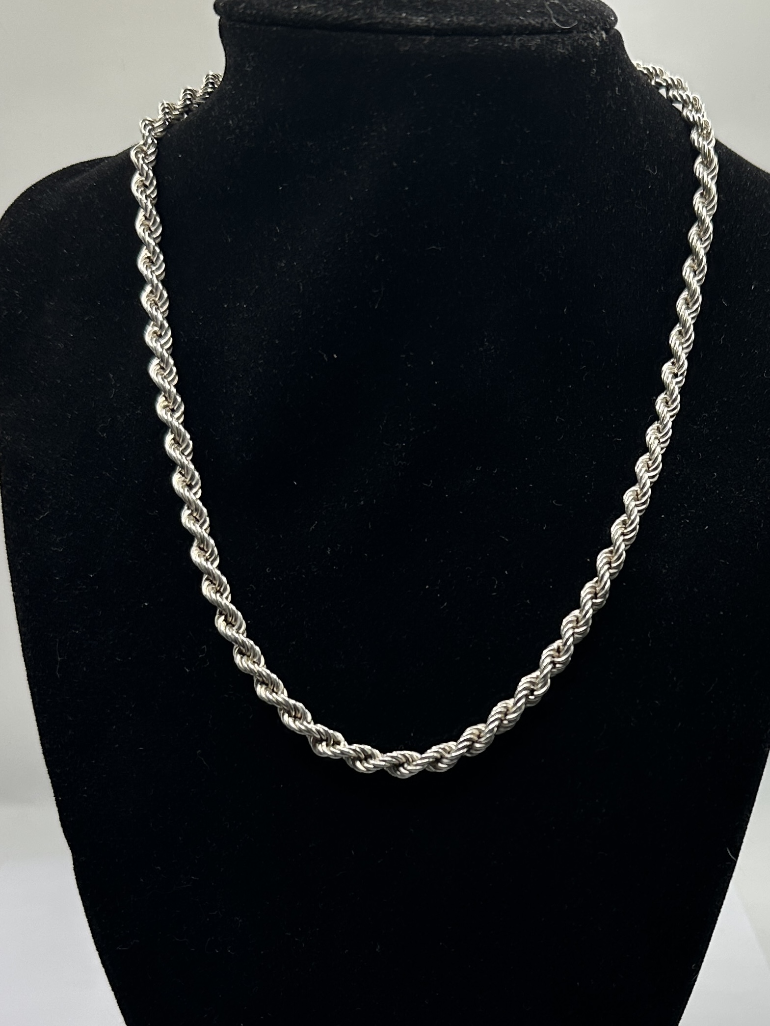 A solid 925 silver rope chain necklace featuring a classic twisted design of interwoven links. The piece is constructed from 925 silver