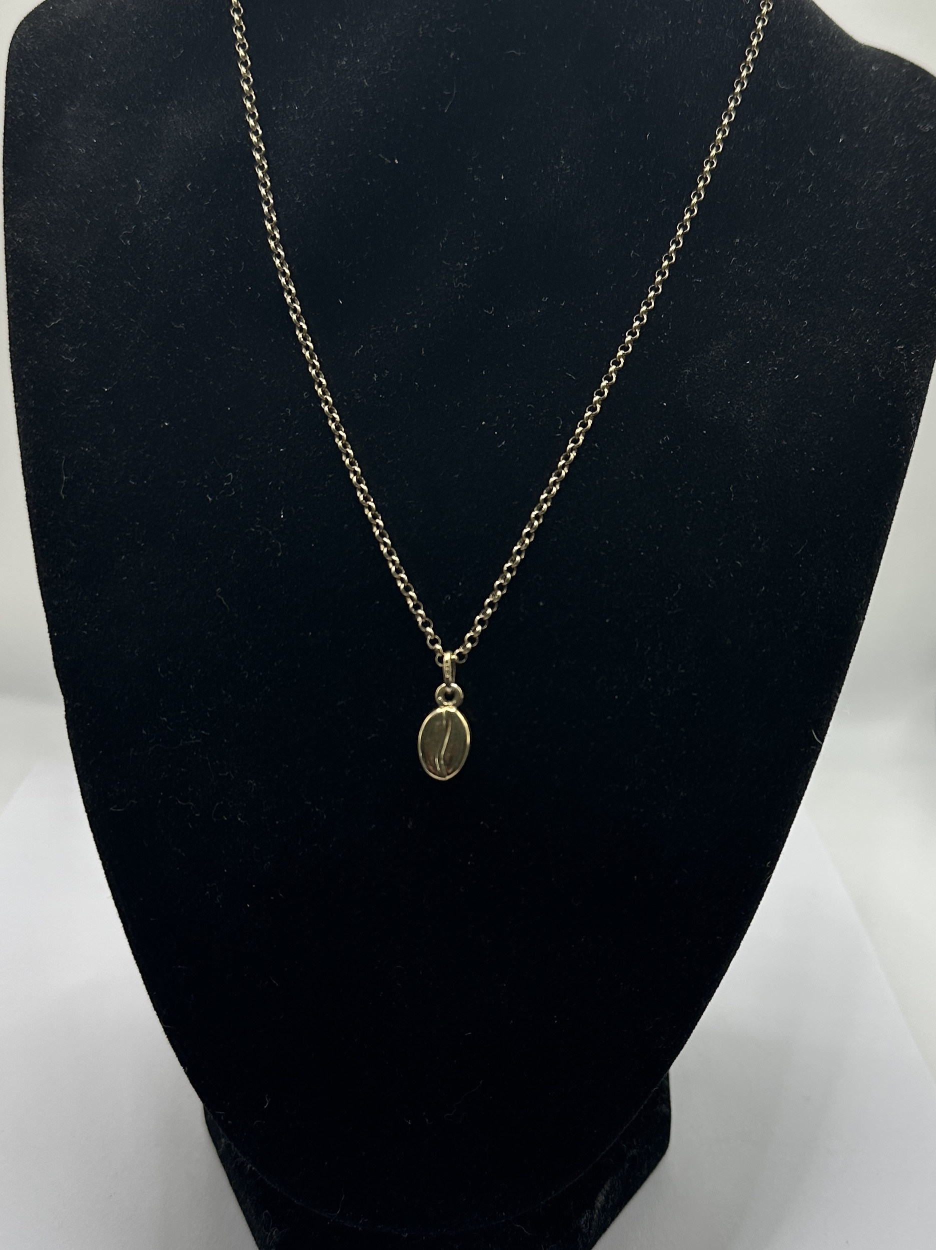 A 9ct gold necklace featuring a three-dimensional pendant designed in the form of a coffee bean. The oval-shaped pendant is detailed with a characteristic central cleft and is suspended by a simple bail from a fine rolo-link chain. The jewellery presents a polished finish throughout. A small mark is visible on the pendant bail, though it remains illegible.