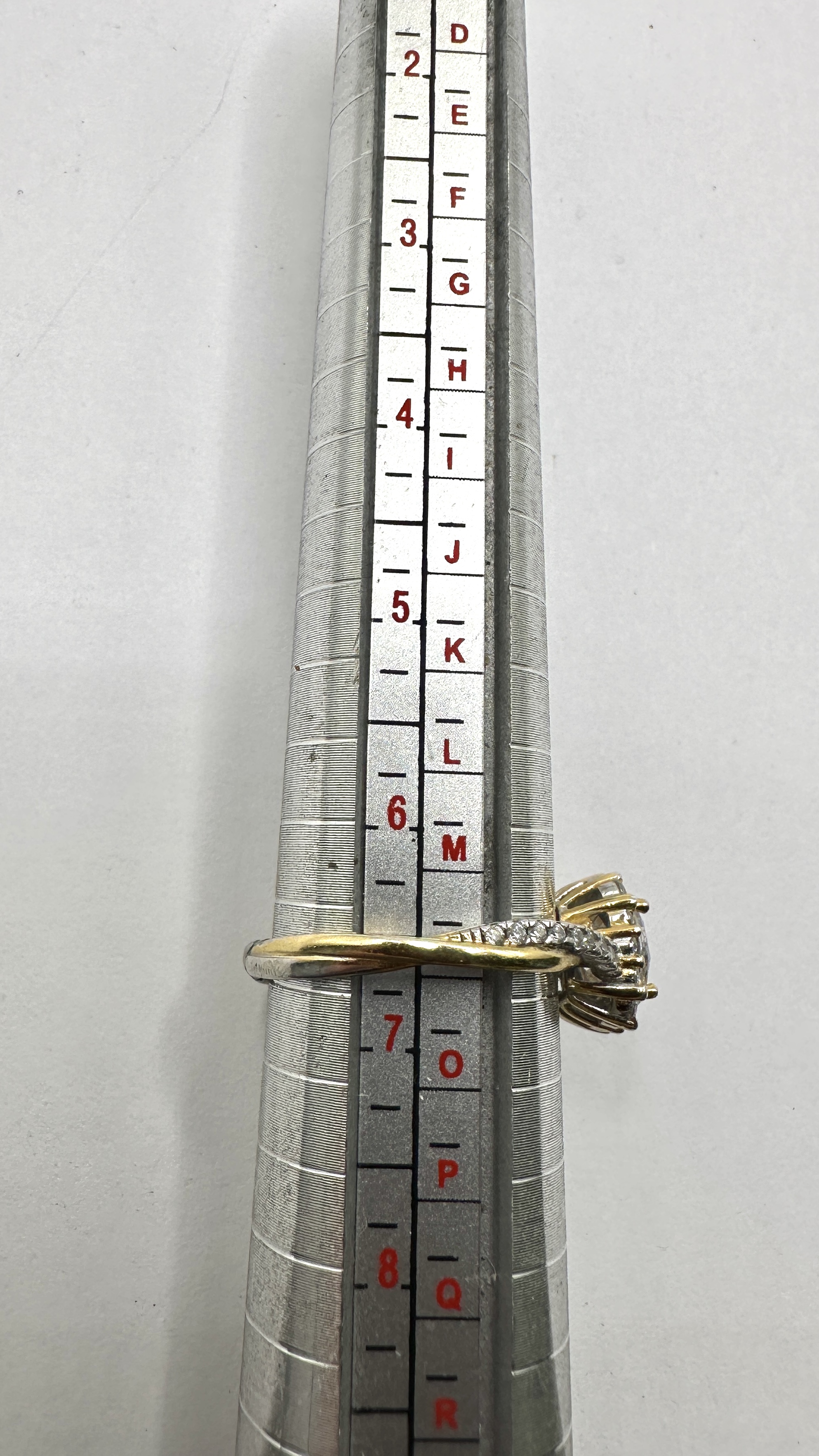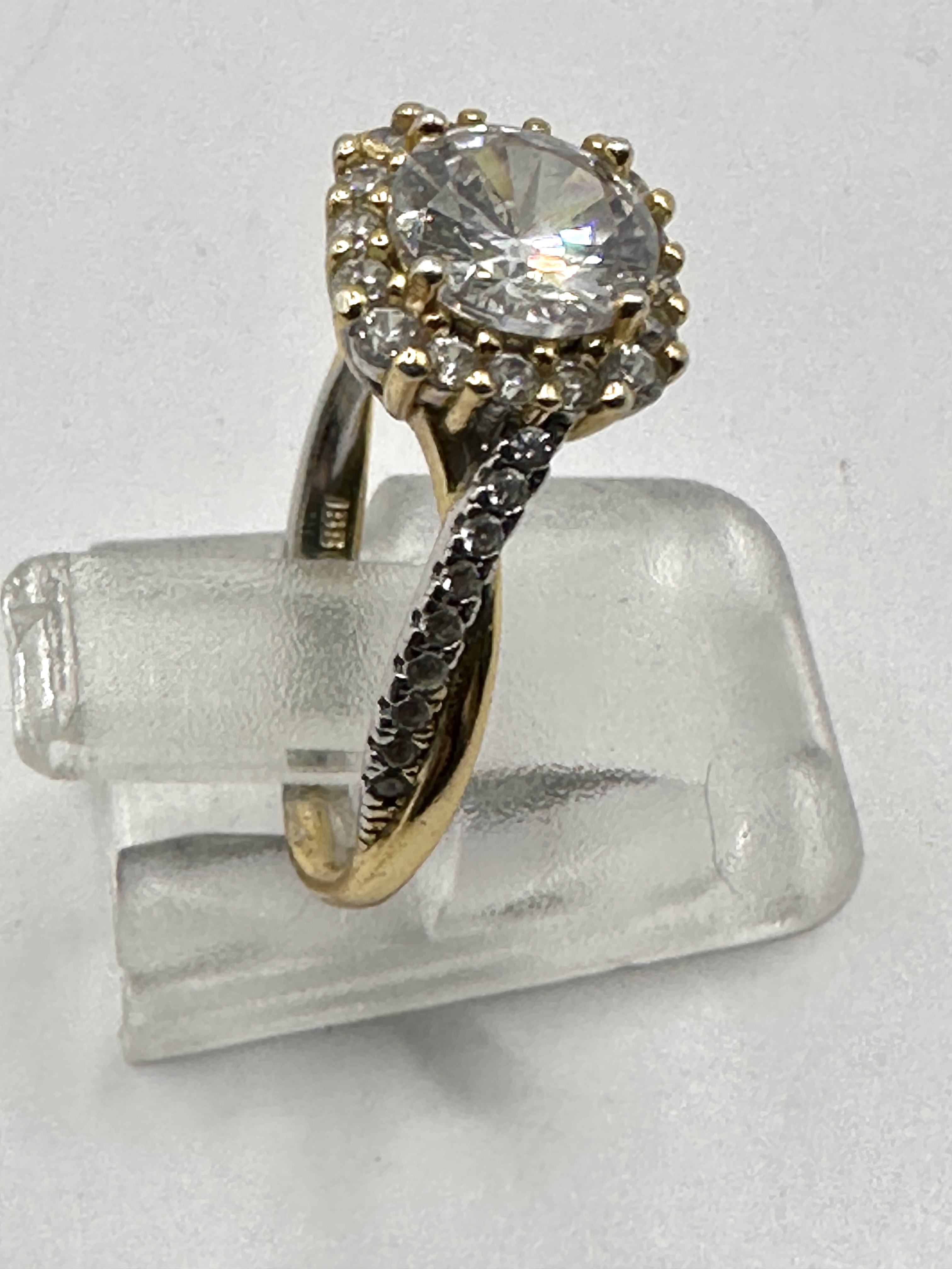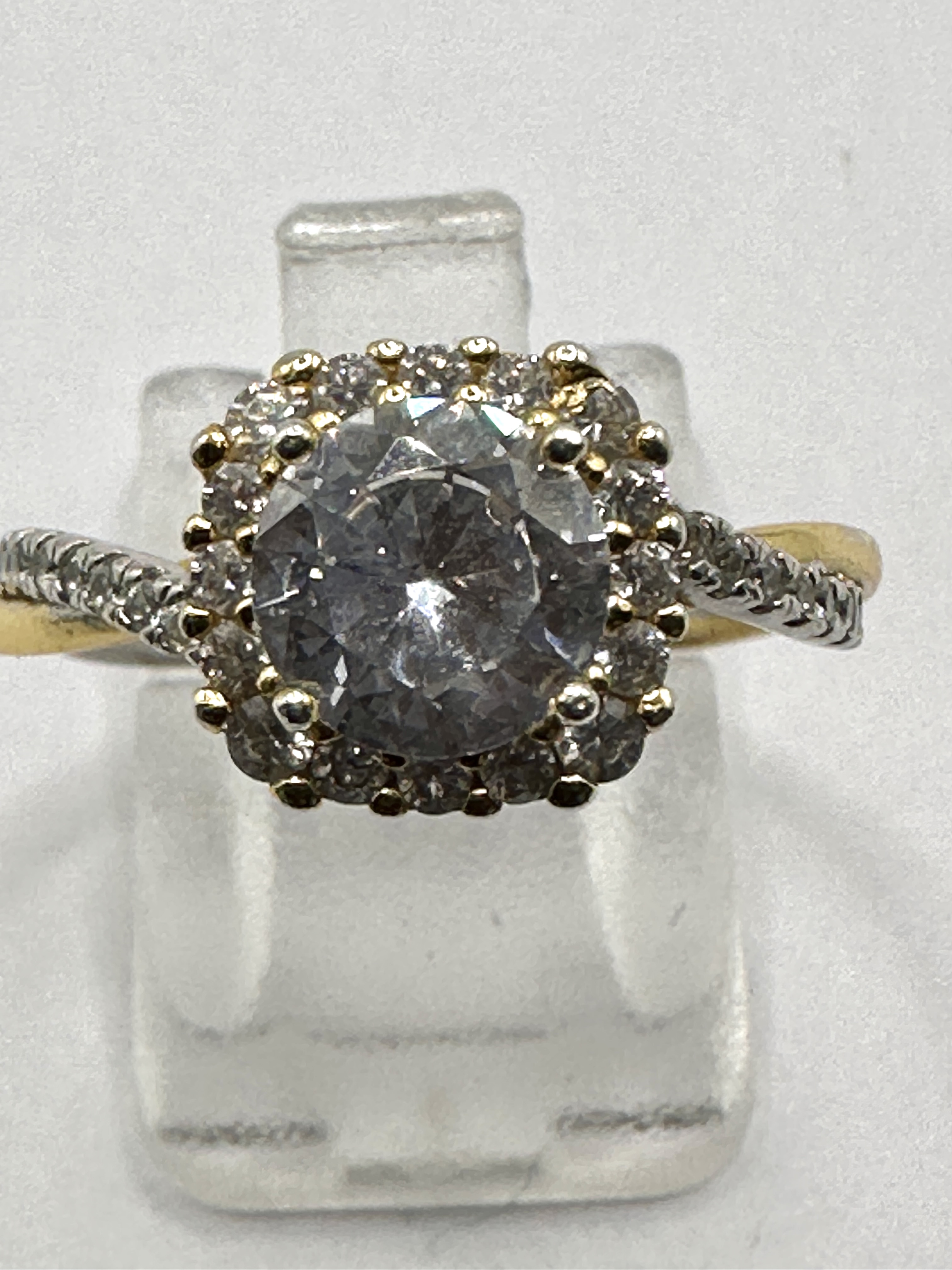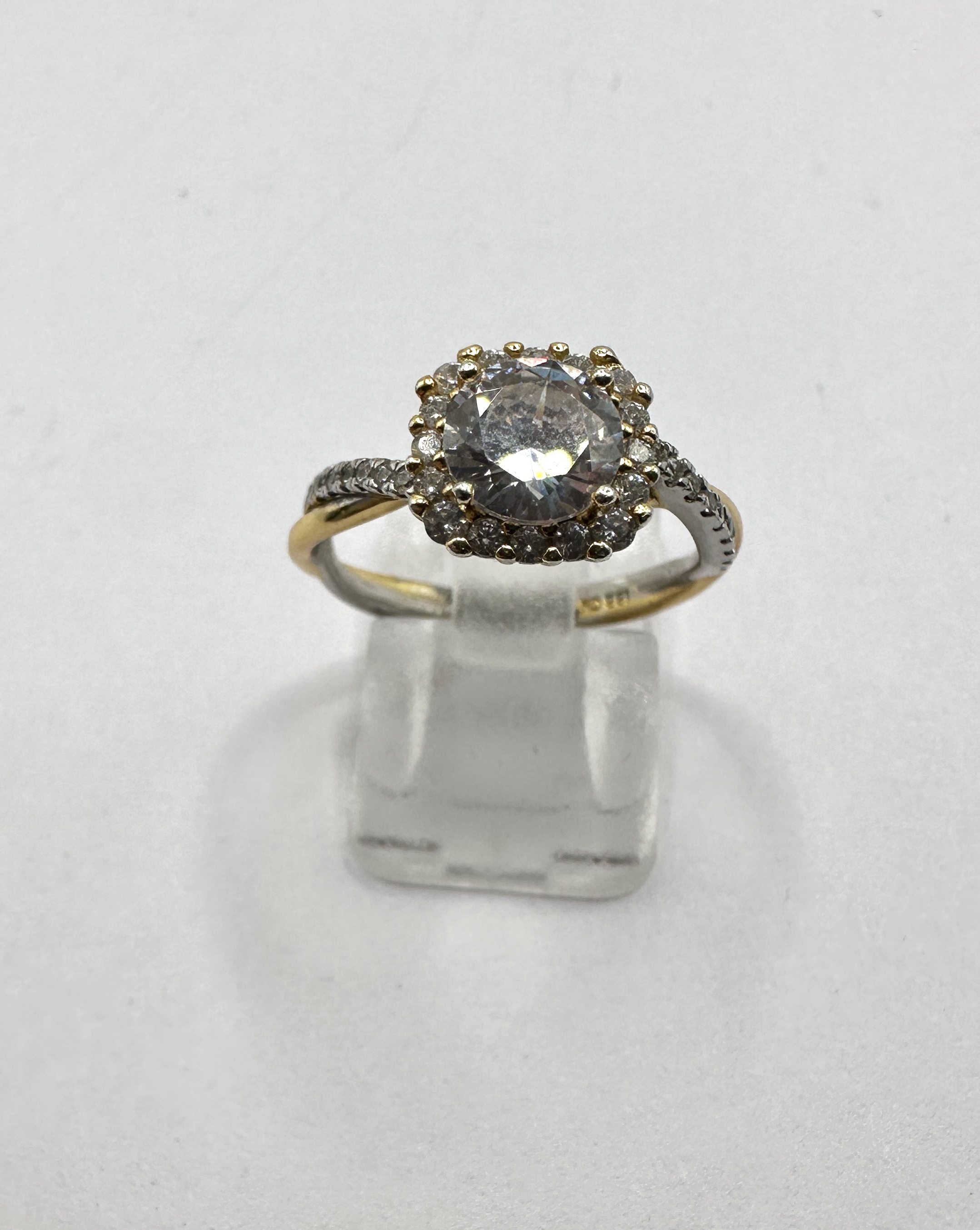 A 9 carat two-tone gold ring featuring a central round-cut clear gemstone. The primary stone is secured in a multi-claw setting and encircled by a halo of smaller round-cut stones. The shank is designed in a twisted bypass form, pairing a white gold strand set with pavé stones and a plain yellow gold strand. The interior of the band is stamped.