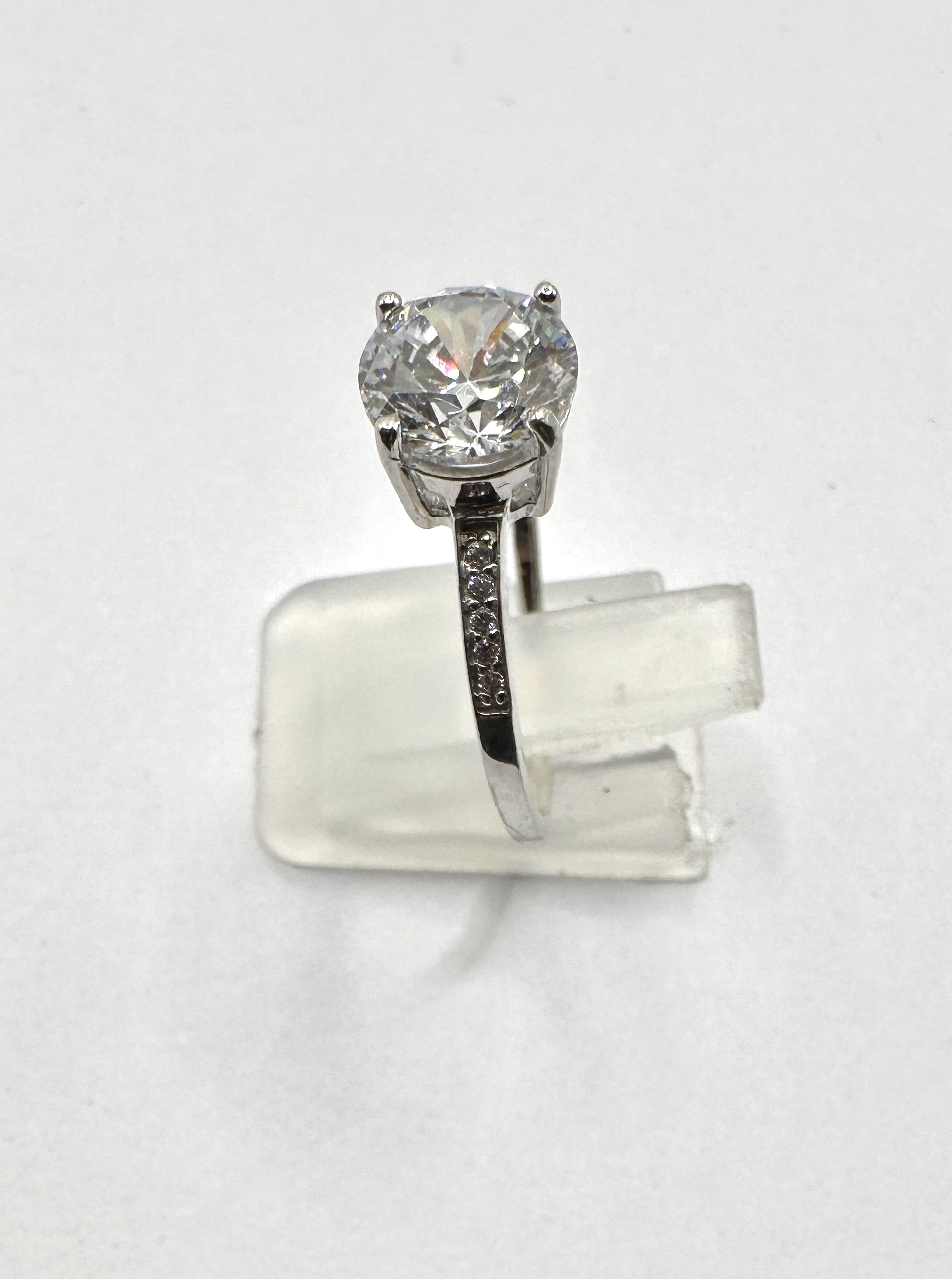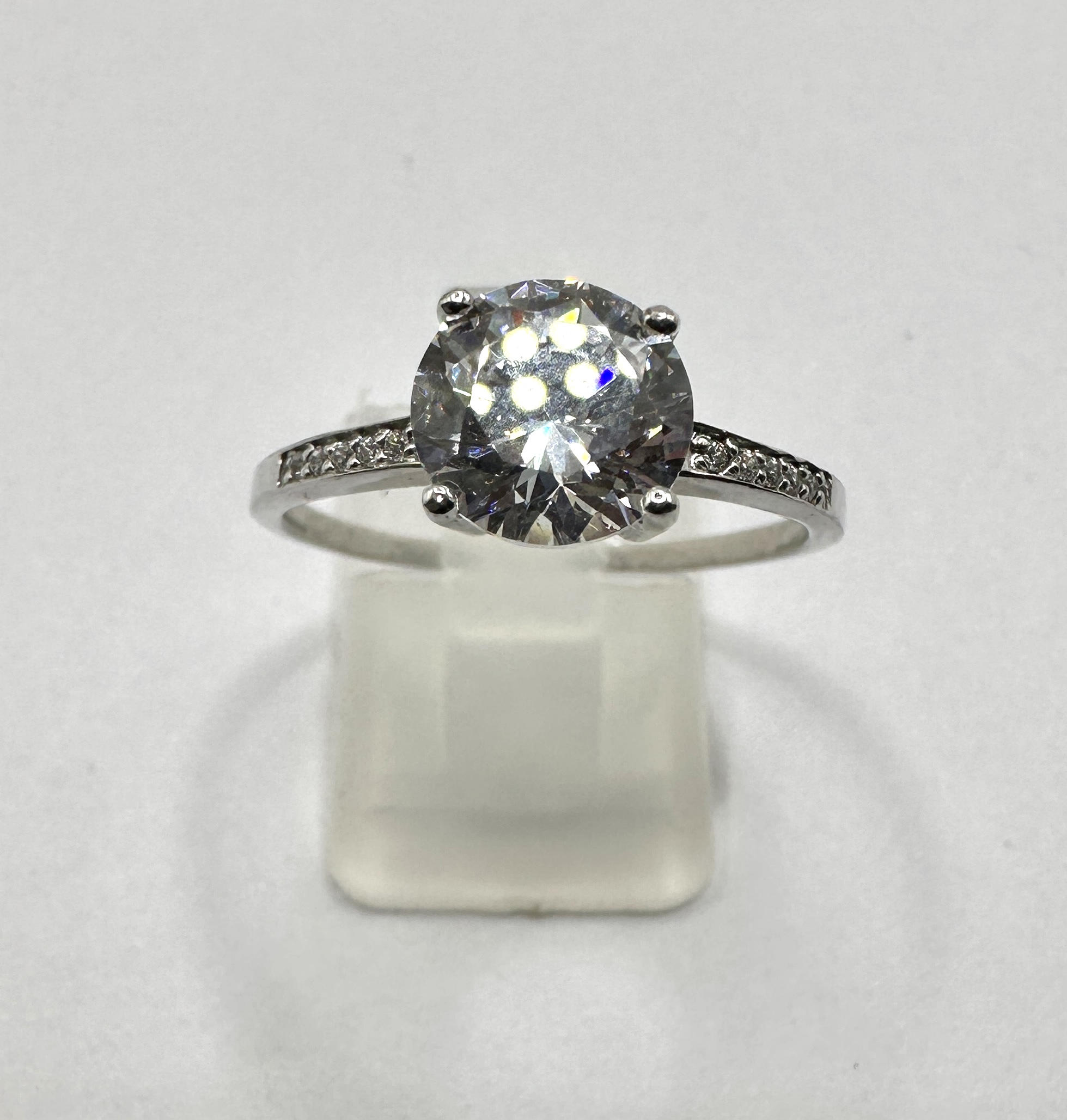 This solitaire-style ring is crafted from 925 silver and features a large round brilliant-cut colourless centre stone. The stone is secured in a four-prong basket setting. The polished band is further detailed with small round colourless accent stones inset along the shoulders. The piece exhibits a classic modern design.
