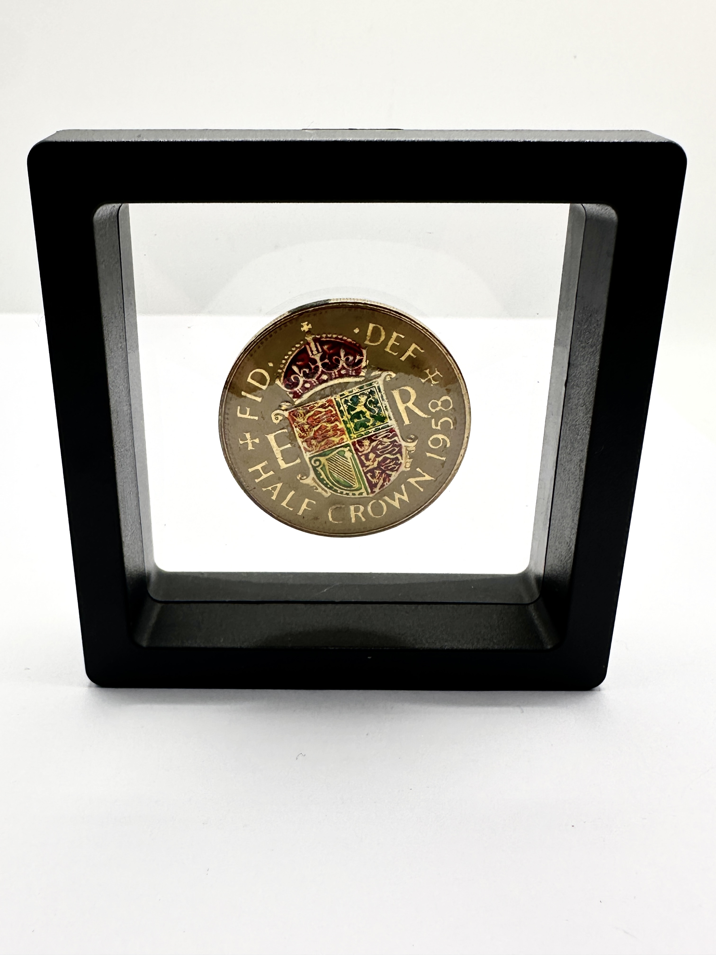 A British 1958 Queen Elizabeth II half crown coin, struck in 925 silver and modified with selective gold-tone plating and polychrome enamel for decorative display. The reverse depicts the crowned royal shield of arms accented with red, green, and blue enamel, flanked by the E R cypher and the inscriptions FID DEF and HALF CROWN 1958. The obverse displays a gold-toned laureate portrait of the Queen set against a blackened field, encircled by the legend ELIZABETH II DEI GRATIA REGINA. The coin is presented suspended within a contemporary black square 3D floating display frame.