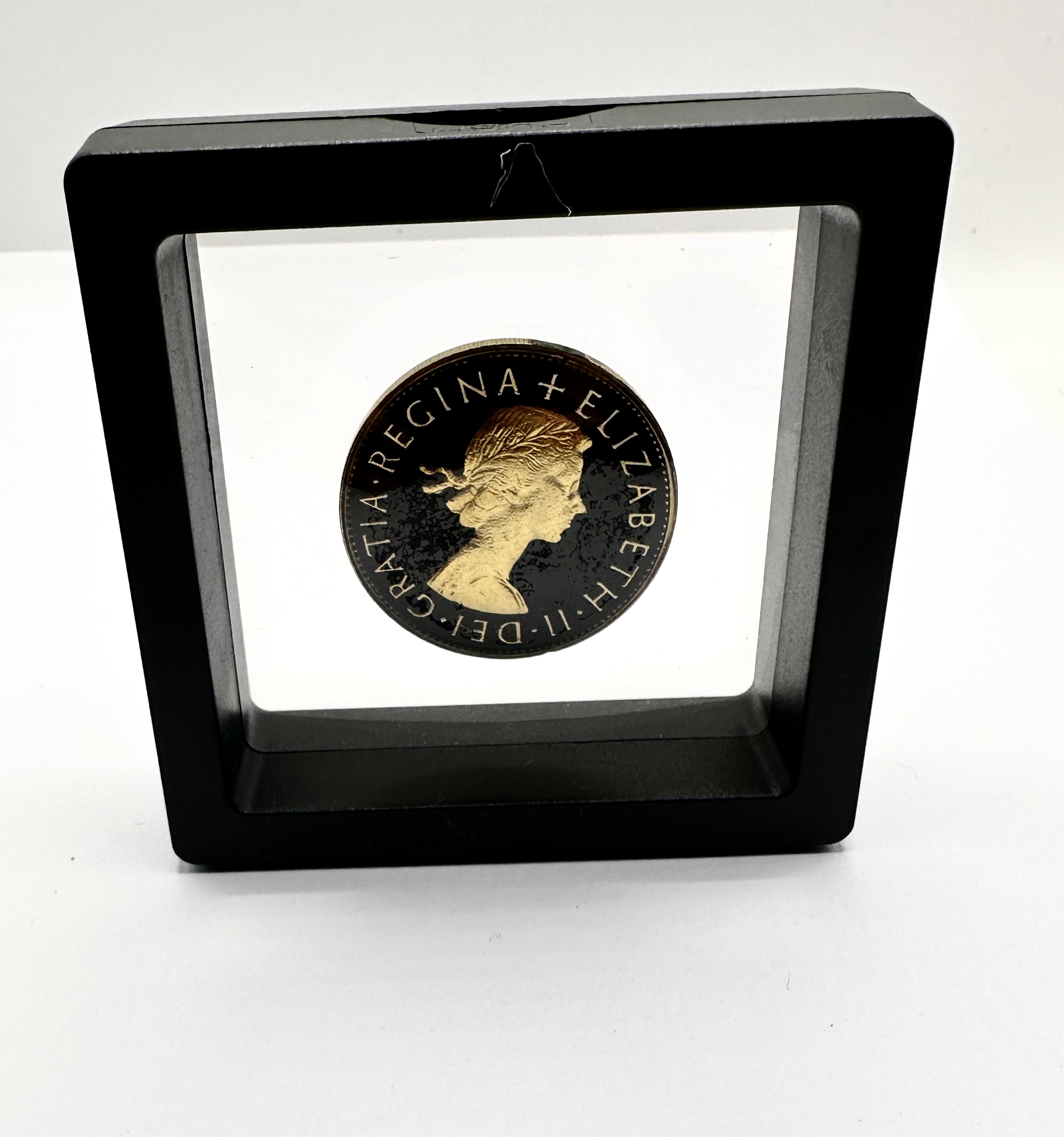 The coin appears in good condition with intentional decorative finishes. The display frame shows minor signs of use and light surface wear.