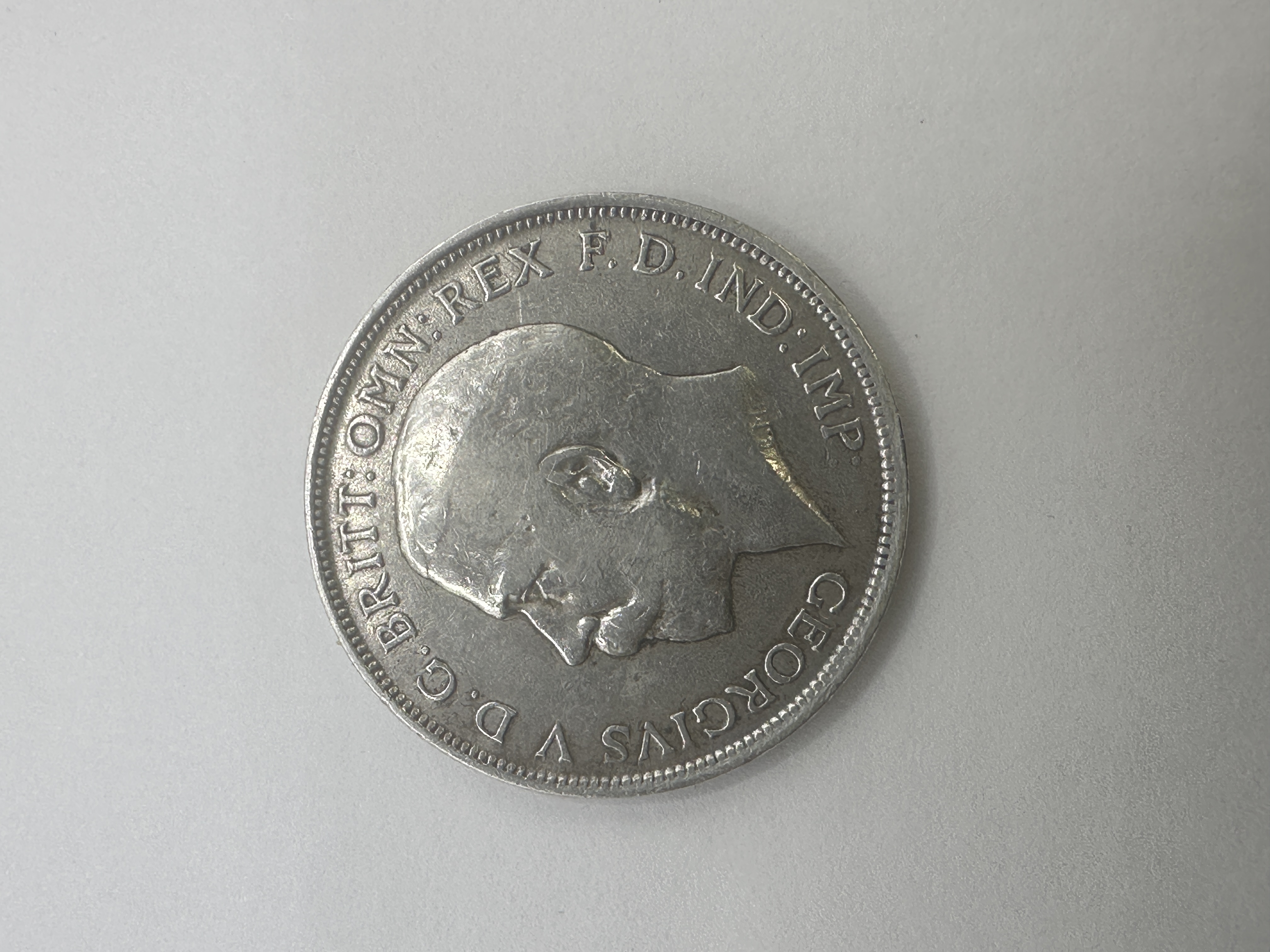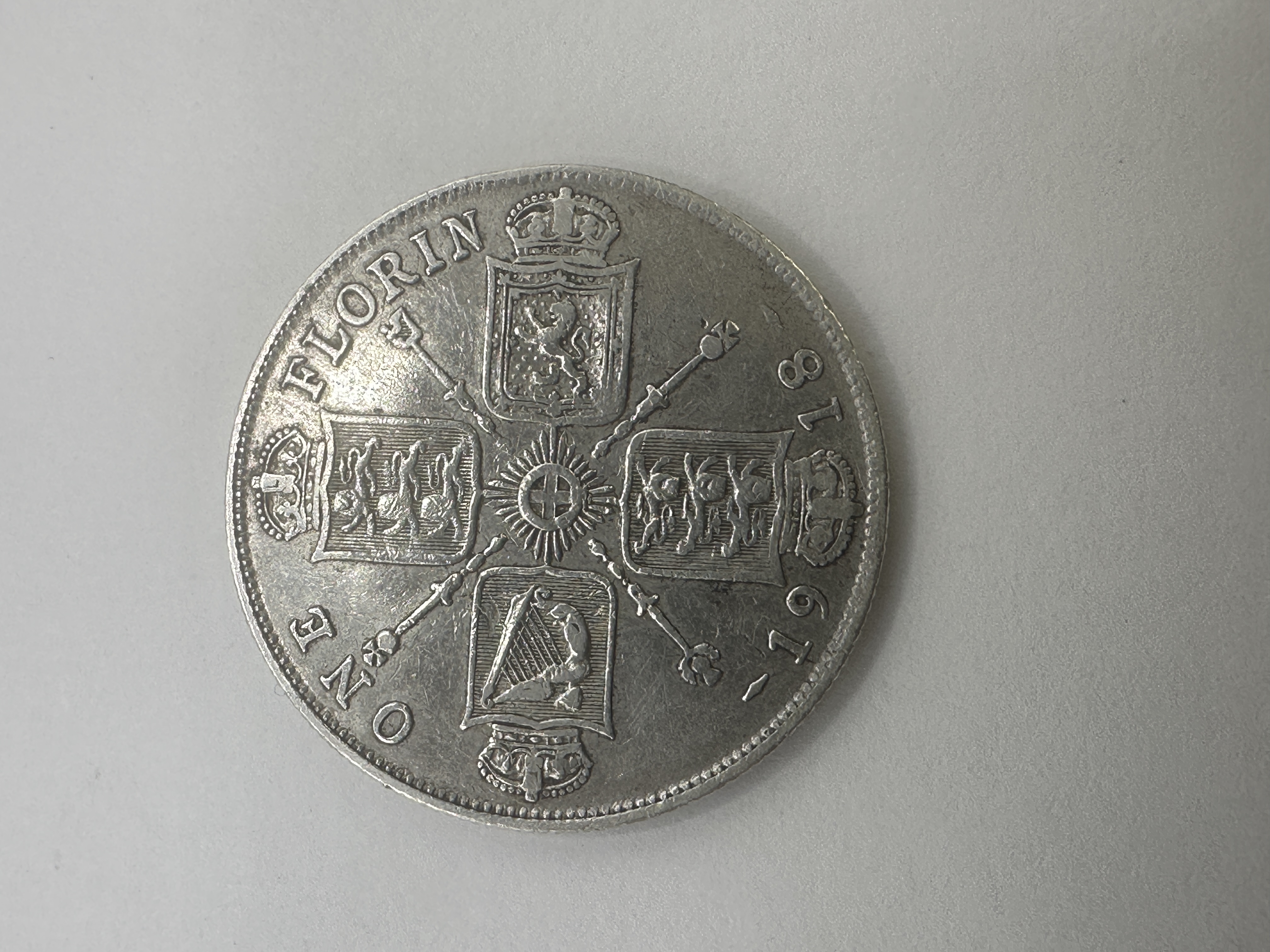 A 1918 British silver florin (two-shilling) coin dating from the reign of King George V. The coin is struck in 925 silver. The obverse features a left-facing uncrowned portrait of the King, surrounded by the Latin inscription GEORGIVS V D. G. BRITT: OMN: REX F. D. IND: IMP. The reverse displays four crowned cruciform shields representing England, Scotland, and Ireland, with sceptres in the angles and a central Garter star. The reverse is inscribed with the denomination ONE FLORIN and the date 1918.
