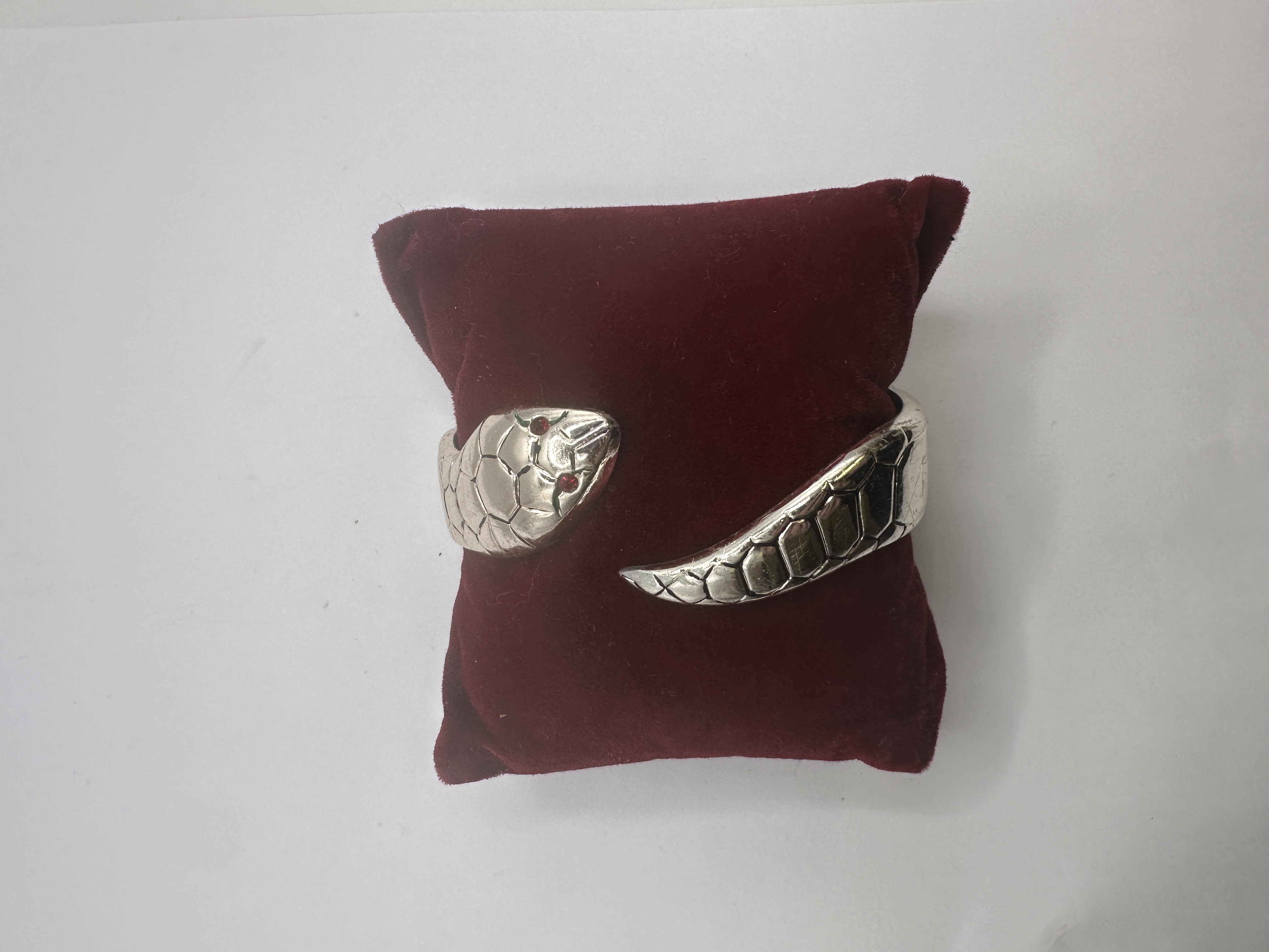 A silver-toned metal cuff bracelet featuring a bypass serpent motif. The piece is designed with an engraved scale-like pattern across the body, terminating in a tapered tail and a stylized snake head. The head is set with two small, faceted red stones for eyes. The polished metal surfaces are finished in a bright silver tone. No hallmarks or maker’s marks are visible on the piece. This item of jewellery is presented on a burgundy velvet display cushion.