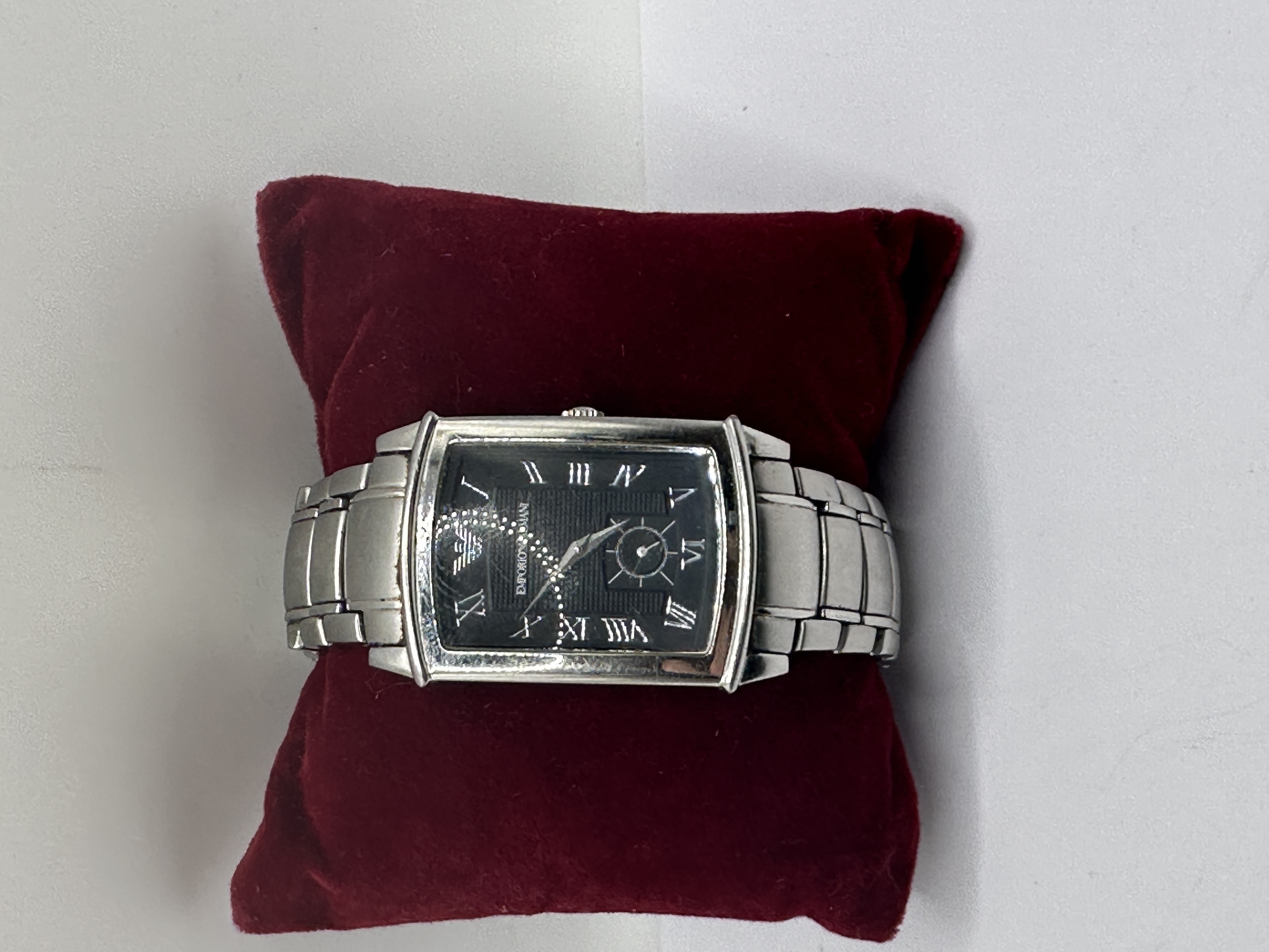 An Emporio Armani AR-0245 stainless steel wristwatch featuring a rectangular tank-style case. The black textured dial is set with silver-tone Roman numeral indices and includes a small seconds sub-dial positioned at the six o’clock position. The dial also displays the brand’s eagle logo. The watch is fitted with a matching stainless steel link bracelet and an analogue quartz movement. The item is presented on a red velvet display cushion.
