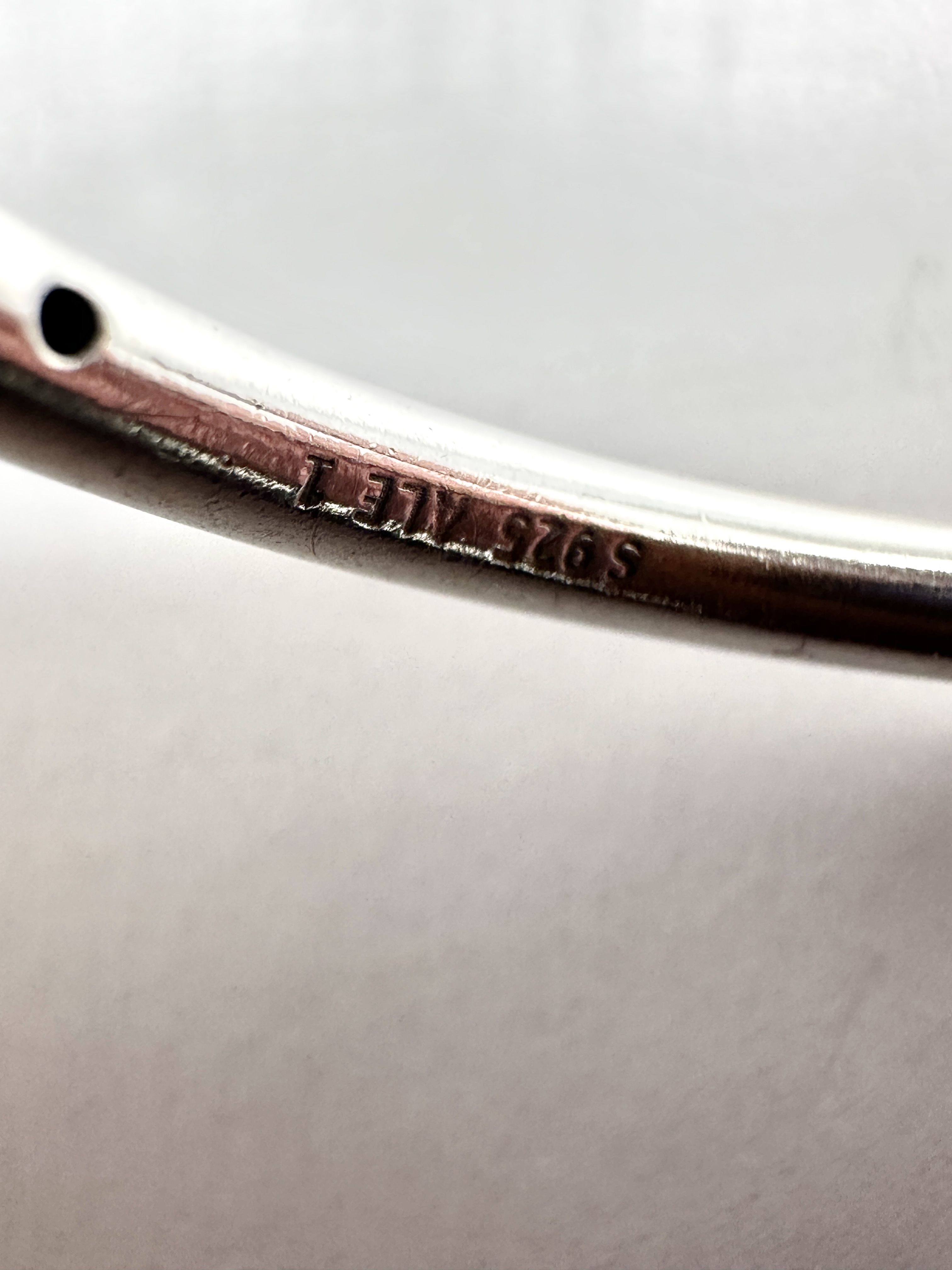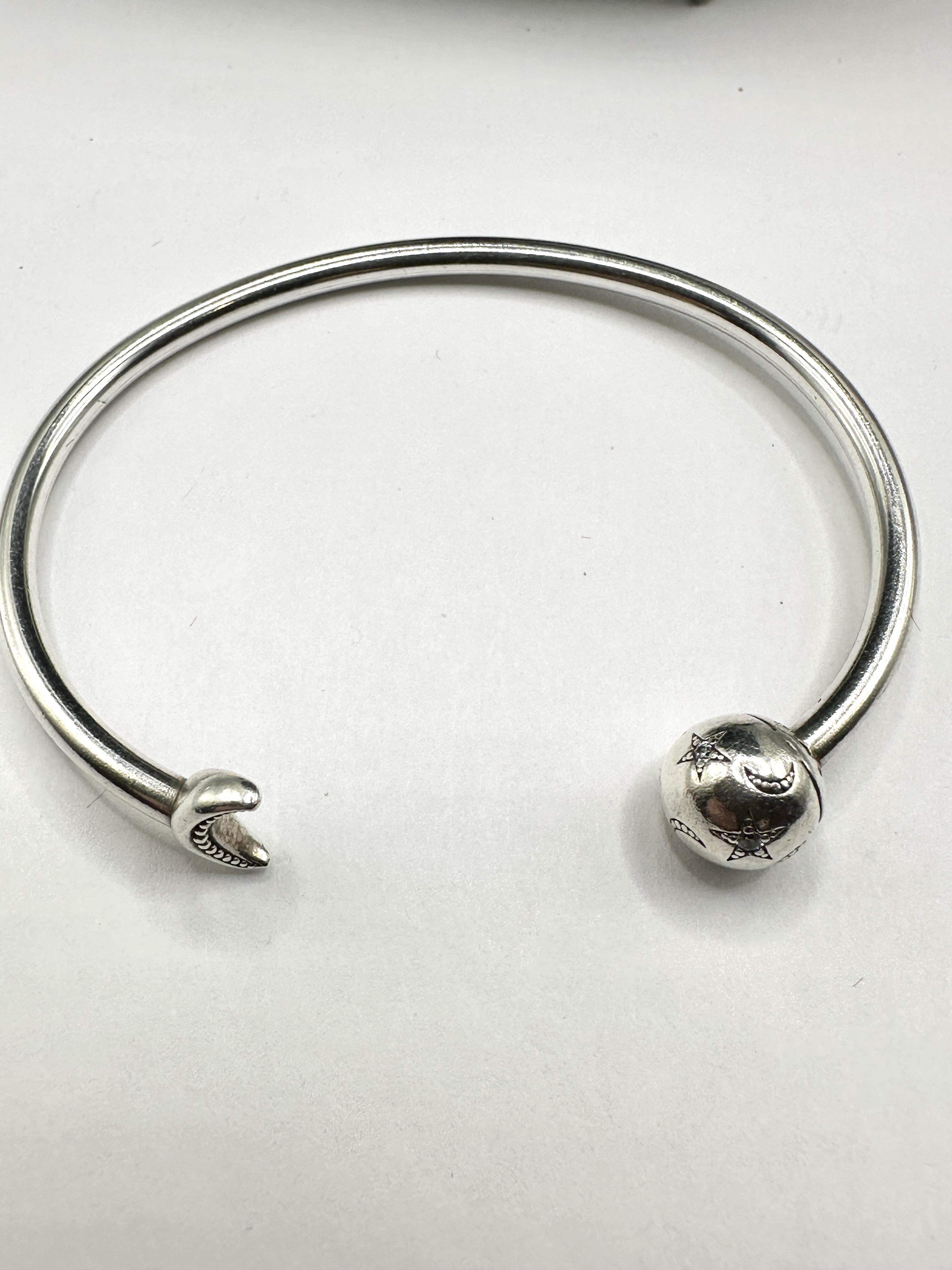 A Pandora Moon and Stars open bangle bracelet manufactured from 925 silver. The open cuff design terminates at one end with a crescent moon motif and at the other with a spherical orb. The orb is decorated with etched star and crescent moon patterns, with specific stars featuring inset clear accent stones. The interior of the band is stamped with the hallmarks S925 ALE 1, denoting the silver purity and the maker mark for Pandora. The piece features a polished finish throughout.