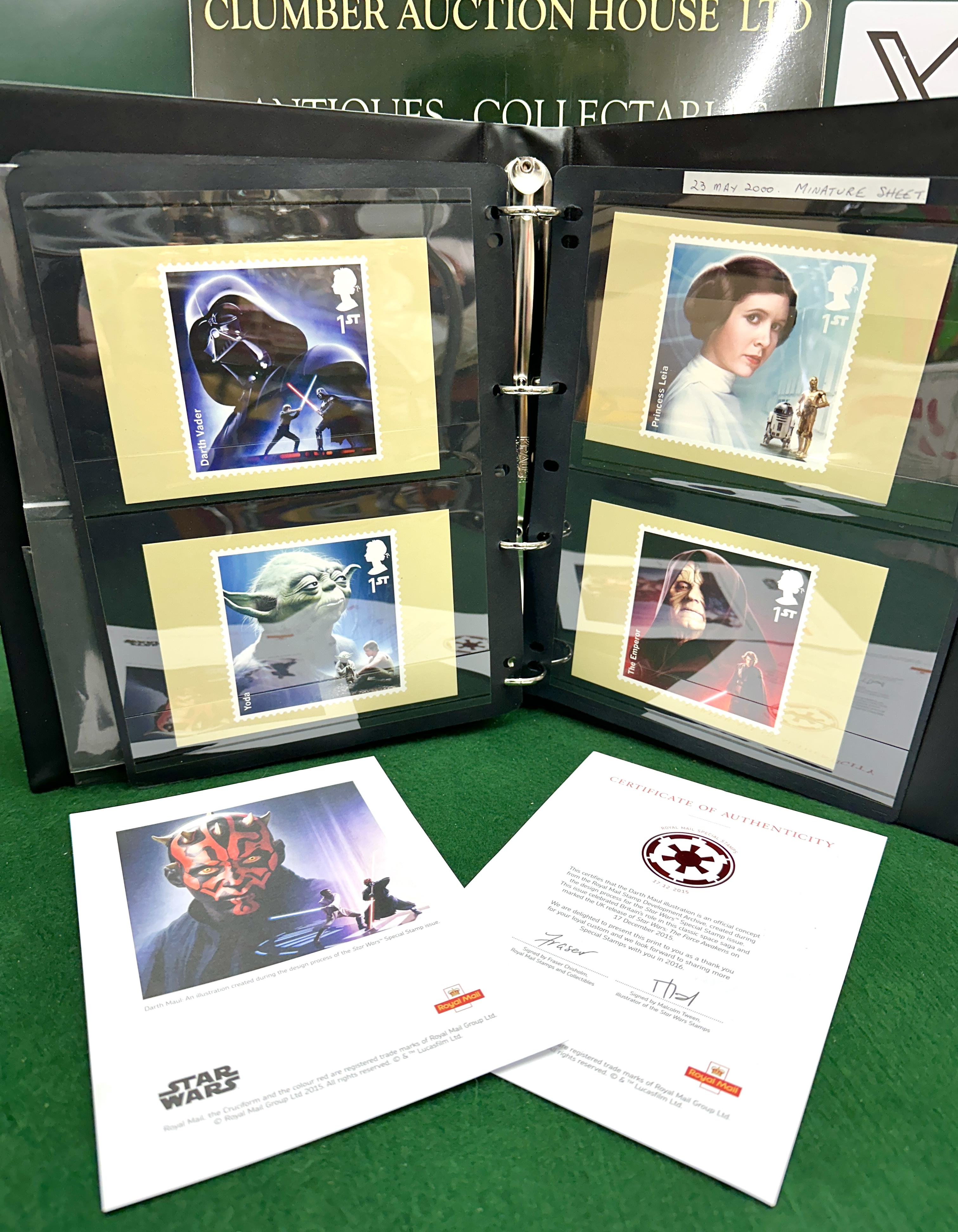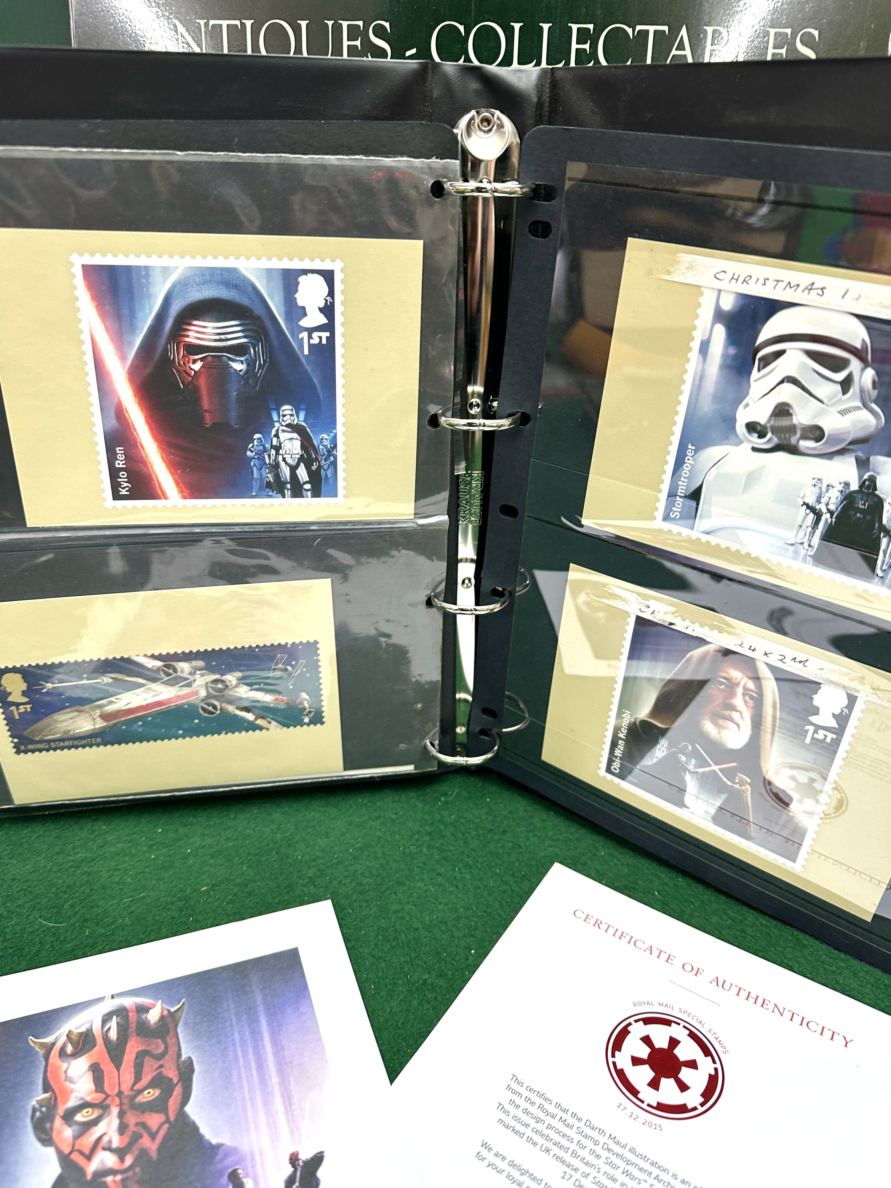 A collection of Royal Mail Star Wars themed postal memorabilia and philatelic items. The collection includes multiple first-class stamps depicting characters and vehicles including Darth Vader, Princess Leia, Yoda, The Emperor, Kylo Ren, a Stormtrooper, Obi-Wan Kenobi, and an X-wing Starfighter. The items are mounted on individual cards within a ring binder, with some cards featuring handwritten notations regarding issue dates and formats. Included is a Darth Maul concept illustration from the Royal Mail Stamp Development Archive, accompanied by a Certificate of Authenticity dated 17 December 2015. The certificate is signed by illustrator Malcolm Tween and Fraser Chisholm of Royal Mail, confirming the illustration was created during the design process for the Star Wars Special Stamp issue.