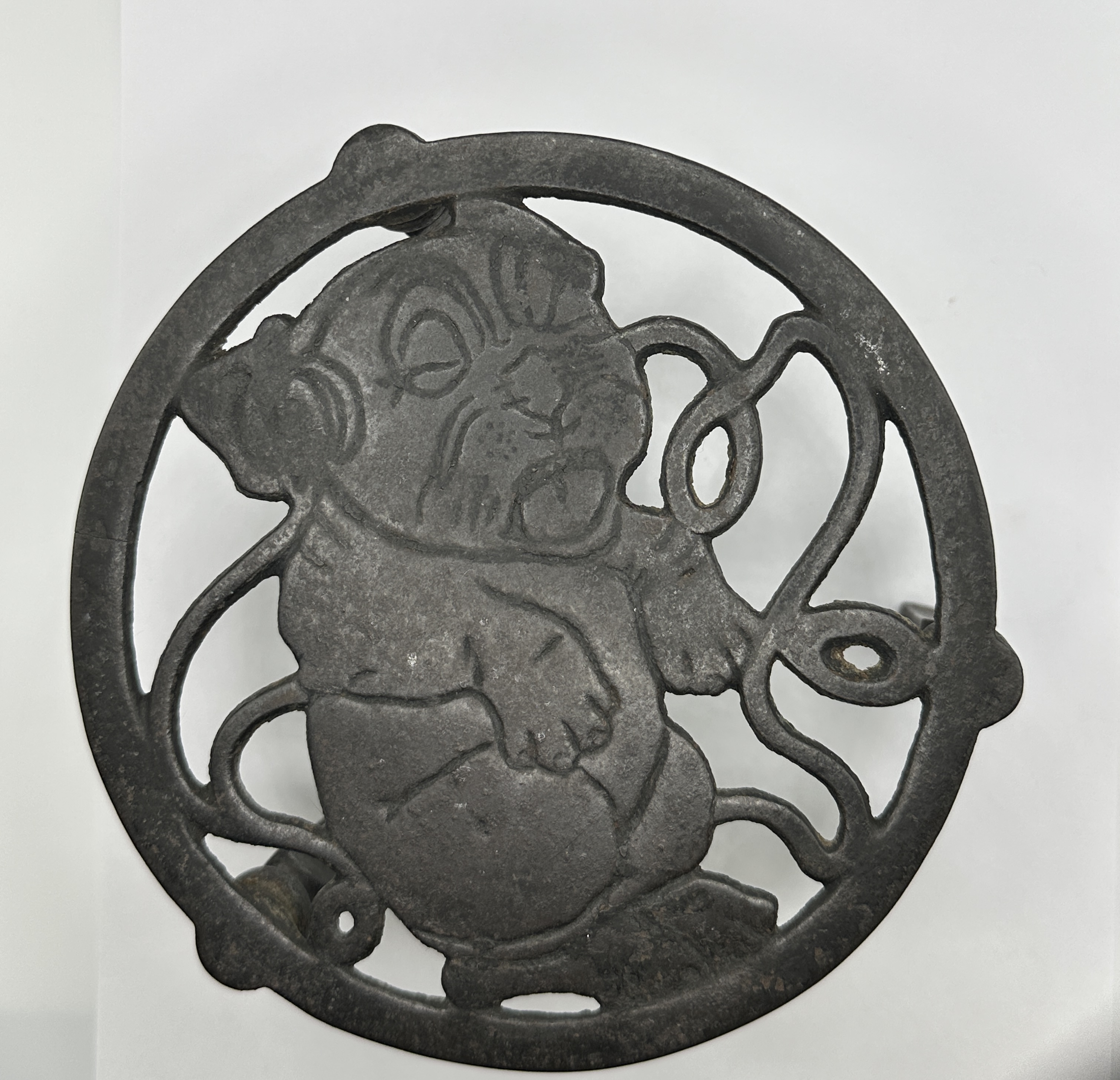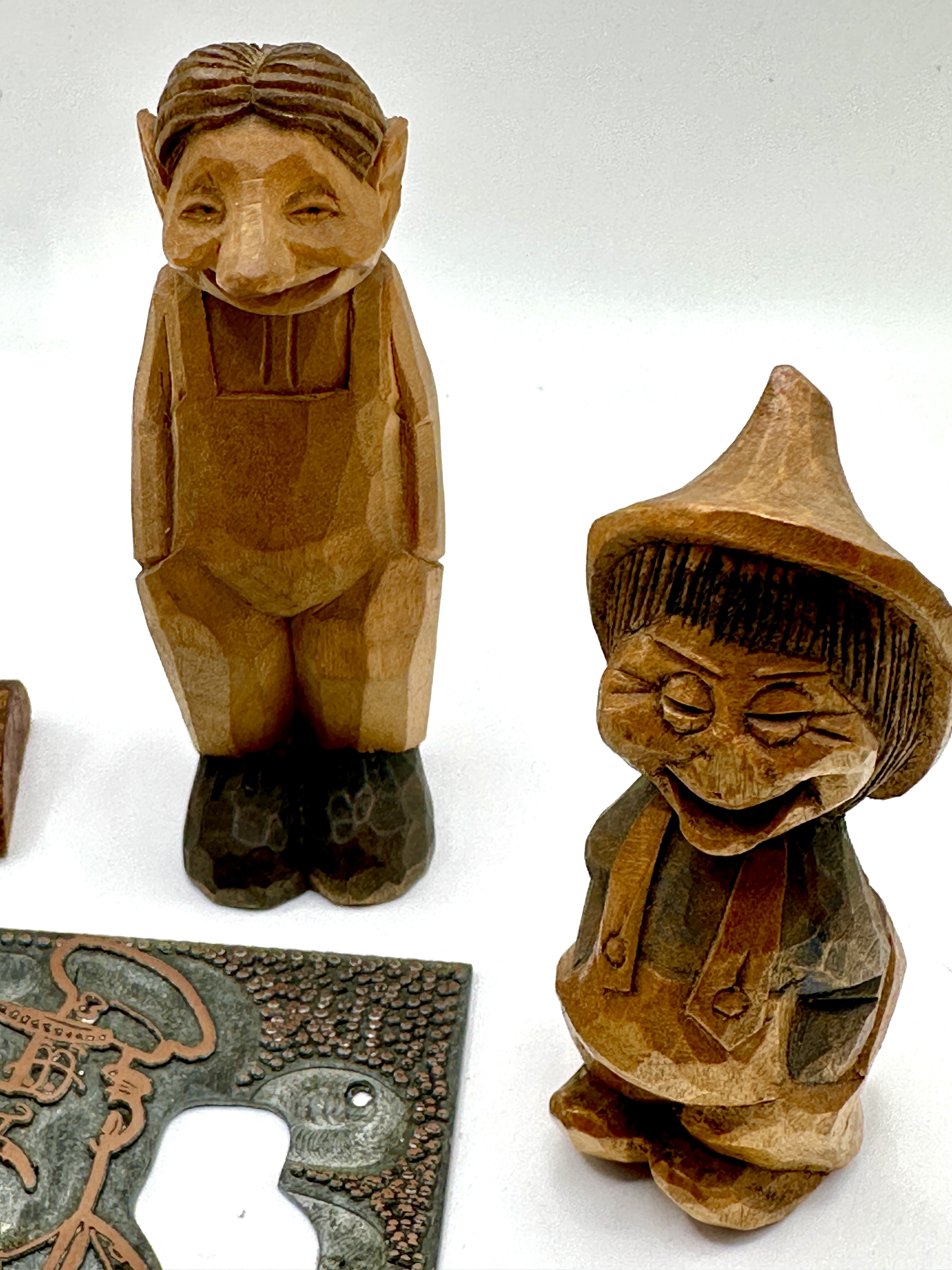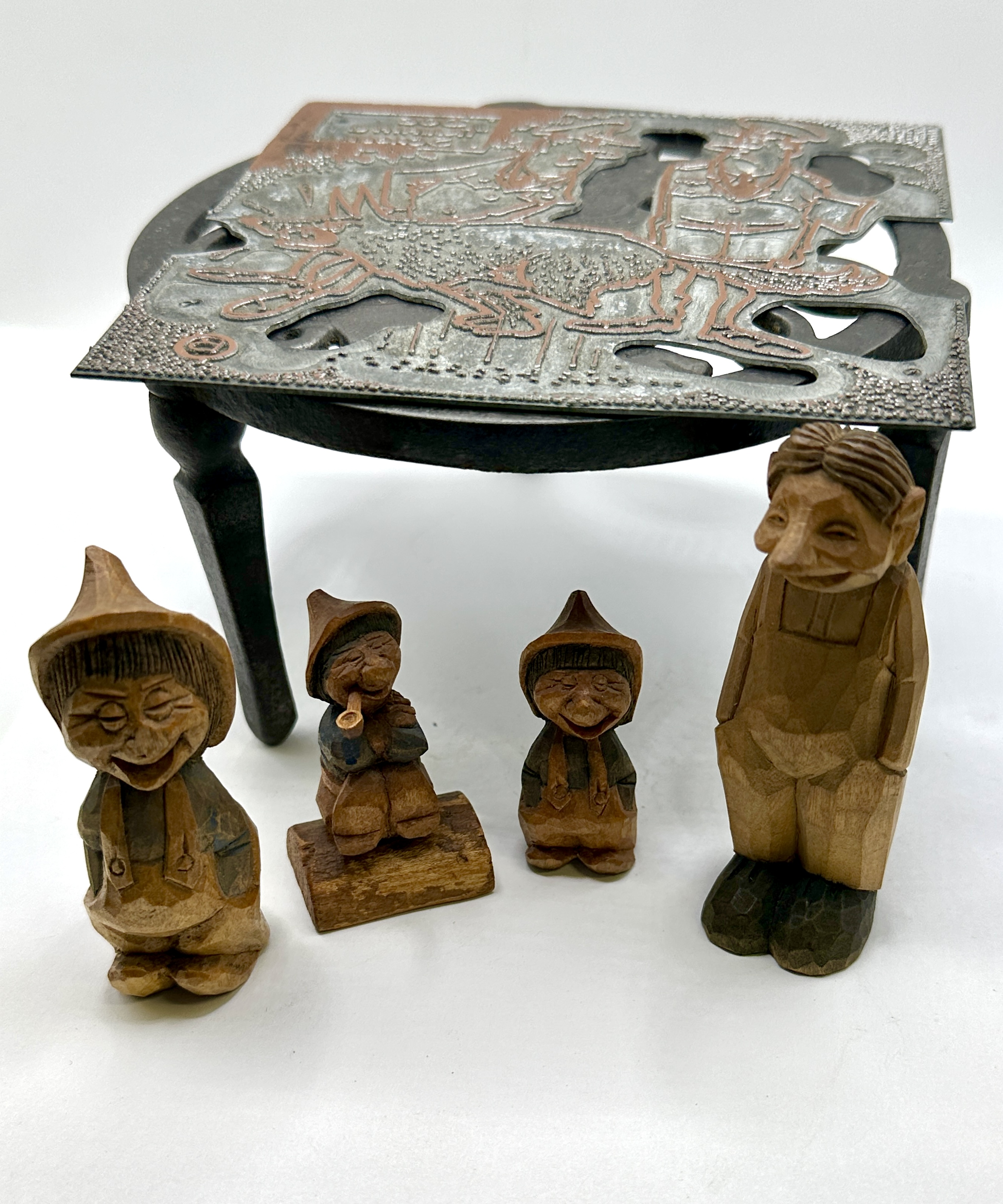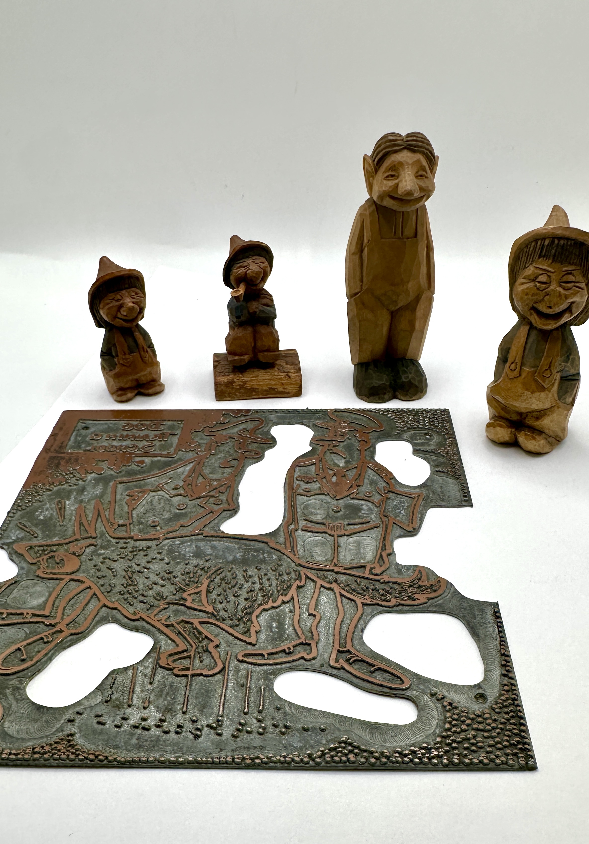 A collection comprising hand-carved wooden figurines, an etched metal letterpress printing plate, and a cast iron trivet. The wooden figurines are executed in a faceted carving style, depicting stylised human and troll-like characters. One figure is incised on the underside with the initials and date G. B. 1955. The metal printing plate features an illustrative scene of a dog and human figures with reversed text reading DOG STORIES About Them. The circular cast iron trivet features a central relief depicting a dog’s head.