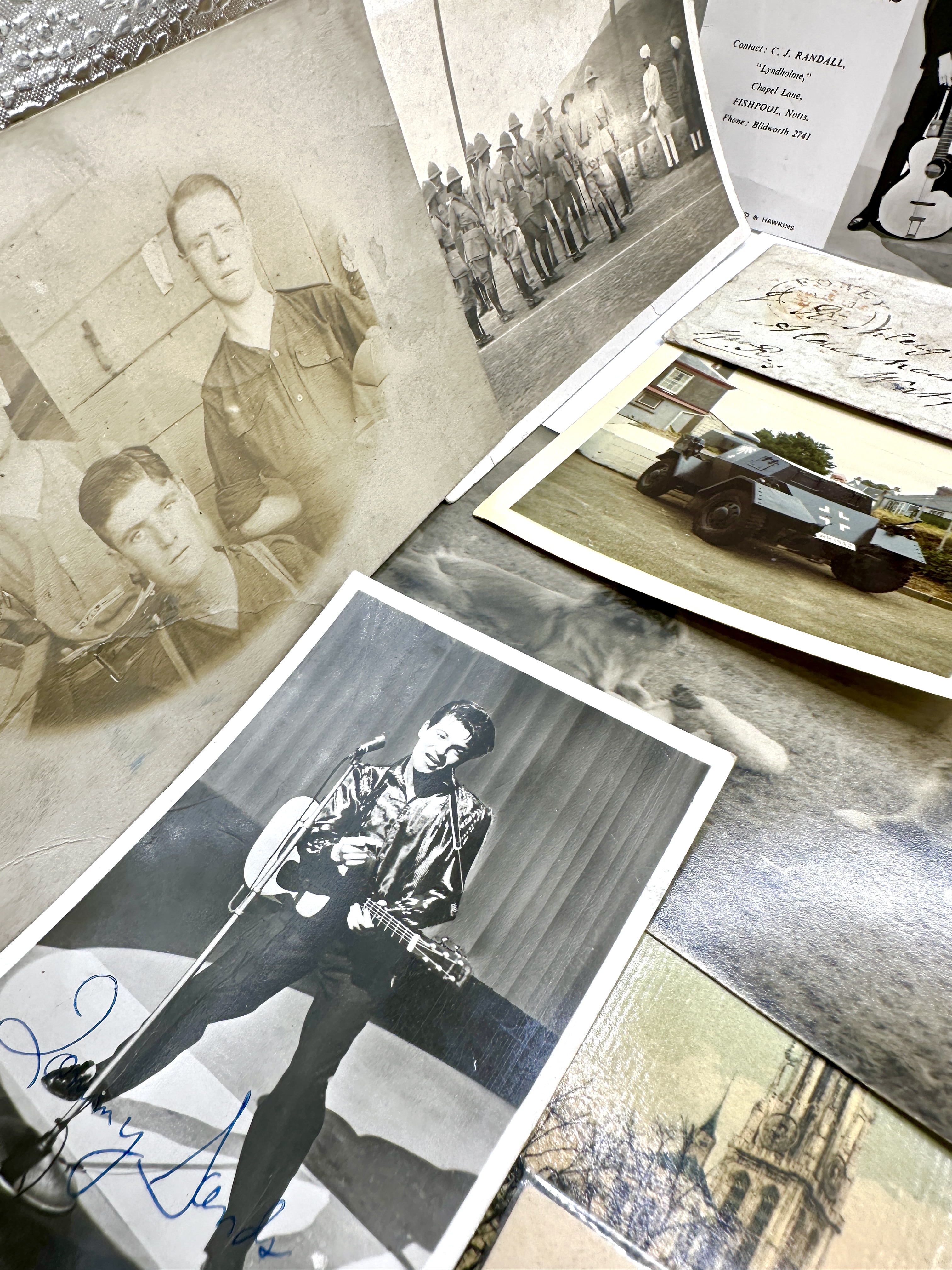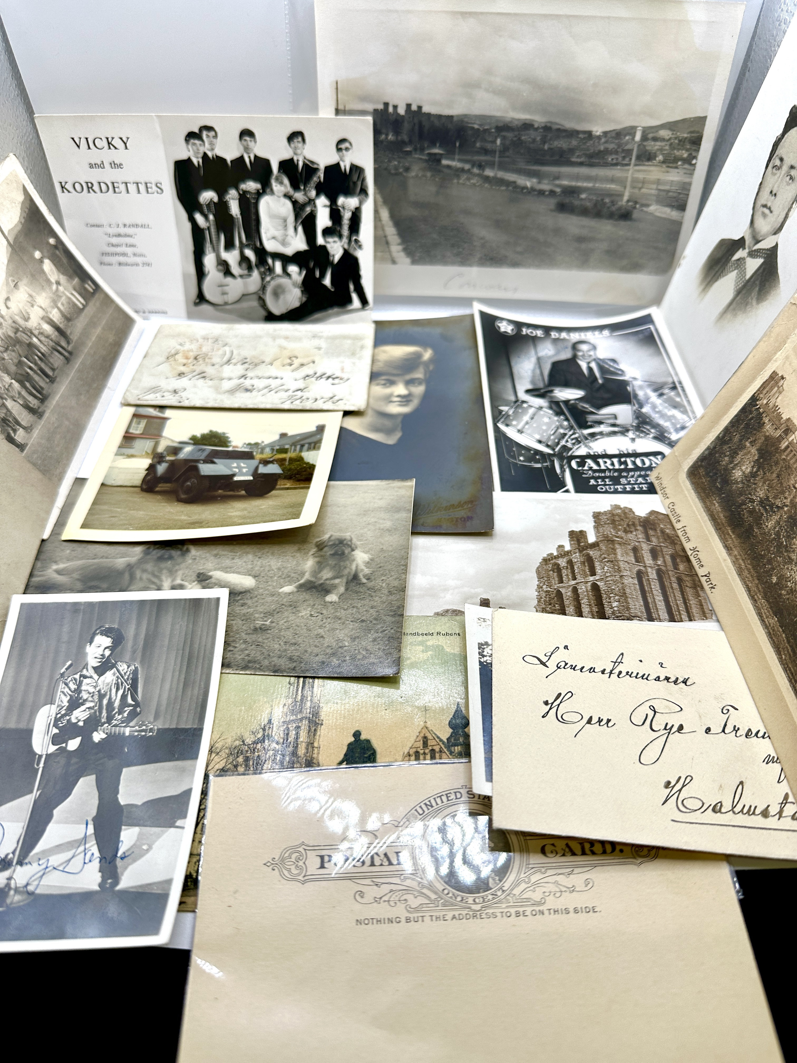 A diverse assortment of ephemera and photography spanning the mid-19th to mid-20th century. The collection includes promotional material for musical acts such as Vicky and the Kordettes and drummer Joe Daniels with his Carlton outfit, alongside a signed performance photograph of a male vocalist. Military interest is represented by photographs of uniformed personnel and a vintage armoured vehicle bearing a German Balkenkreuz. Postal history items include a United States one-cent postal card and a mid-19th-century envelope featuring a red wax seal and a postmark dated 2 August 1847. Topographical prints and postcards feature views of Windsor Castle and the Rubens Statue.
