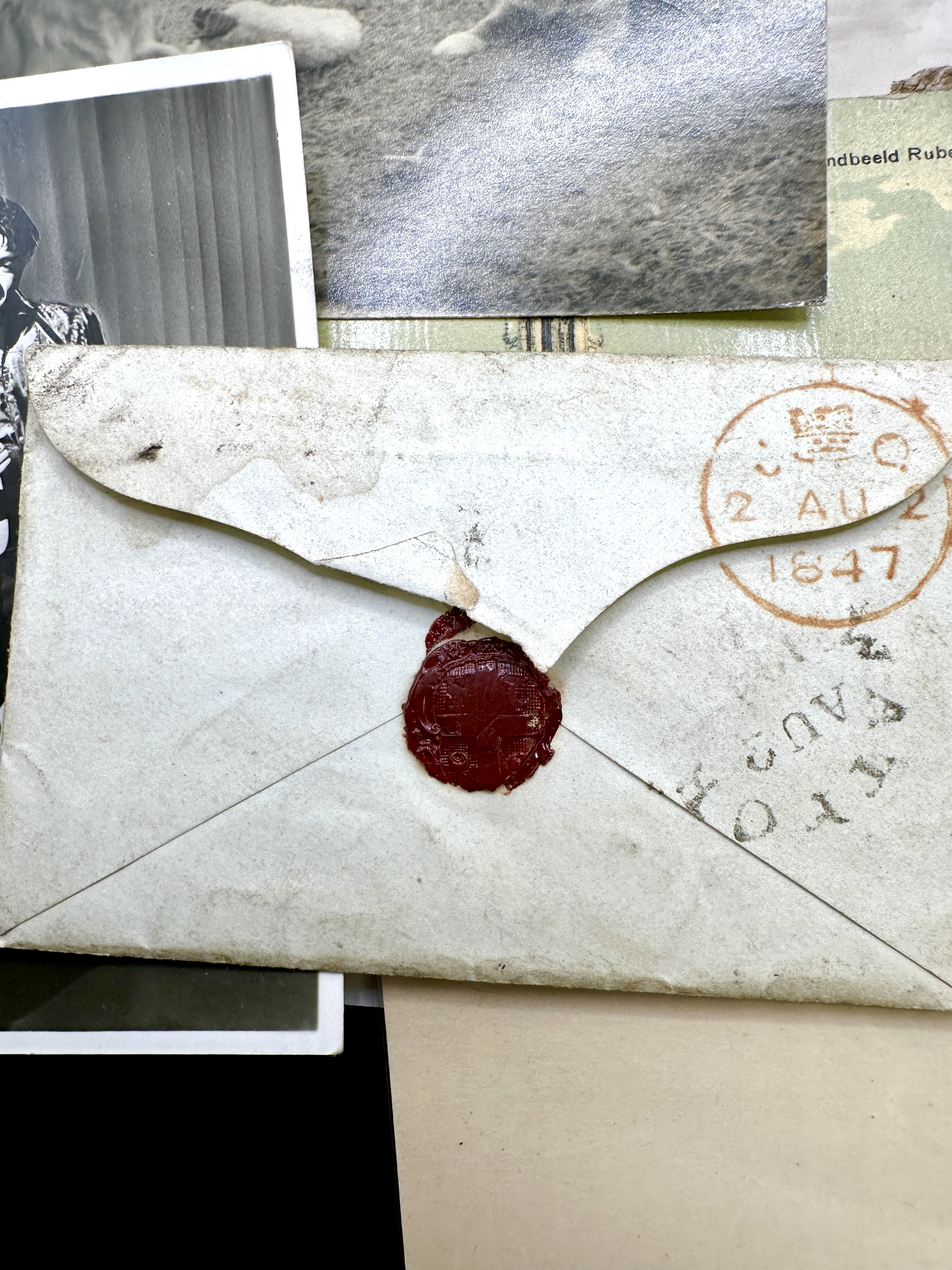 The items are in fair to good condition, exhibiting age-related toning, foxing, and creasing. Minor edge wear and surface marks are present across the collection. The 1847 envelope shows heavier toning and a small tear to the paper near the wax seal.