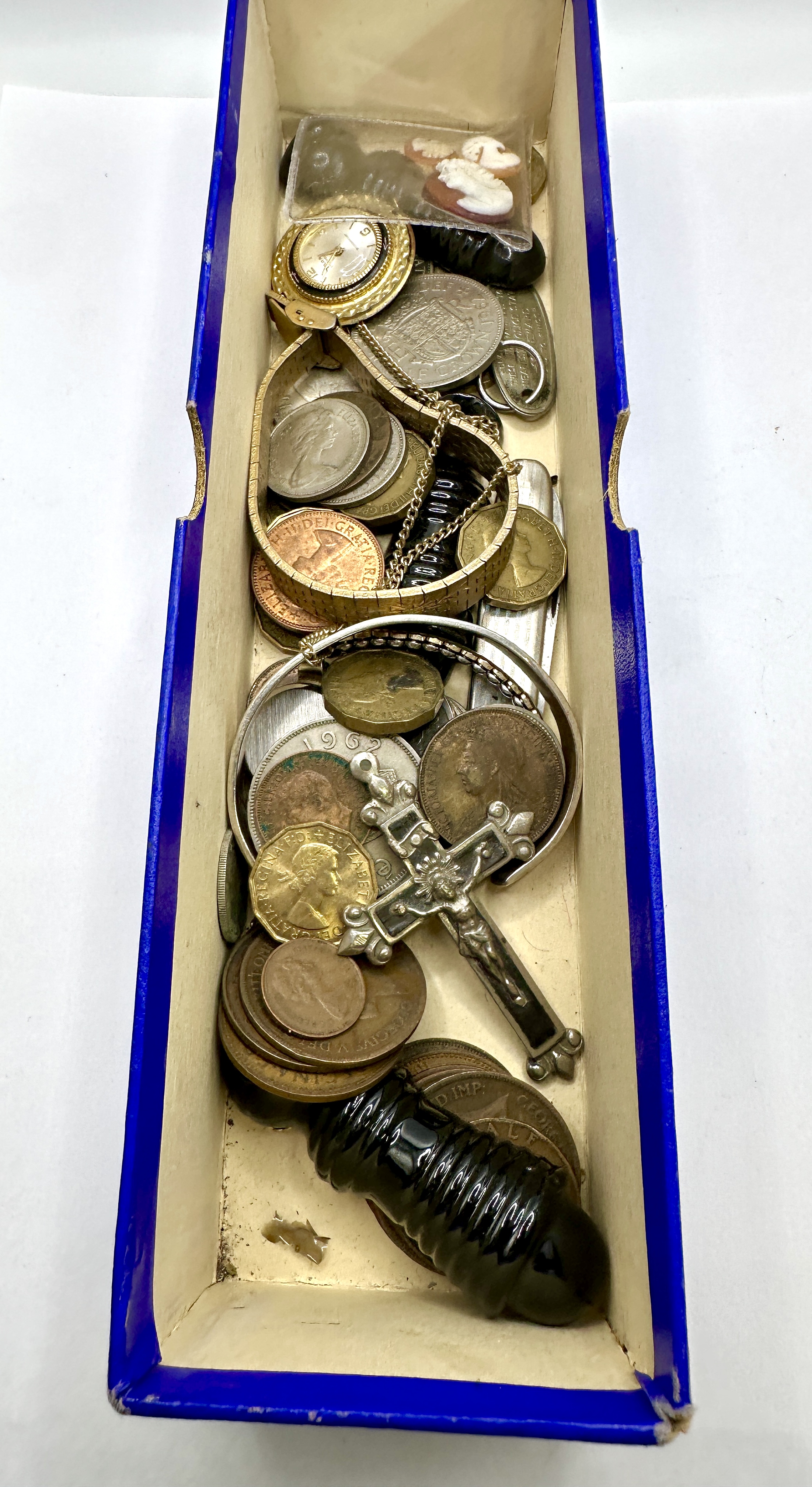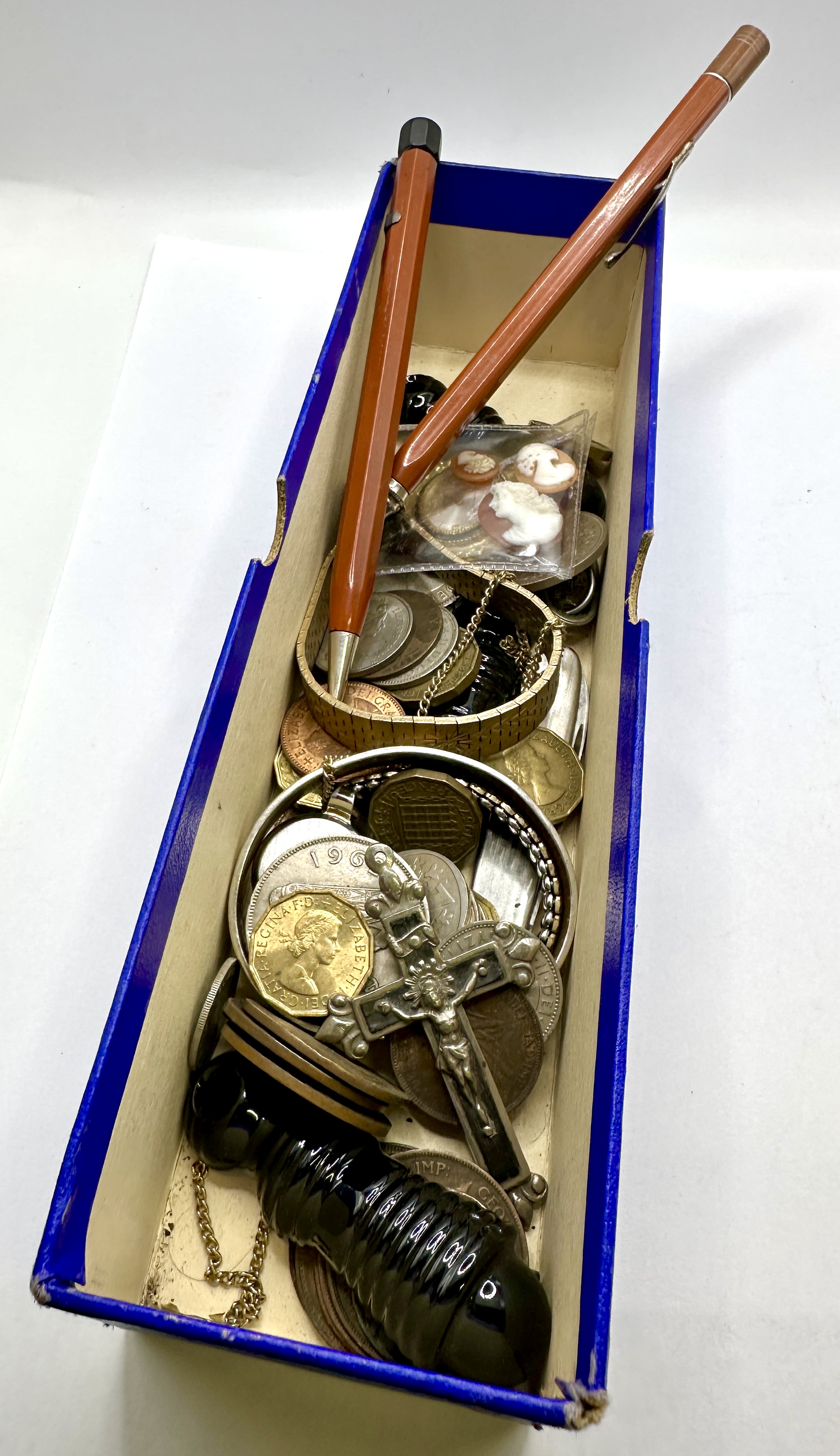 A mixed hoard of vintage and antique collectibles presented in a blue-trimmed rectangular box. The collection includes various British and international coinage featuring profiles of Elizabeth II and George VI, with dates including 1962. Jewellery and personal items comprise a gold-toned ladies wristwatch with a mesh strap, a crucifix pendant, a silver-toned bangle, a gold-toned chain, and several small cameos housed in a plastic sleeve. Additionally, the group contains two orange-bodied mechanical writing implements and a ribbed black glass or plastic handle or insulator.