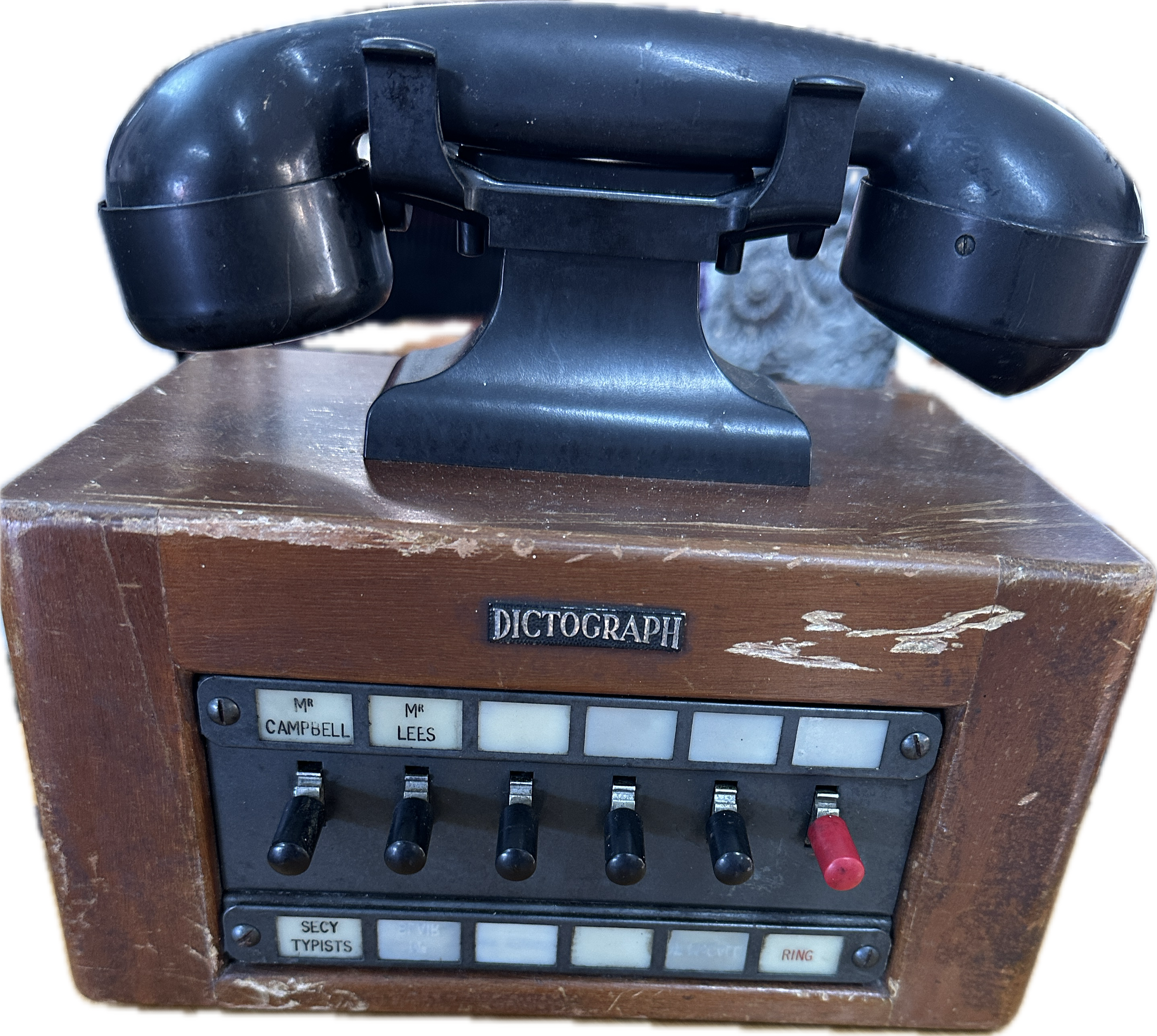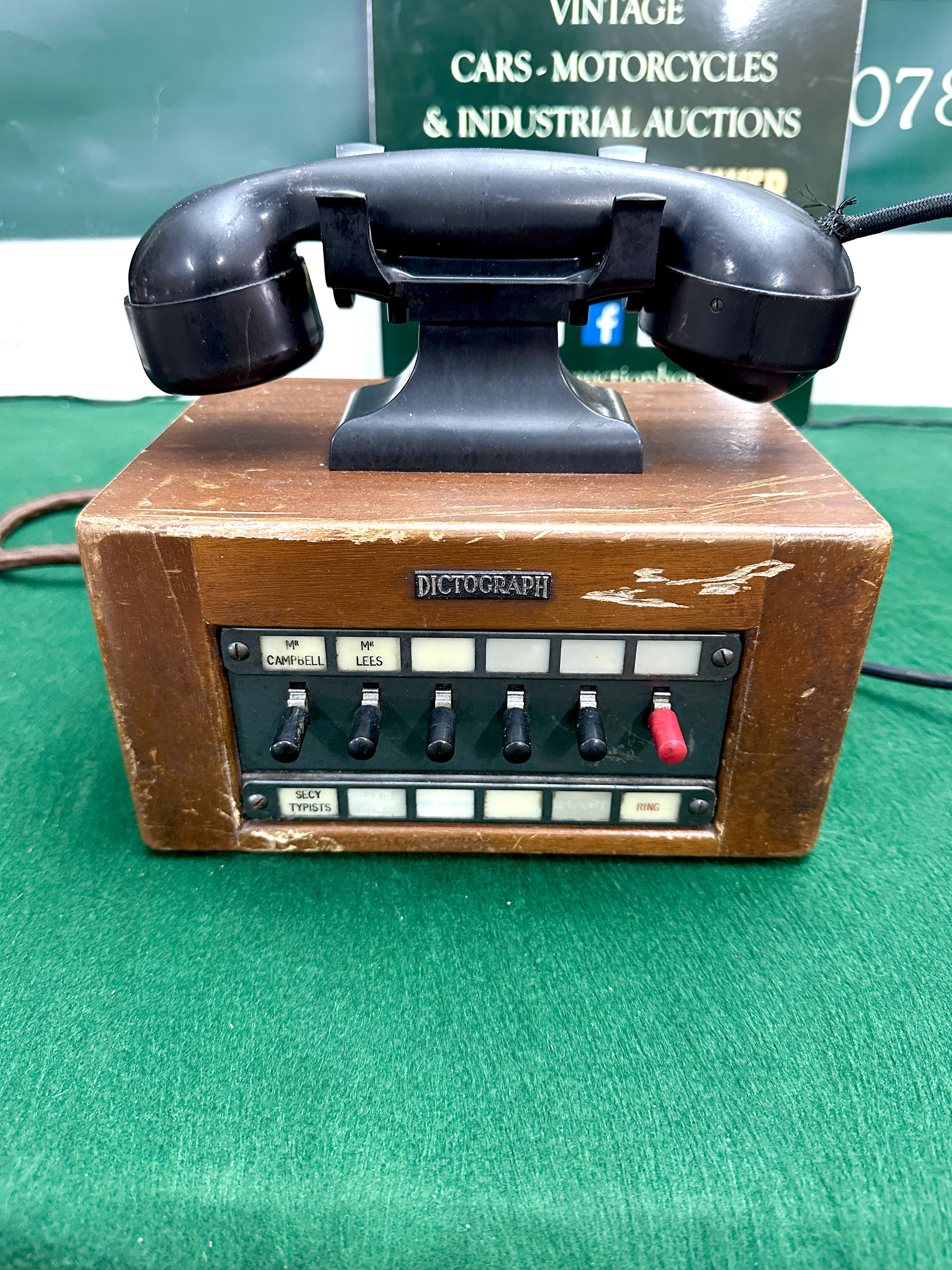 A mid-20th century intercommunication station manufactured by Dictograph. The unit is constructed with a dark-finished wooden cabinet and features a black Bakelite handset resting on a moulded cradle. The front-facing control panel contains six toggle switches, five of which are black and one of which is finished with a red tip. The panel includes two rows of small windows for nameplates, with visible labels for MR CAMPBELL, MR LEES, SECY TYPISTS, and RING. A metal identification plate marked DICTOGRAPH is mounted above the switchgear. The handset is connected to the base via a black fabric-wrapped cord.