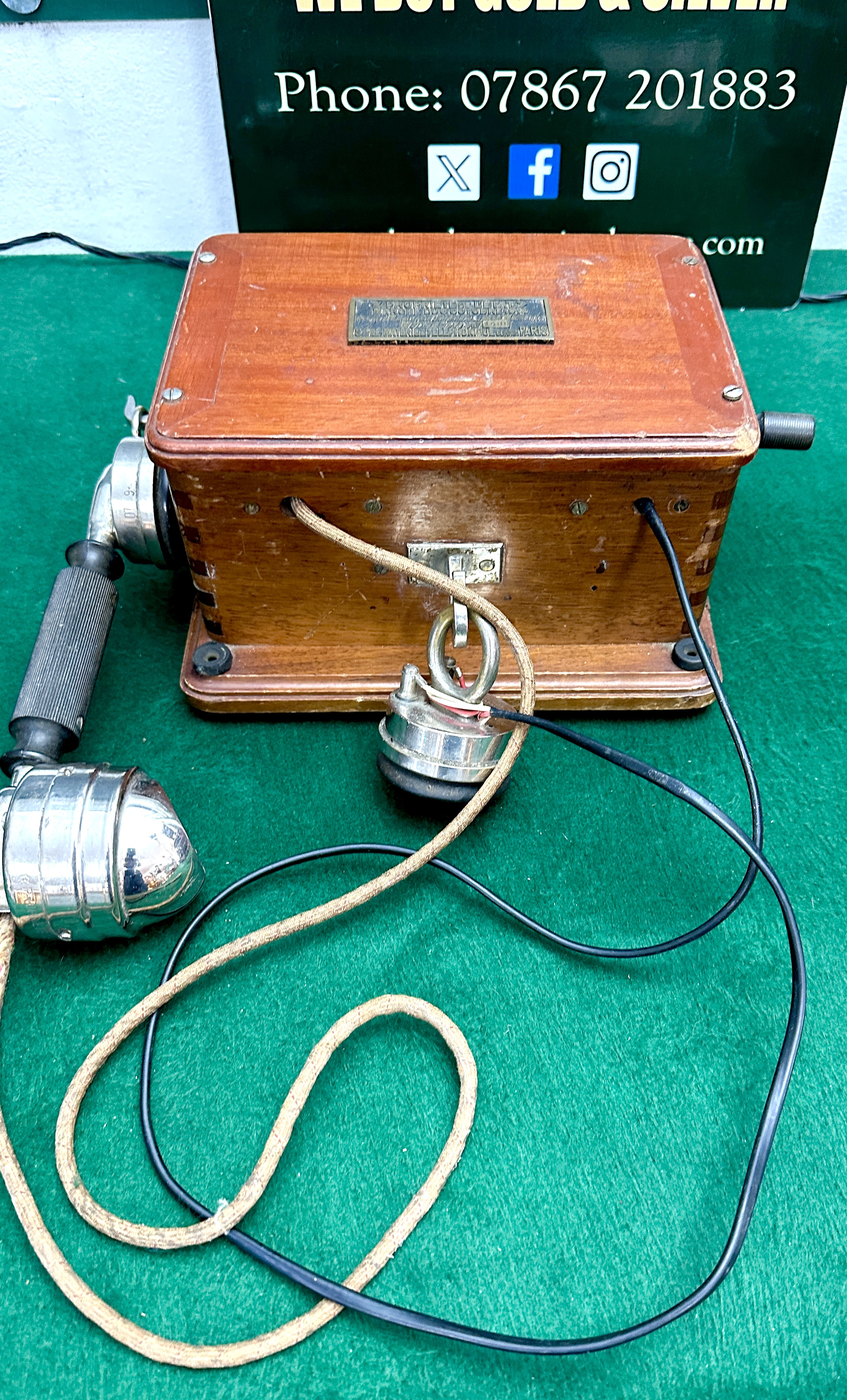 A French wall-mounted magneto telephone, Model 1911, manufactured by Societe Le Materiel Telephonique, Paris. The instrument features a rectangular polished wood case with finger-jointed corners and a side-mounted manual winding crank. A brass identification plaque is fixed to the upper surface, inscribed PROPRIETE DE L ETAT, MARCHE DU 6 OCTOBRE 1914, APPLIQUE MURALE POUR COMBINE AVEC APPEL MAGNETIQUE, MODELE 1911 NO 1489. The apparatus includes a chrome-plated handset with a fluted black handle and a secondary circular metal receiver suspended from a side hook. The components are connected via fabric-bound and rubber-coated wiring.
