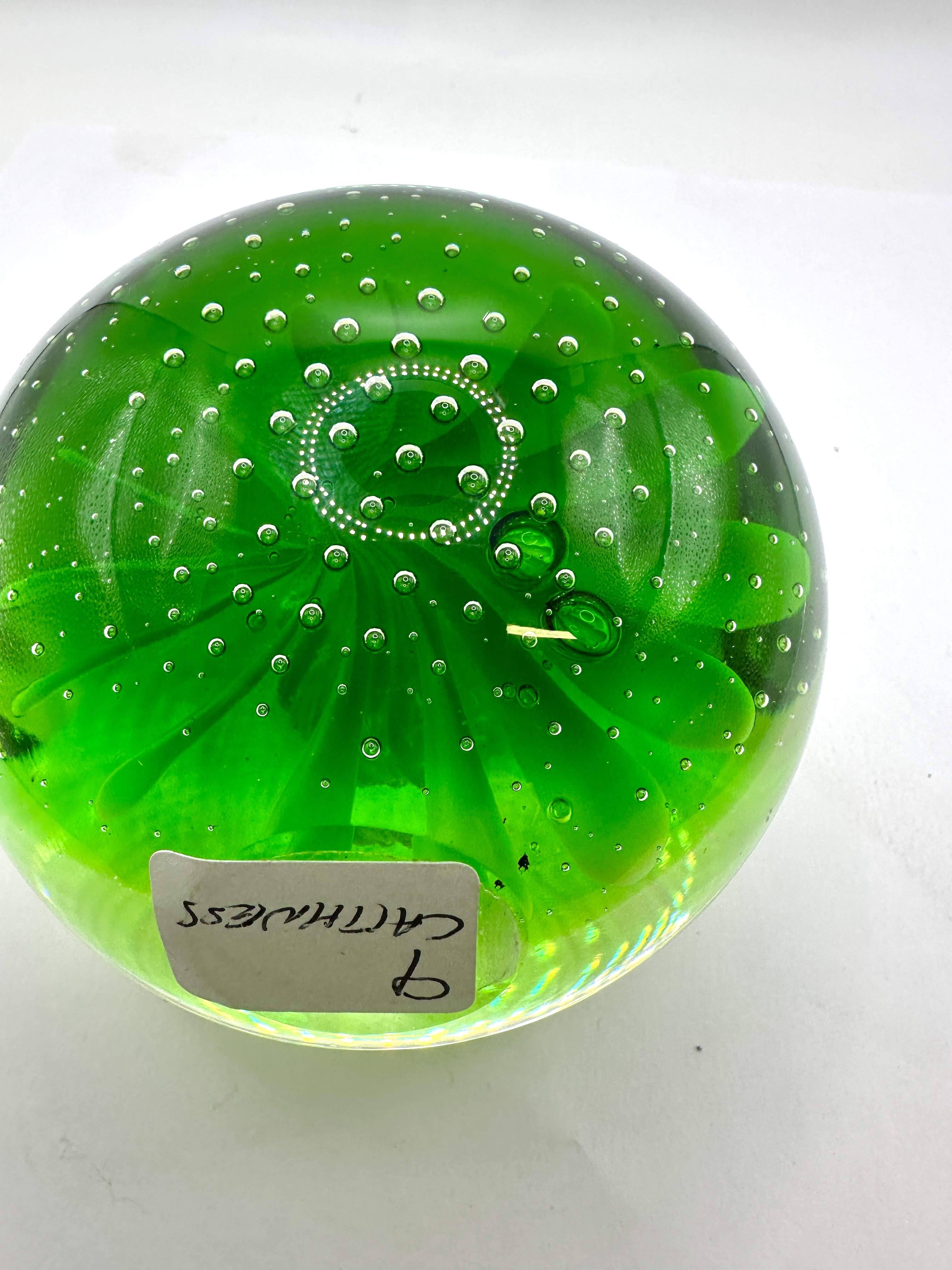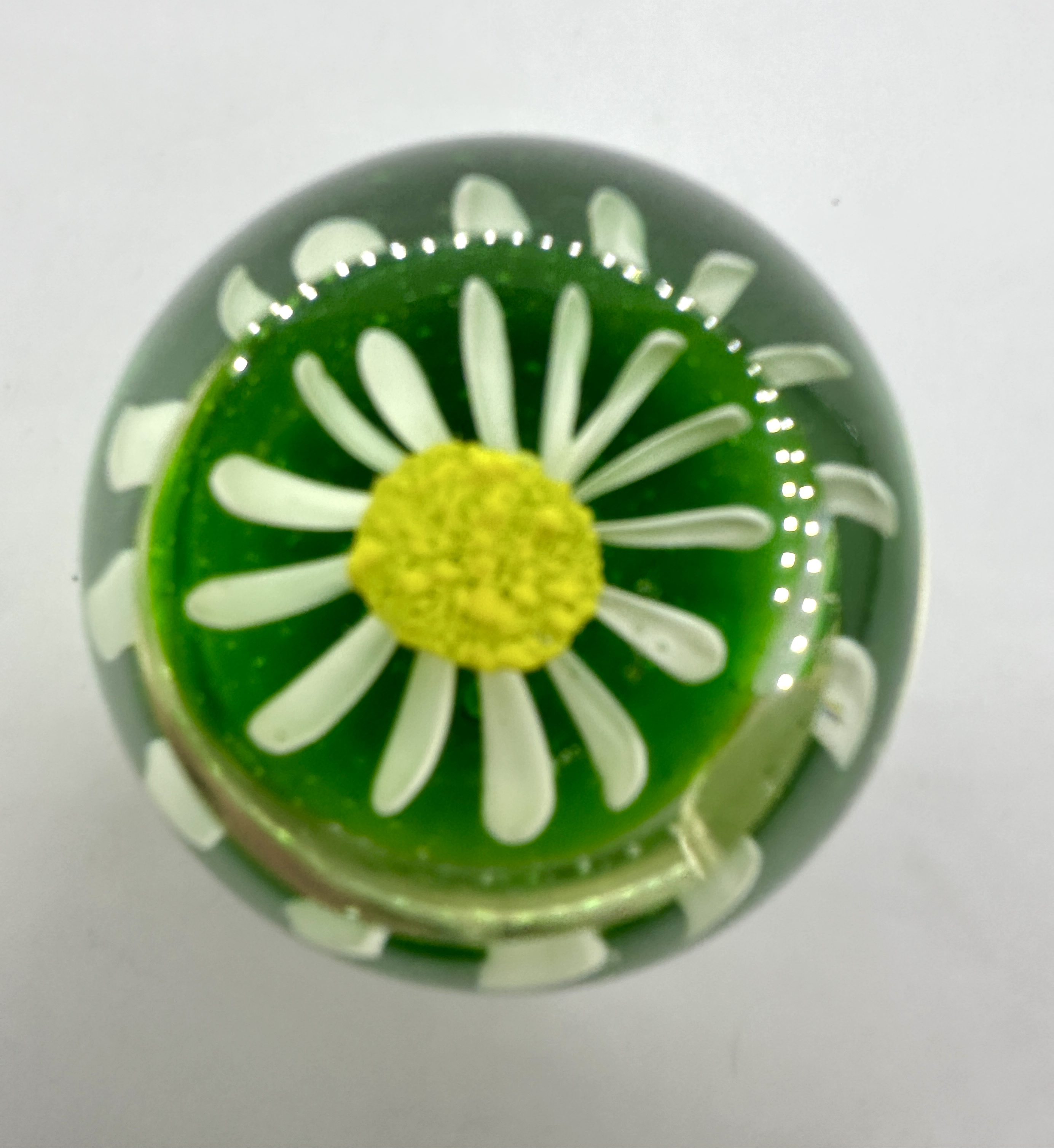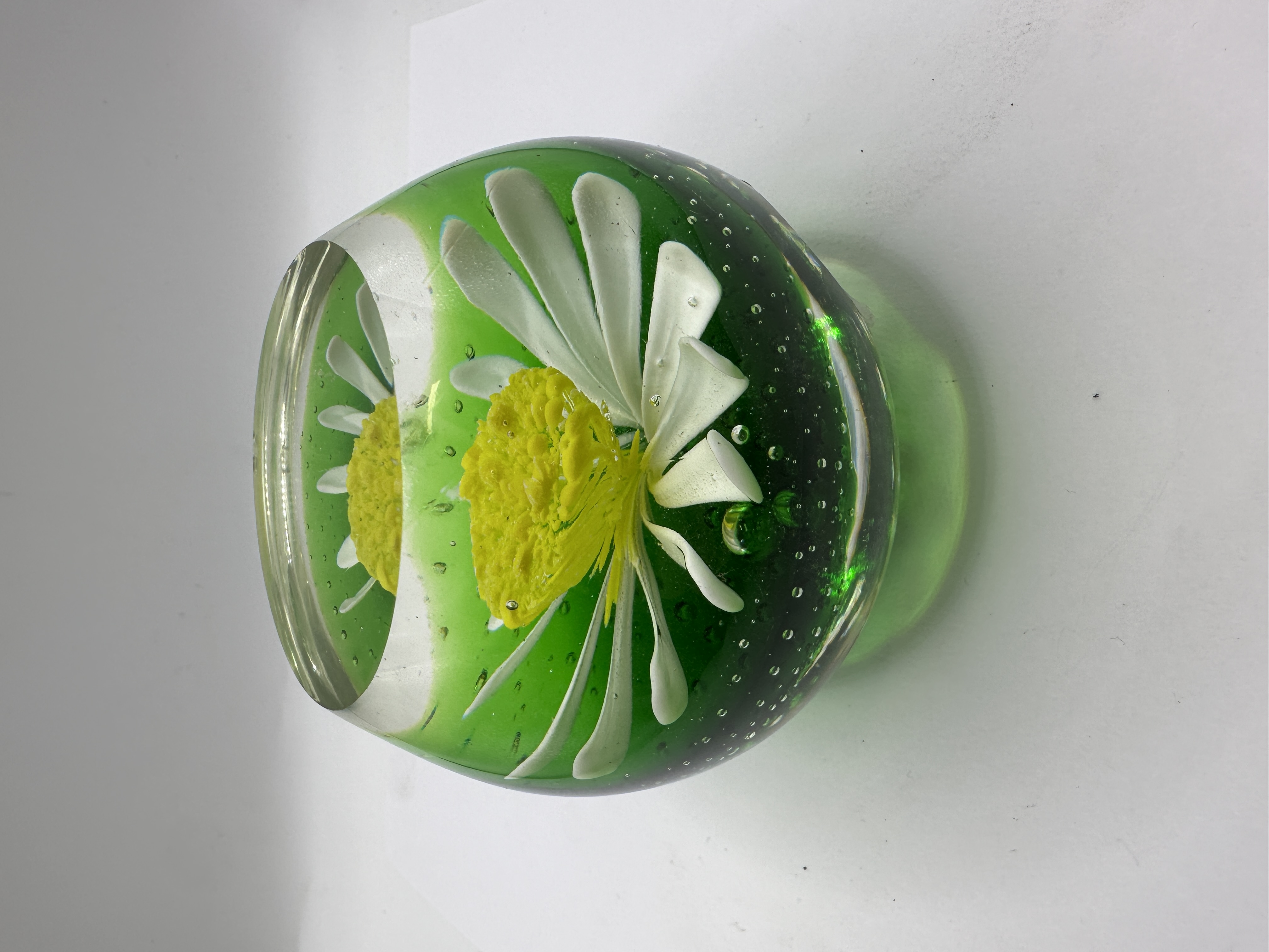 A Caithness art glass paperweight of spherical form. The internal decoration features a single lampwork flower with elongated white petals and a textured yellow centre, set against a transparent green glass ground. The composition is further detailed with numerous small controlled bubble inclusions throughout the green matrix. The piece is finished with a polished flat base. An adhesive label is present on the underside bearing the handwritten name CAITHNESS and an alphanumeric mark.