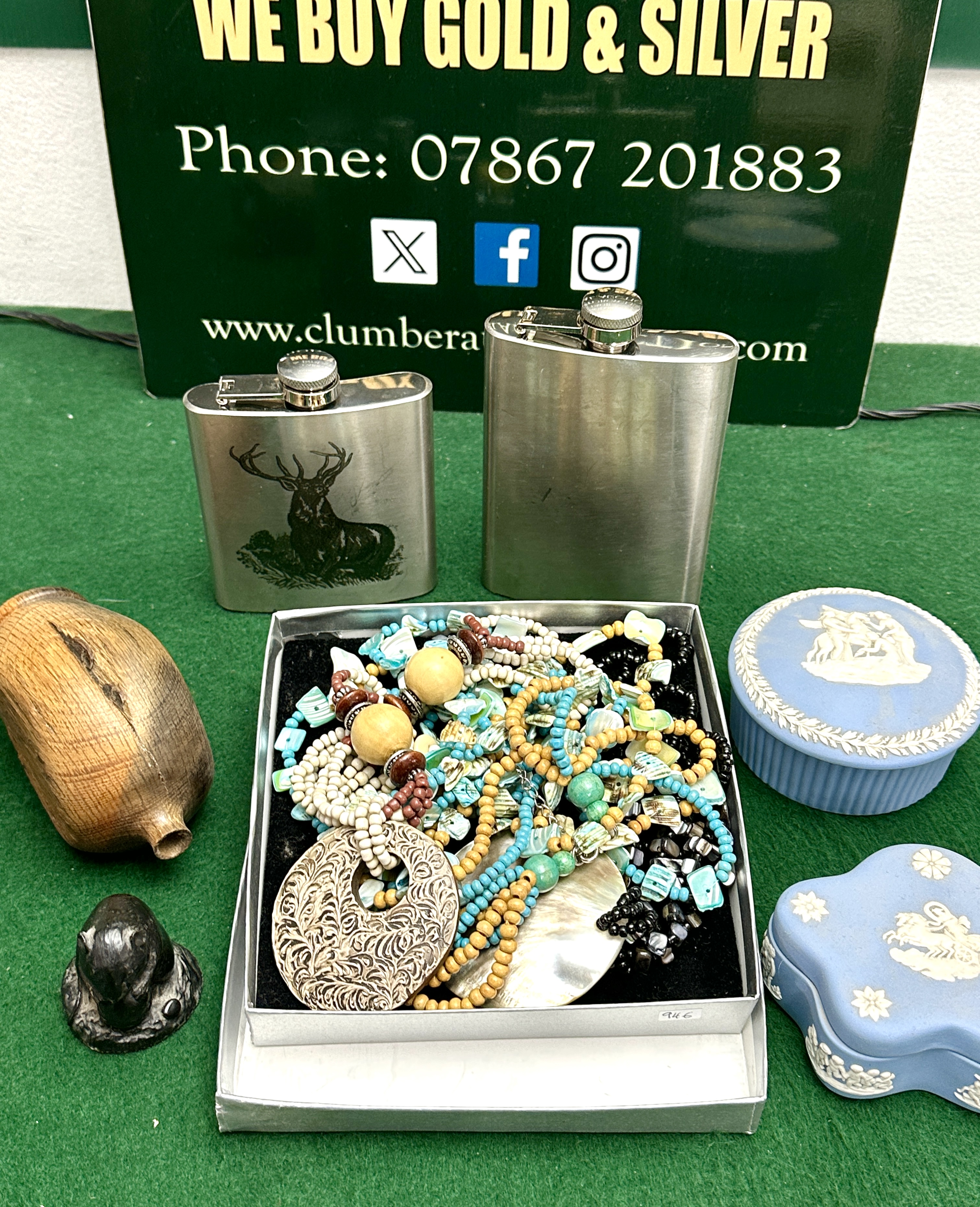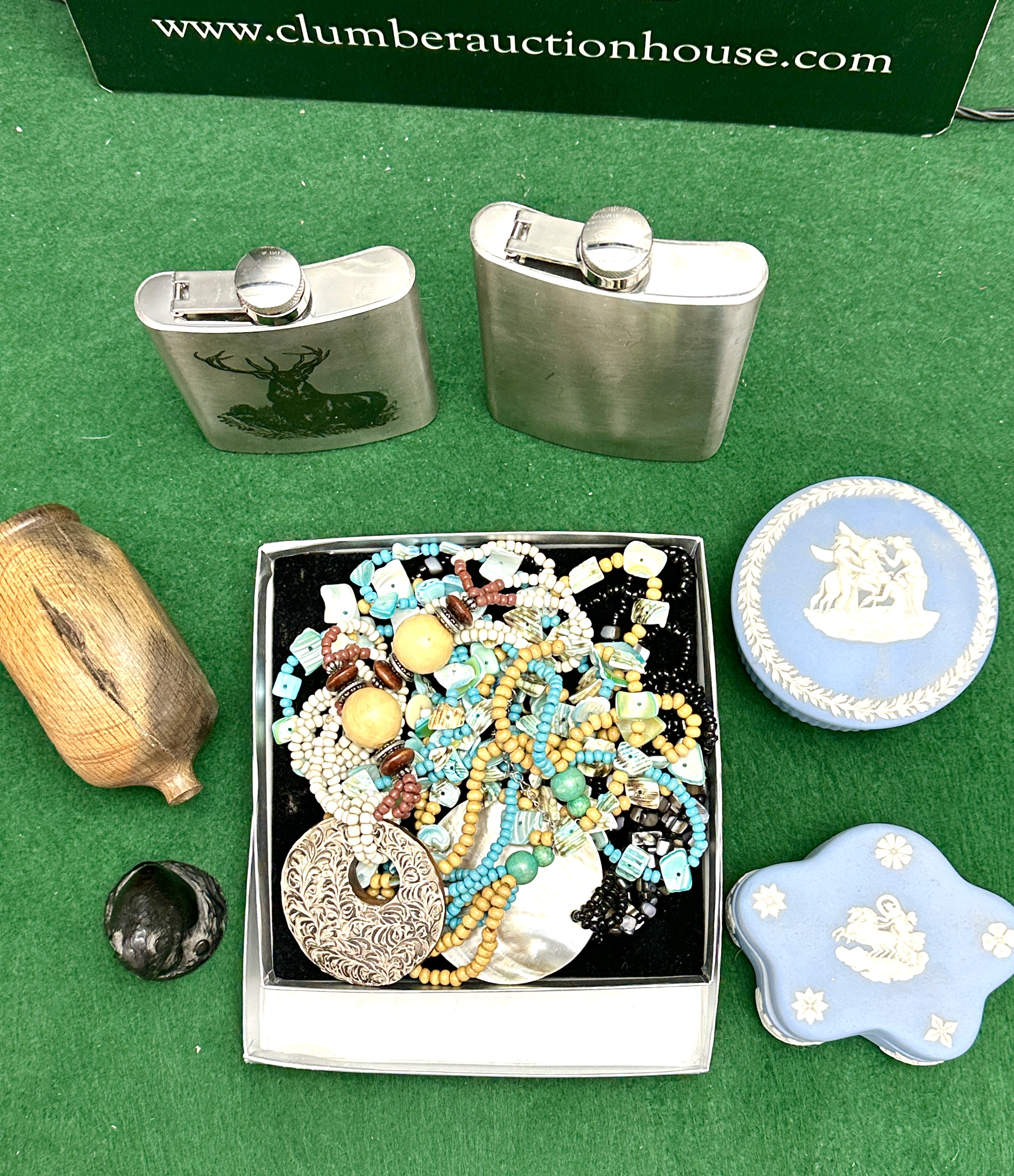 An assortment of decorative and personal items including two stainless steel hip flasks, one featuring an engraved stag motif. The lot contains two blue Jasperware-style ceramic trinket boxes with white neoclassical relief decorations, comprising one circular container with a foliate border and one lobed floral-shaped container. Included is a box containing a collection of costume jewellery, primarily from the 1990s, featuring beaded necklaces, shell elements, and a large circular openwork metal pendant. The group is completed by a small turned wooden vessel and a small dark-coloured figurine of a seated animal.